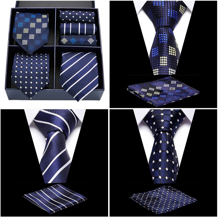 Necktie Gift Set, Great Gift Set contains 3 ties, 3 scarves, blue 4-panel gift box Tie size:146x7.5x3.5cm Scarf size:25x25cm Box size:18x18x7cm Weight:320g