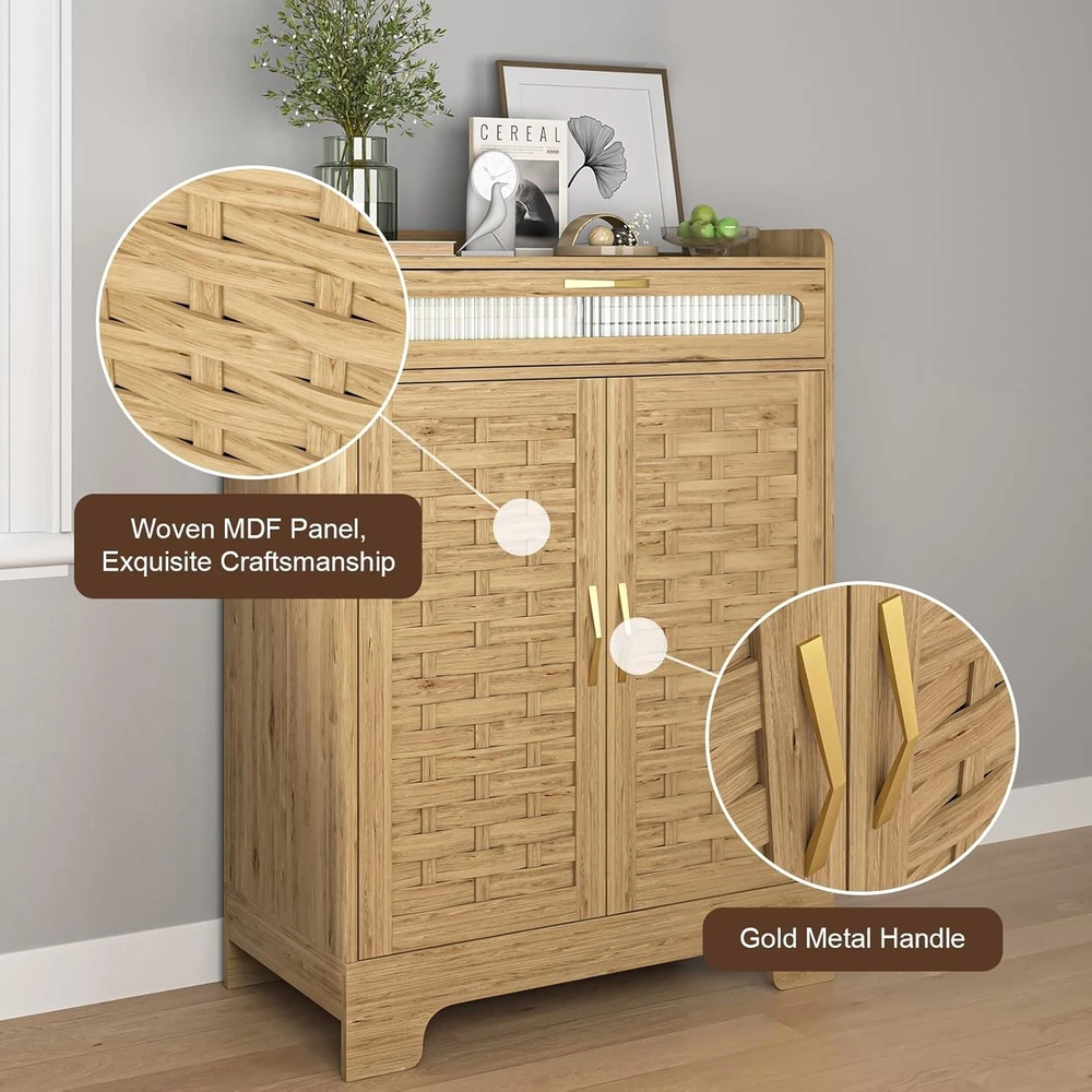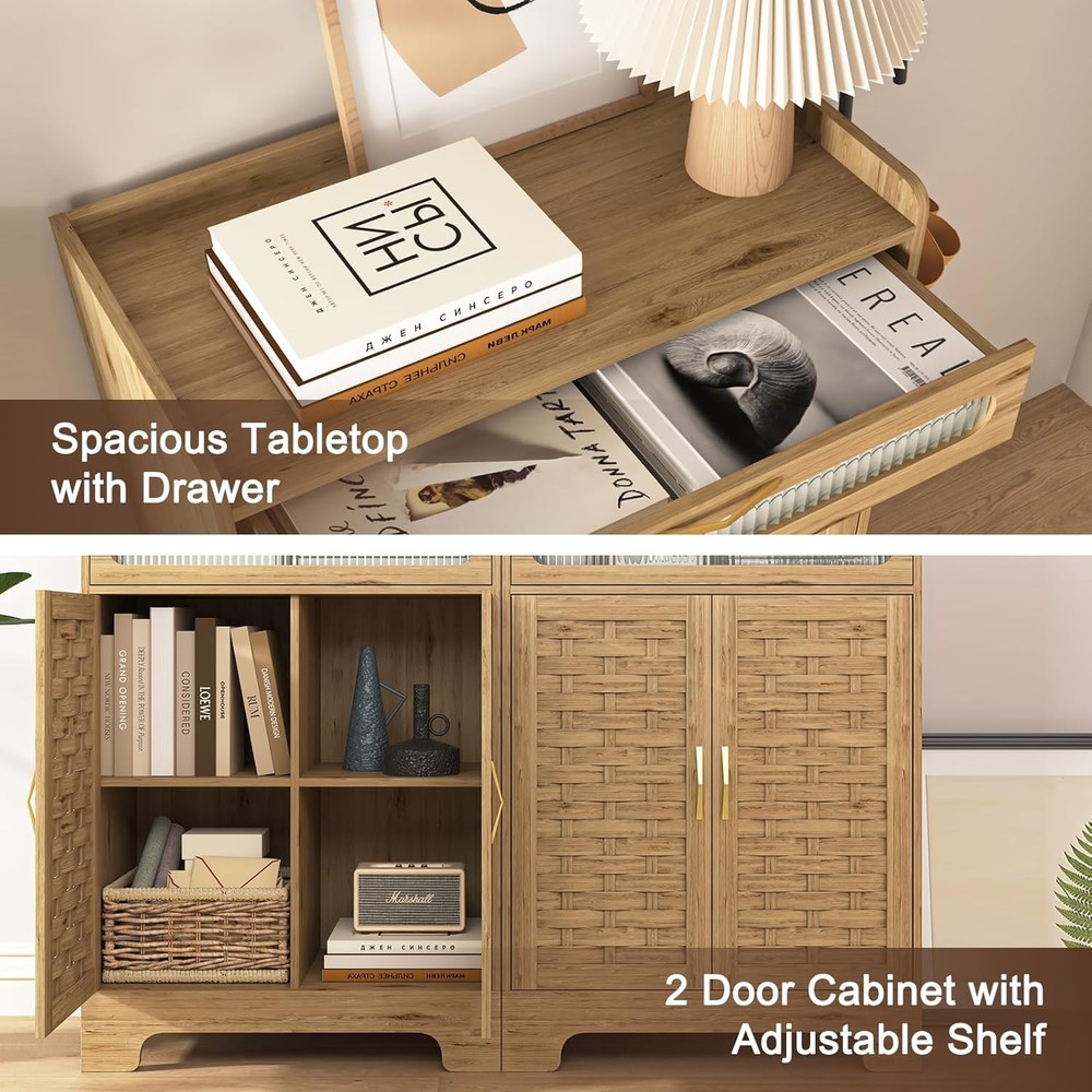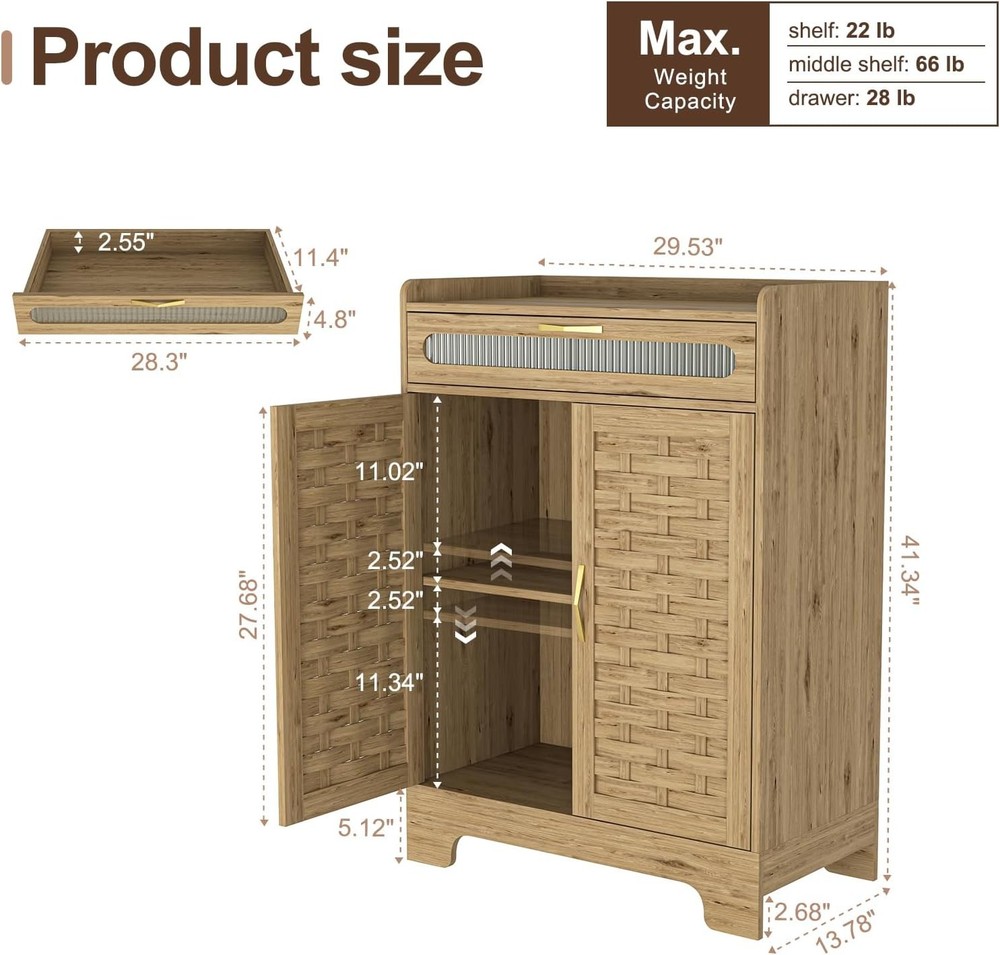 Product Description About this item 【Farmhouse Woven MDF Door Design】 Our kitchen buffet storage cabinet comes with a farmhouse design, and it will easily fit in your kitchen or living room. The unique woven MDF design with exquisite craftsmanship make this cabinet a perfect match for your home decoration.The smoothly sliding drawer and metal handles bring modern and classic for your living space and better integrate into the whole environment, which also makes it easy to assemble. 【Spacious Storage Sideboard】 Our woven MDF kitchen sideboard buffet designed with a drawer and 2 Door Cabinet with interior adjustable height shelf,which can easily meet your different storage needs and also offers great convenience for you to store all kinds of daily necessities. 【Perfectly Size & Multipurpose Use】The accent cabinet with doors measure 13.7"D x 29.5"W x 41.3"H. Weight: 80 lbs. Made of premium MDF and solid wood leg base for sturdiness and stability. 2 tiers zoned storage and a spacious tabletop provide ample storage space, ideal as hallway cabinets, entryway storage cabinets, office storage cabinets, sideboards, small buffet cabinet, floor cabinet 【Practical Home Necessity】The buffet table for kitchen or dining room can be used with confidence. Reliable and harmless material with smooth surface and no peculiar smell. The cabinet also has anti-tip accessories that can be fixed on the wall to provide better protection for your family. This sideboard cabinet is an elegant, attractive and functional piece of decorative furniture that will complement any style of room 【Easy Assembly】Comes with all necessary hardwares and an detailed instruction manual to help quick and effortless setup. If you have any issues, please let us know, we will give solution within 24 hours. On Aug 14, 2025 at 22:39:29 PDT, seller added the following information: