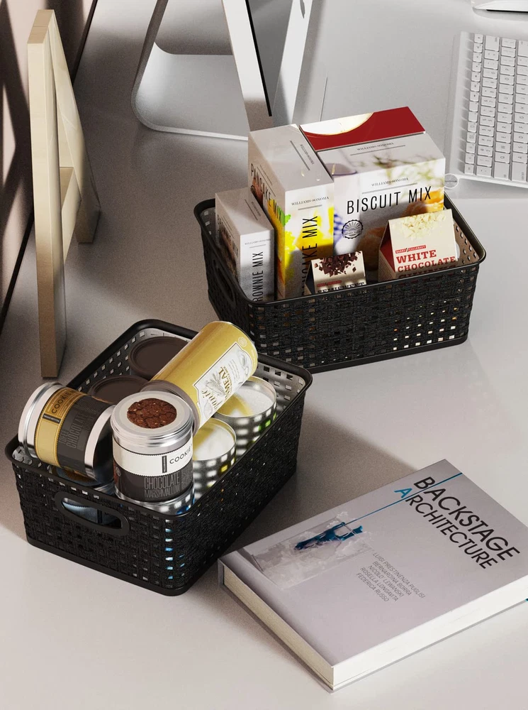 6 pack black plastic organizer basket, weave wicker storage organizer basket, perfect to service for kitchen/ bathroom/ classroom and so on, outside dimensions: 10" length x 7.5" width x 4" height Simplify plastic storage baskets are hassle-free stack able when not in use for maximum space utilization, and its combined tote allow you to move them with ease. Take it wherever you need storage. For convenient storage basket that are built with the sturdiness to give you years of service . The basket durable translucent plastic body with wicker design are built to last from premium materials The polypropylene plastic wicker storage basket are great for clothing, linens, bath and beauty products, magazines, etc. Versatile design and features to organize any space in your home, dorm room or office We adhere to the best product delivery and the most uncompromising quality. The trust placed by our discerning customers earned over the years. Fulfillment of our customer's need are core of our vision.