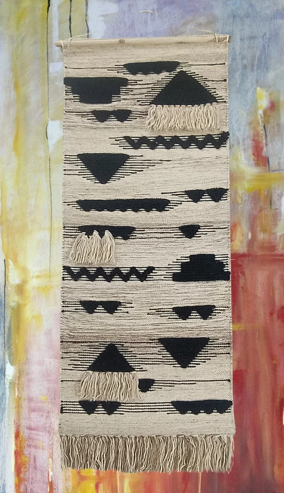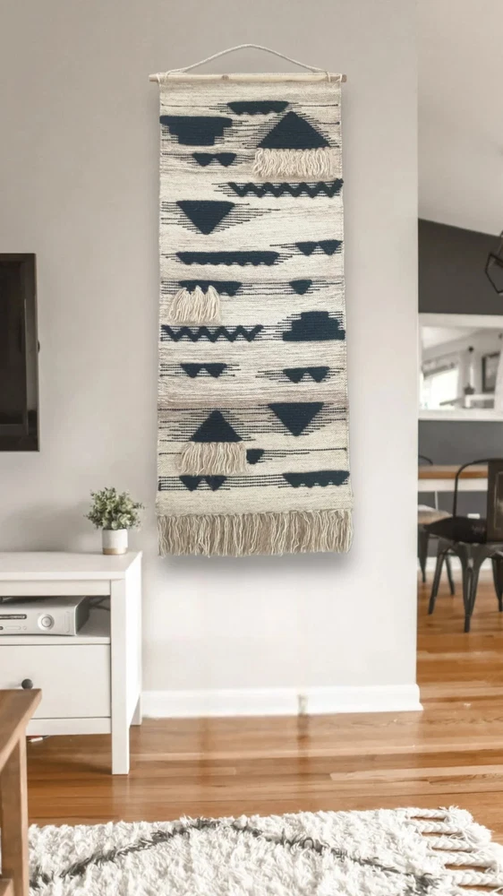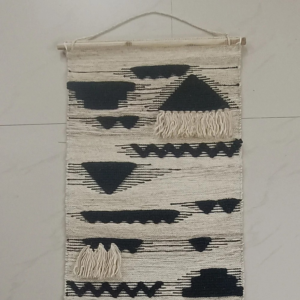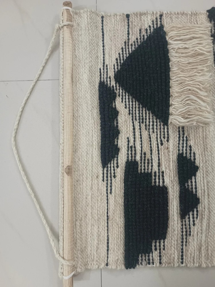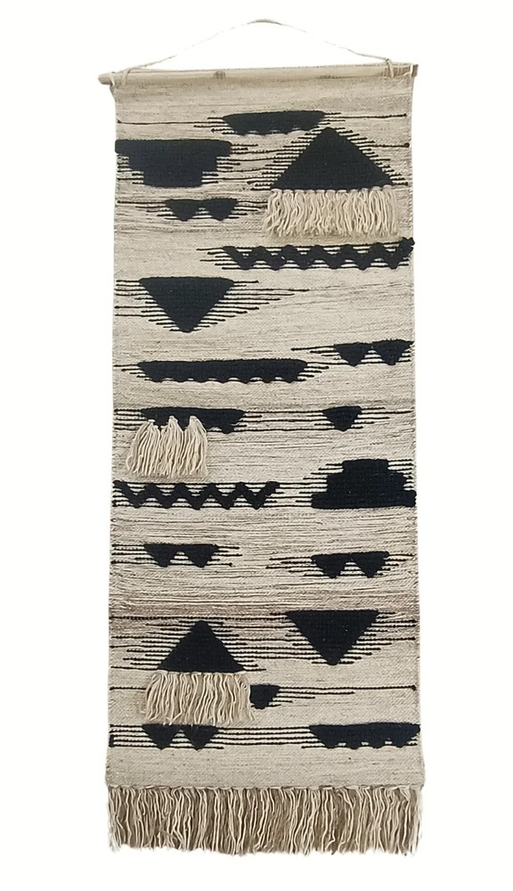 Read the full descriptioPPron Product Details Materials: Wool, Cotton, Jute, Handmade, Wooden Dowel, finished product Width: 21.5 inches Height: 55 inches The modern black & white abstract hand-woven tapestry looks best to decorate your living in Bohemian style . This large size tapestry is made of best quality yarn, soft wool and cotton which is centered on a wooden dowel for durability and finished with a cord for hanging. looks best for modern living with vintage touch , Boho living room and minimalist home decor. Sizes: 21.5 inches Width * 55 inches Height with 7.5 inches high hanging rope (please contact us directly if you need alteration in size, we can customize it as per your need) Colors: natural shades of beige, black and off white Care: The fringes can be carefully combed with your fingers or broad hair comb to get free from entangled Usage: This Hand-woven wall tapestry will be a perfect match for your bedroom, Boho living room, entryway, nursery, Dining Decor, Headboard or Handmade Gifts to your loved ones