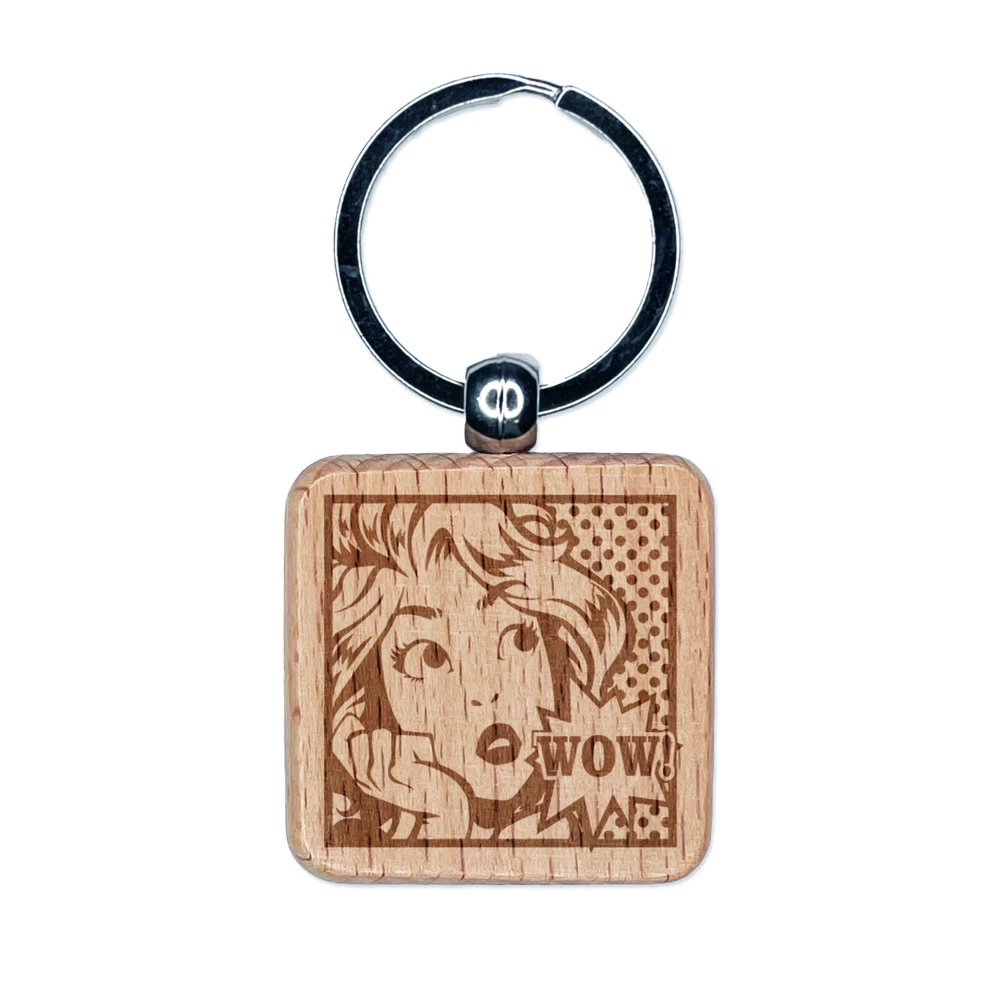 Wow Vintage Comic Pop Art Engraved Wood Square Keychain Tag Charm