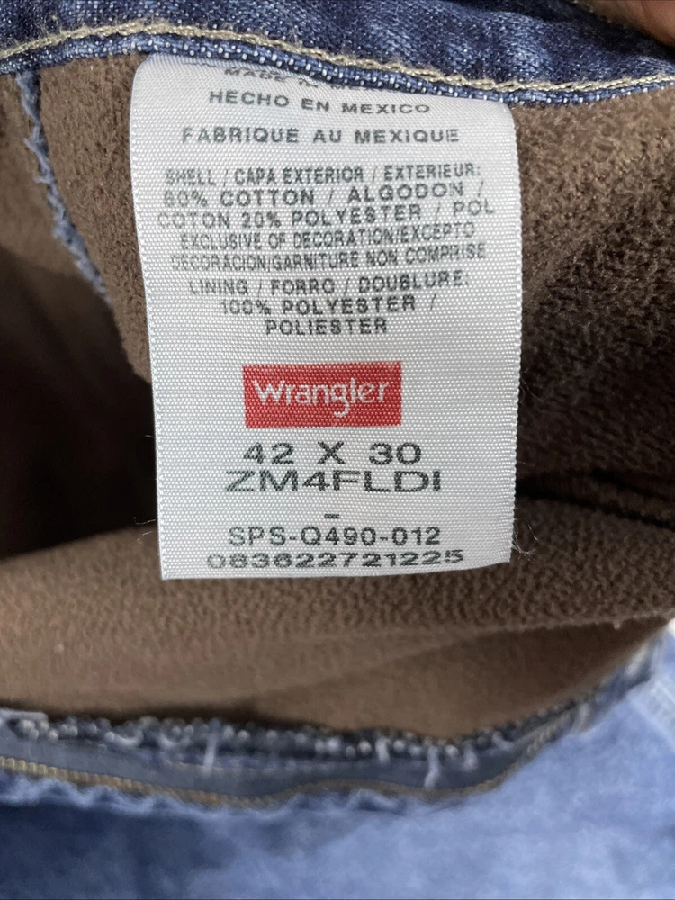 Garment Care: Machine Washable Pattern: Solid Type: Jeans Closure: Zip Color: Blue Department: Men Fit: Regular Fabric Type: Fleece Seller Notes: “Tag size is: 42 x 30 Actual measures are: ~41 x 29.5” Size Type: Regular Material: Cotton Blend Style: Straight Size: 41 Inseam: 29.5 Suspender Buttons/Belt Loops: Belt Loops Features: Lined Brand: Wrangler Season: Fall, Spring, Summer, Winter