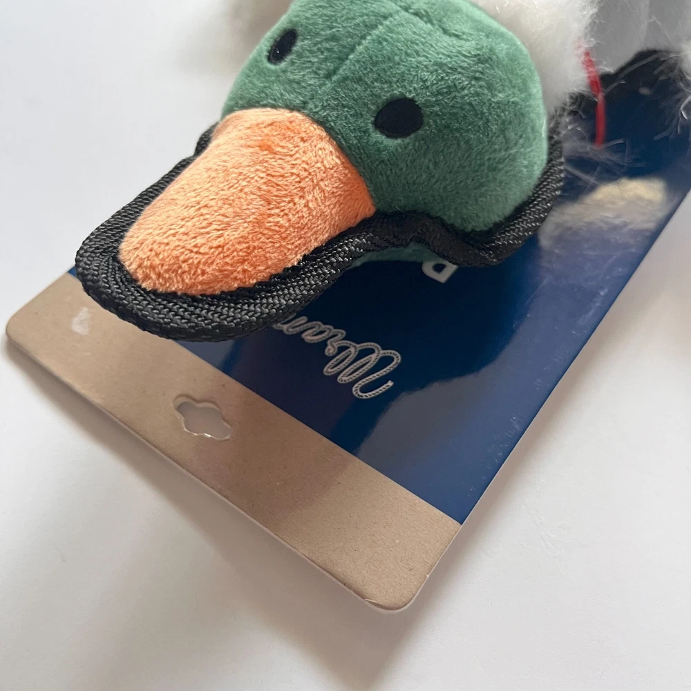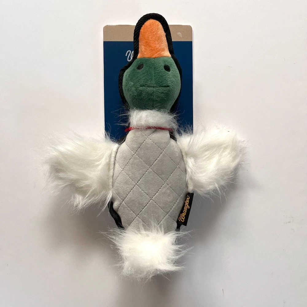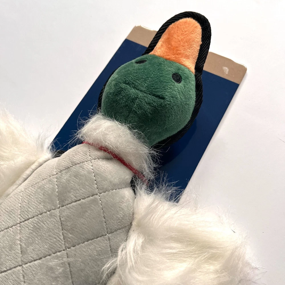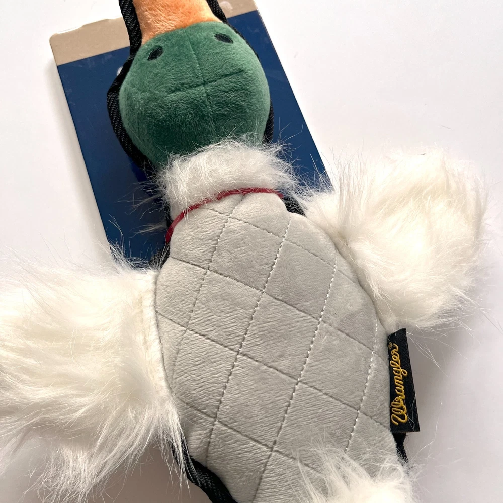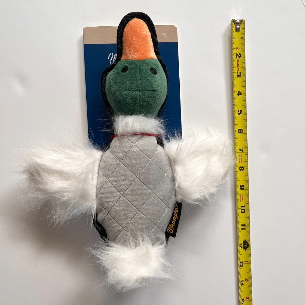 The Wrangler Duck Flattie Plush Dog Toy with Tennis Ball and Rope is a versatile and engaging toy designed to keep your dog entertained for hours. Measuring 12 inches, this toy features a flat, plush duck body that's soft and easy for dogs to chew or cuddle. The addition of a durable tennis ball and rope provides multiple ways to play, making it perfect for games of fetch, tug-of-war, and interactive fun. The plush duck and rope combo reflects Wrangler's rugged, western-inspired style, while the durable materials ensure long-lasting use. Whether your dog loves chewing, fetching, or tugging, this toy offers something for every kind of play. Flat Plush Duck Design Durable Construction Duck Flattie Plush Dog Toy 12-Inch Size Wrangler Style 12" Length 12 x 8 x 2 inches