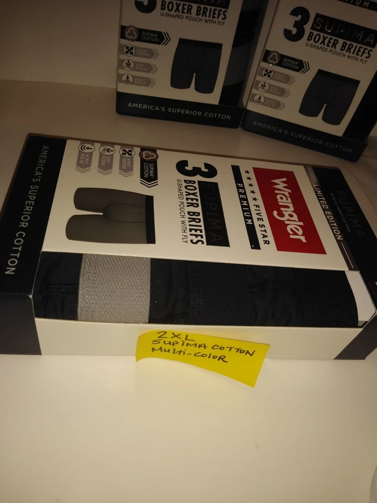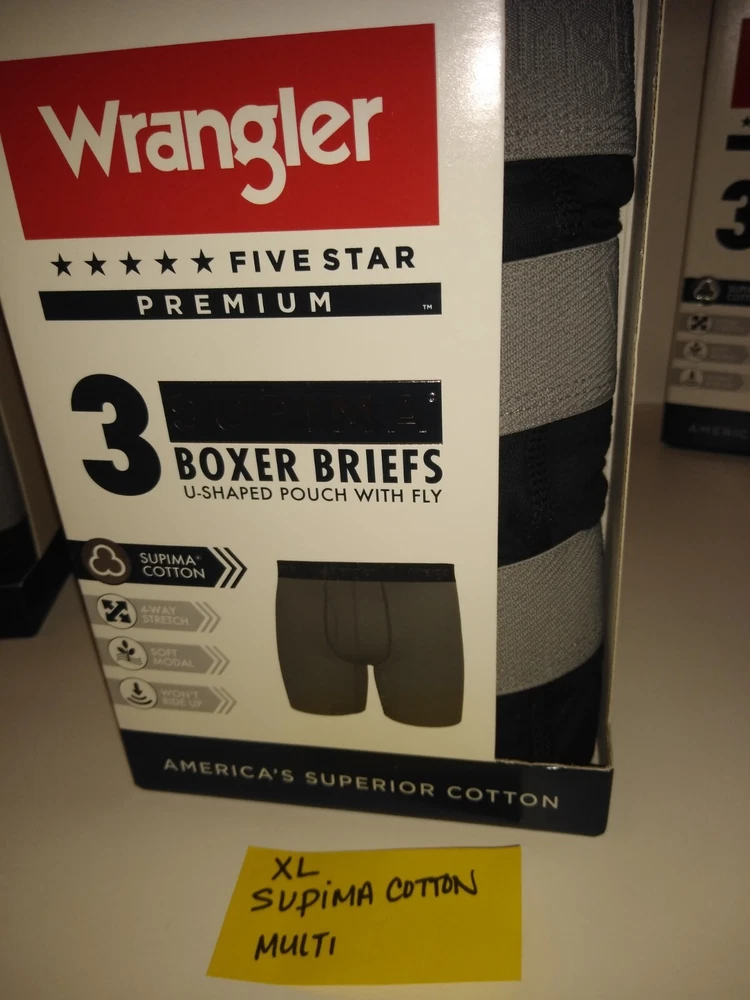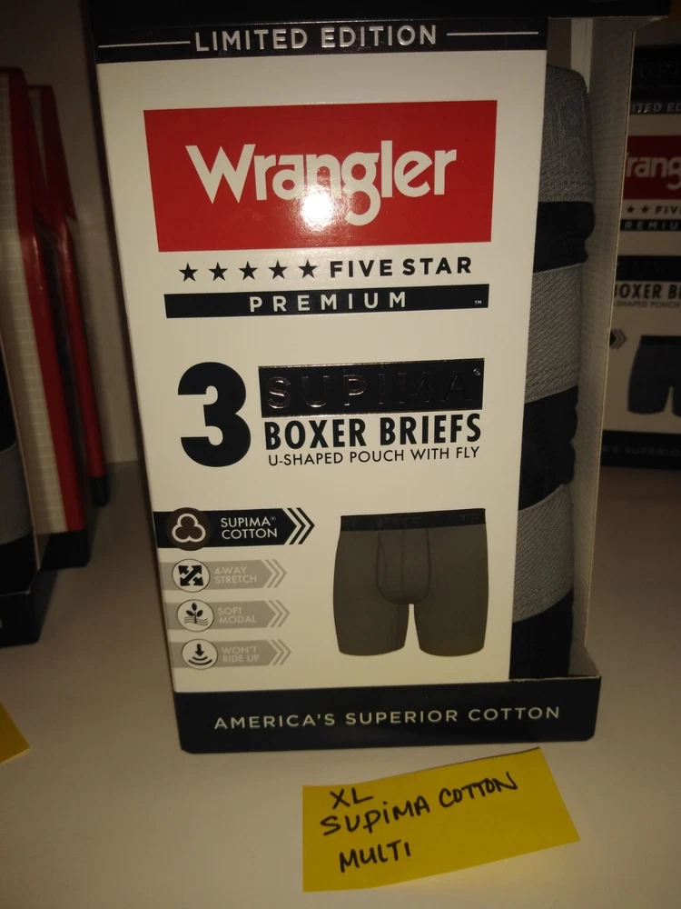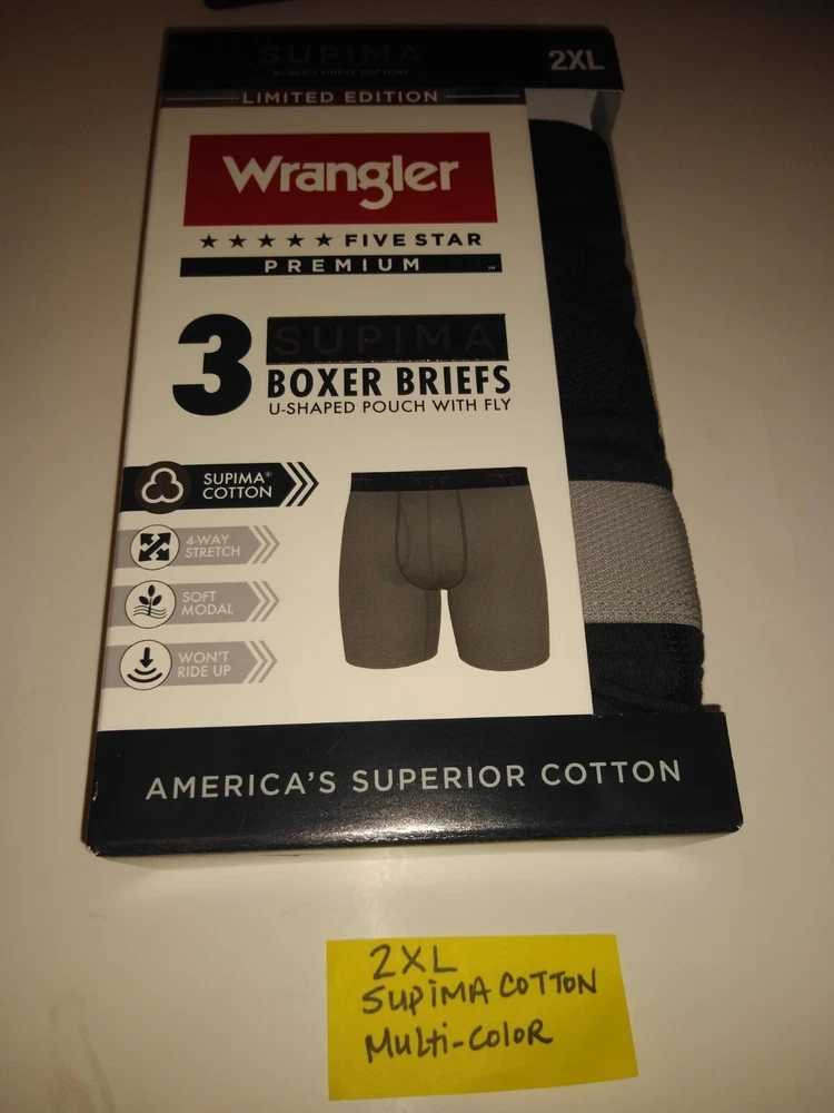 Wrangler Supima Boxer Briefs U Shaped Pouch with Fly 4 Way Stretch Functional Fly Tag Free Comfort 6" Inseam Soft Modal Limited Edition Elevate your underwear game with this Limited Edition three-piece set of Wrangler Five Star Premium Supima Boxer Briefs. Made of a comfortable blend of cotton, modal, and elastane, these boxers feature a solid pattern in black, blue, and grey, with a star theme that adds a touch of playfulness. The fabric type is Supima Cotton 4 Way Stretch, ensuring a comfortable and stretchy fit for all seasons. These boxers are perfect for men who appreciate quality and comfort. They are tagless, breathable, and suitable for all seasons. Choose XL or 2XL. The breathable cotton is a great fit for most men, while the stylish design and stretchy fabric make them a must-have addition to any wardrobe. Get your hands on these Wrangler boxers and enjoy the ultimate comfort and style.