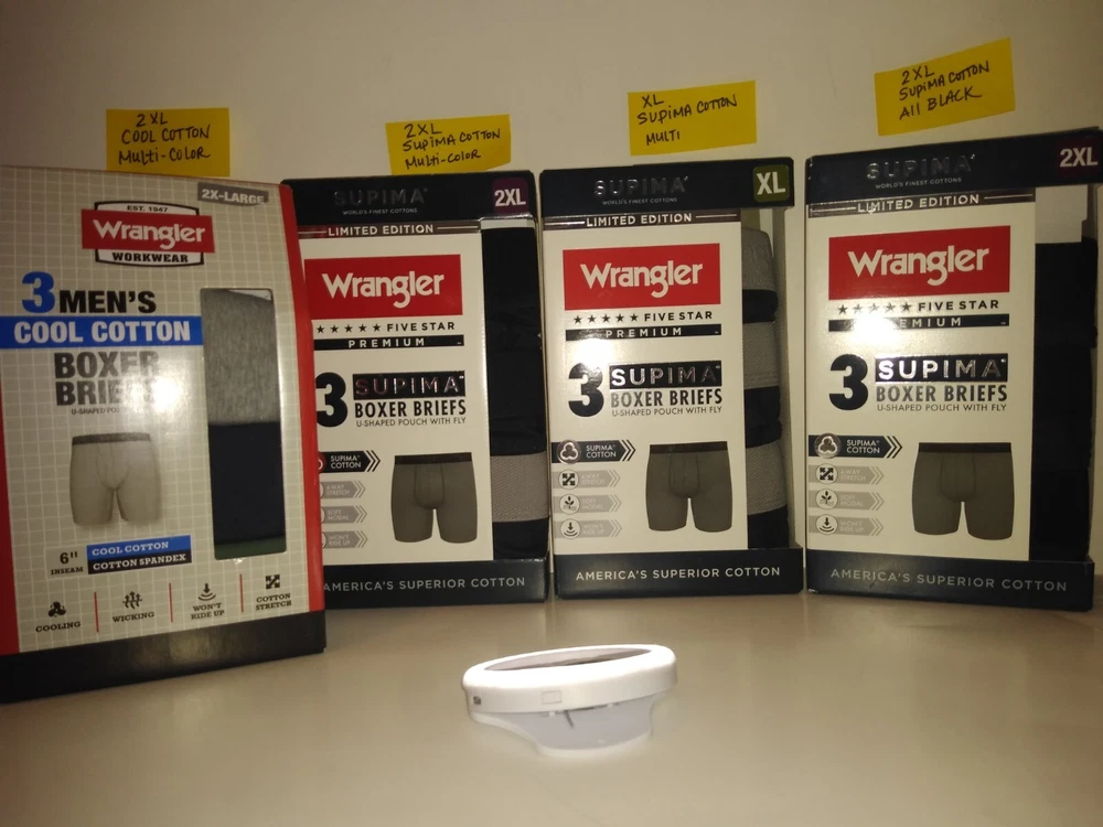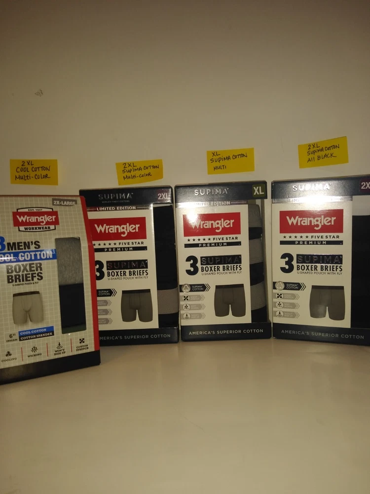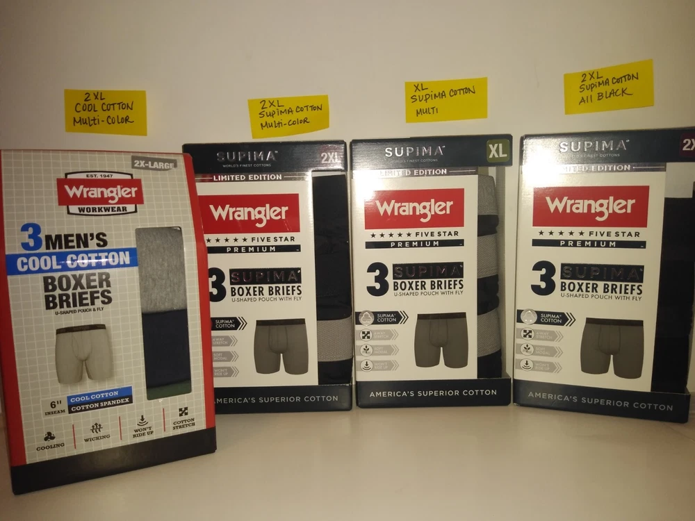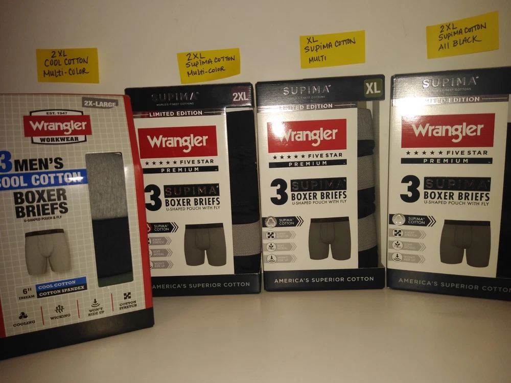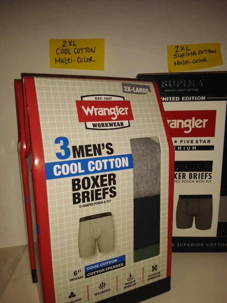 Wrangler Supima Boxer Briefs U Shaped Pouch with Fly 4 Way Stretch Functional Fly Tag Free Comfort 6" Inseam Soft Modal Limited Edition Elevate your underwear game with this Limited Edition three-piece set of Wrangler Five Star Premium Supima Boxer Briefs. Made of a comfortable blend of cotton, modal, and elastane, these boxers feature a solid pattern in black, blue, and grey, with a star theme that adds a touch of playfulness. The fabric type is Supima Cotton 4 Way Stretch, ensuring a comfortable and stretchy fit for all seasons. These boxers are perfect for men who appreciate quality and comfort. They are tagless, breathable, and suitable for all seasons. Choose XL or 2XL. The breathable cotton is a great fit for most men, while the stylish design and stretchy fabric make them a must-have addition to any wardrobe. Get your hands on these Wrangler boxers and enjoy the ultimate comfort and style.