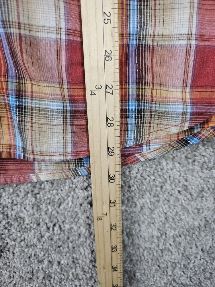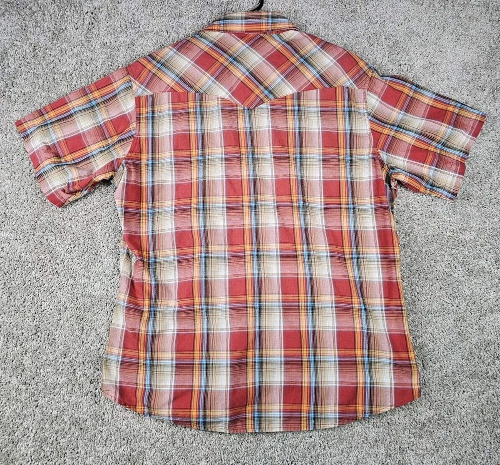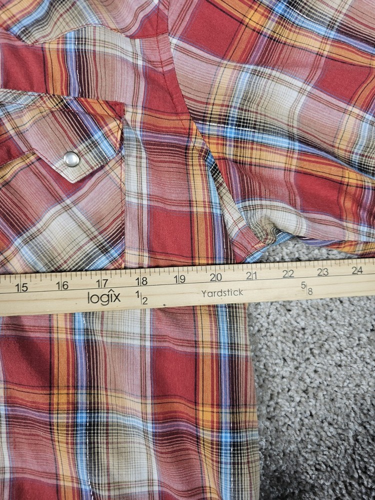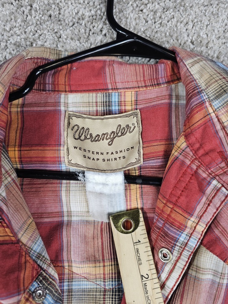 Wrangler Shirt Plaid Short Sleeve Pearl Snap Western Fashion Casual Men's Large Preowned Condition * Size Tag is not readable but measures as a size Large* This Wrangler Western Fashion Snap Shirt is a stylish and comfortable addition to any casual wardrobe. The shirt features a plaid pattern in red and is made of a blend of cotton and polyester woven fabric. It has a collared neckline with a point collar style and short sleeves. Other features include pearl snaps, pockets, and the Wrangler logo as accents. This shirt is perfect for all seasons and occasions and comes in size large. It is a regular fit and has a type of button-up closure. Get this classic Western-style shirt for a fashionable and casual look.