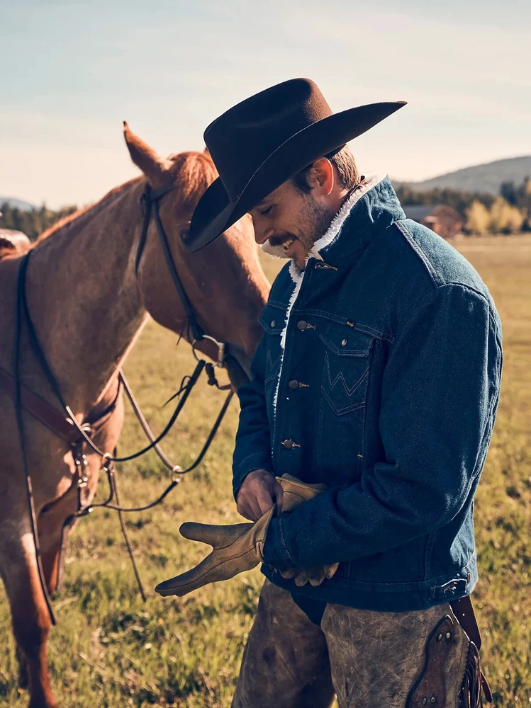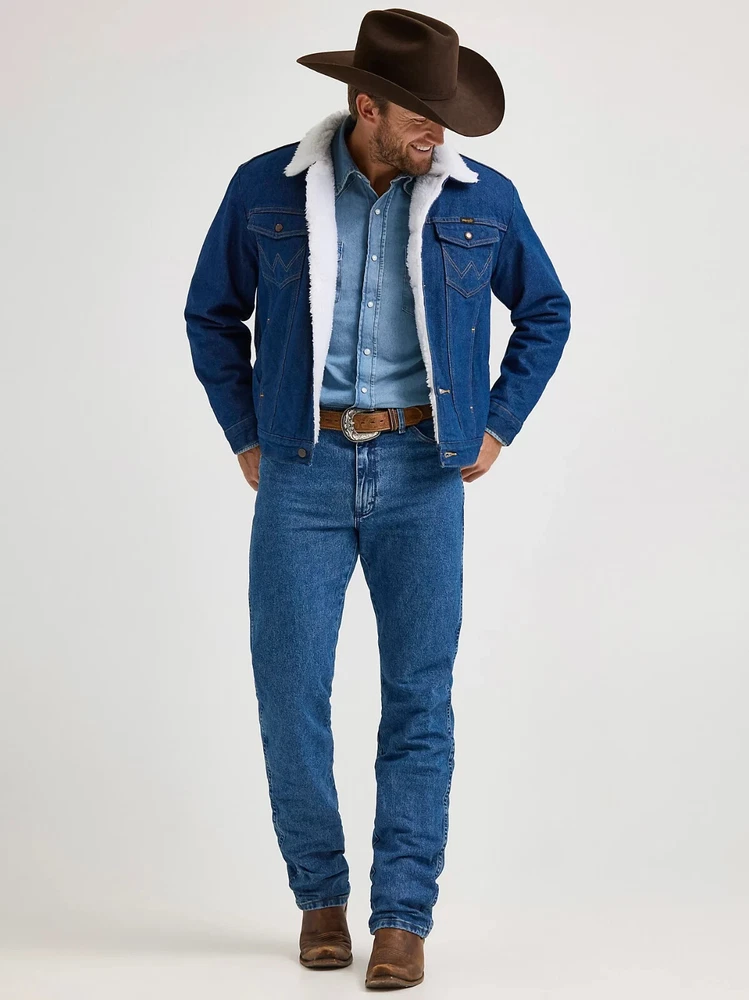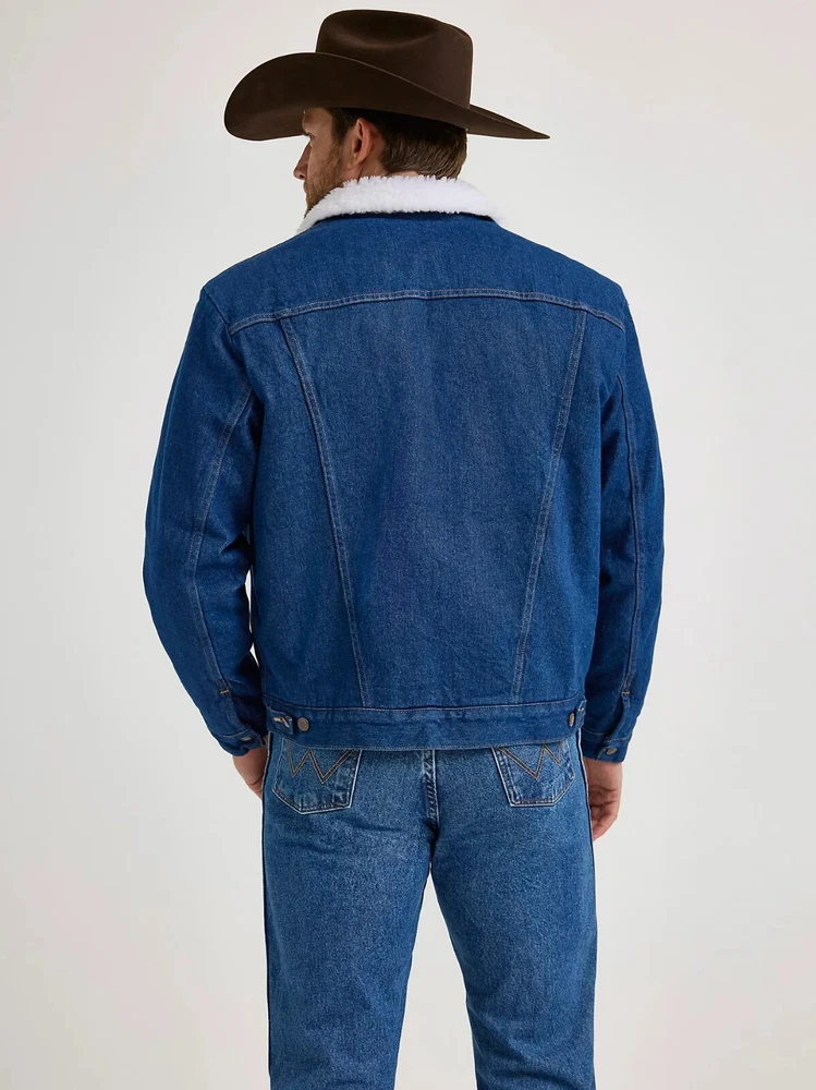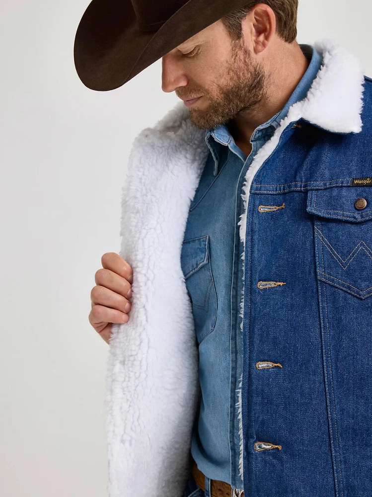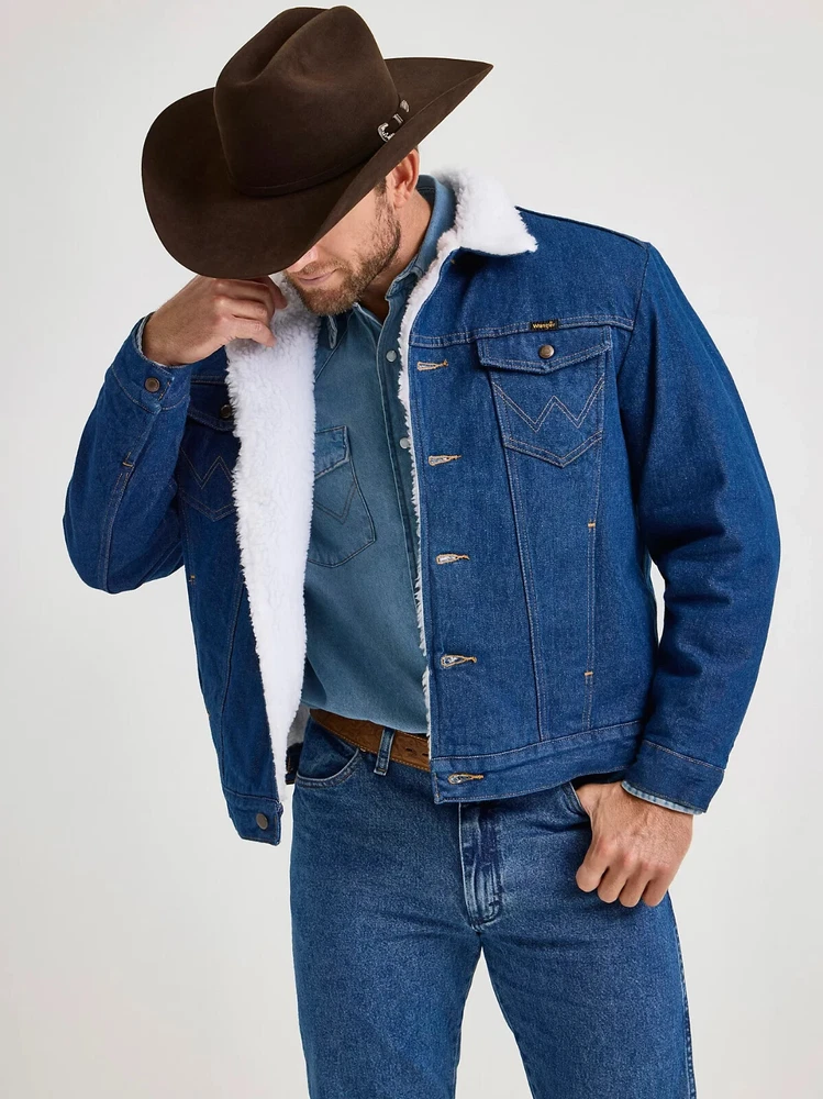 WARM, WESTERN STYLE. Raved about by our customers, the Western Sherpa Lined Denim Jacket features tried and true style you will go back to time and time again. This lined jacket has western-inspired details like flap front pockets with snaps and 'W' stitching, side hand pockets, button front and a warm, cozy sherpa lining. Made from a heavyweight broken twill, this timeless jacket is a stalwart of your closet that you'll reach for again and again. Fit: Regular Lining: Sherpa Sleeve Length: Long Front Closure: Buttons Front Pockets: Two front chest pockets with button flap closure & two side seam pockets Collar: Spread Cuff: One Snap Closure Waist Hem: Straight Bottom ========================================================================== Color: Denim (74255PW) Color: Blue - Dark Fabric: 100% Cotton Heavyweight Prewashed Denim, 14.75 oz. Pattern: Solid