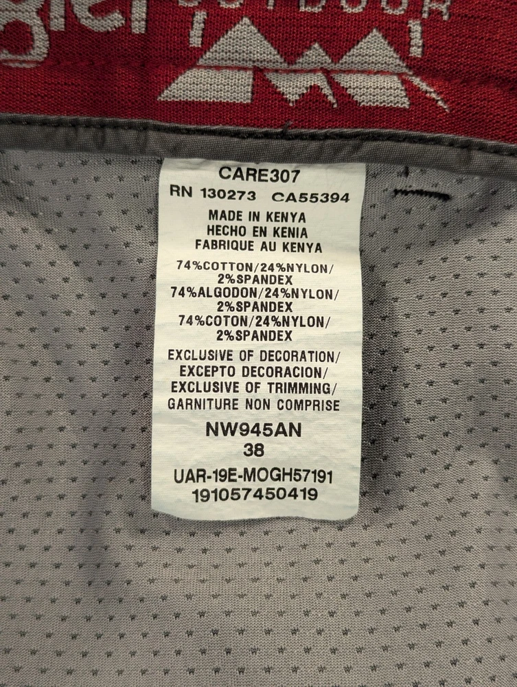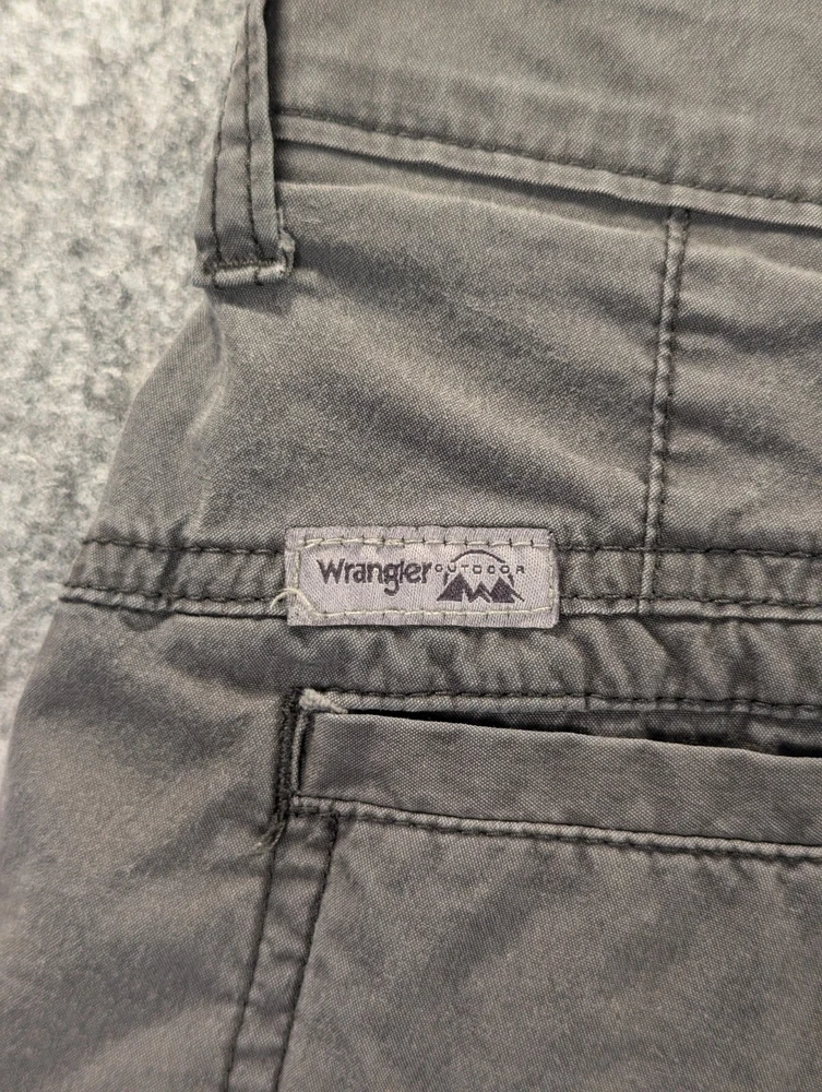 Closure: Zip Fabric Type: Canvas Garment Care: Machine Washable Style: Chino Size Type: Regular Pattern: Solid Color: Gray Fabric Wash: Medium Handmade: No Theme: Outdoor Features: Easy Care, Elastic Waist, Lightweight, Pockets, Stretch Size: 38 Fit: Regular Pocket Type: Slash Pocket Material: Cotton Blend Season: Fall, Spring, Summer, Winter Rise: Mid (10-12 in) Brand: Wrangler Personalize: No Waist Size: 39 in Inseam: 9 in Seller Notes: “Great” Front Type: Flat Front Department: Men Accents: Button, Logo Vintage: No