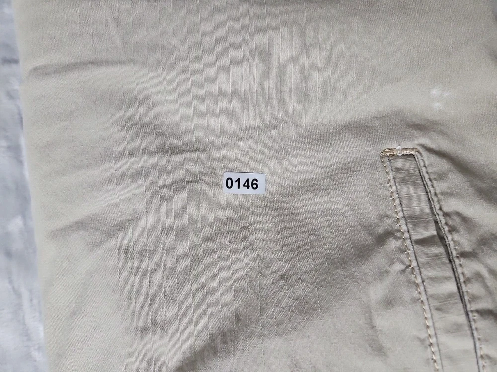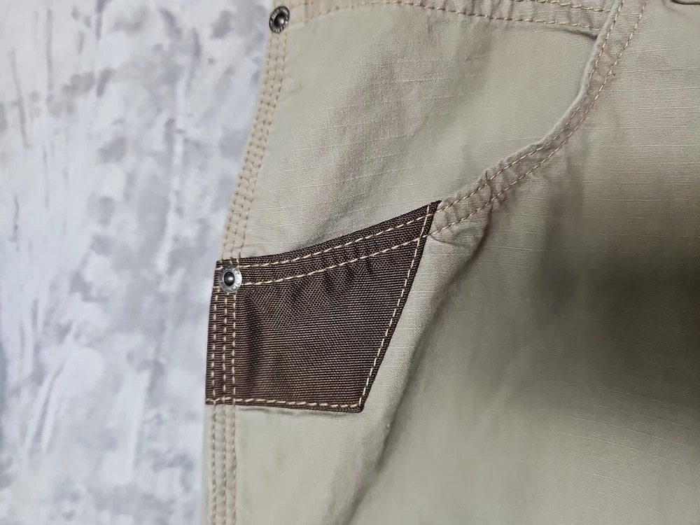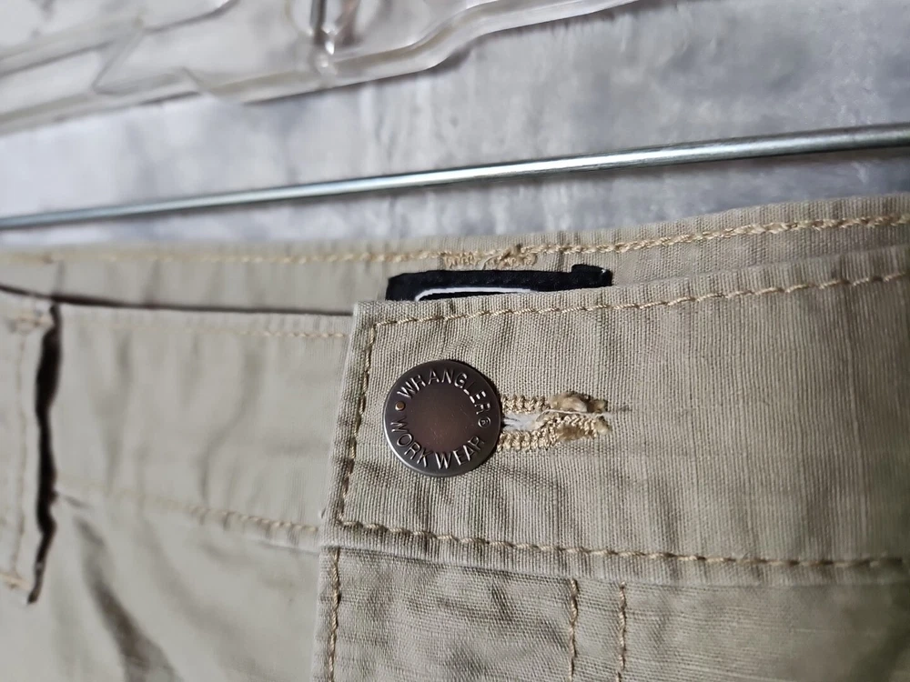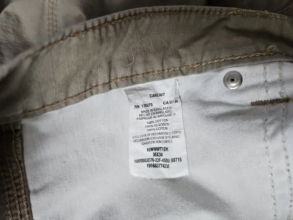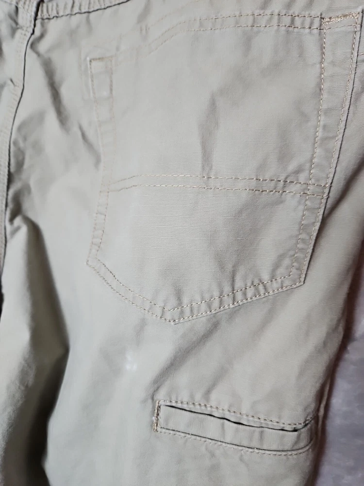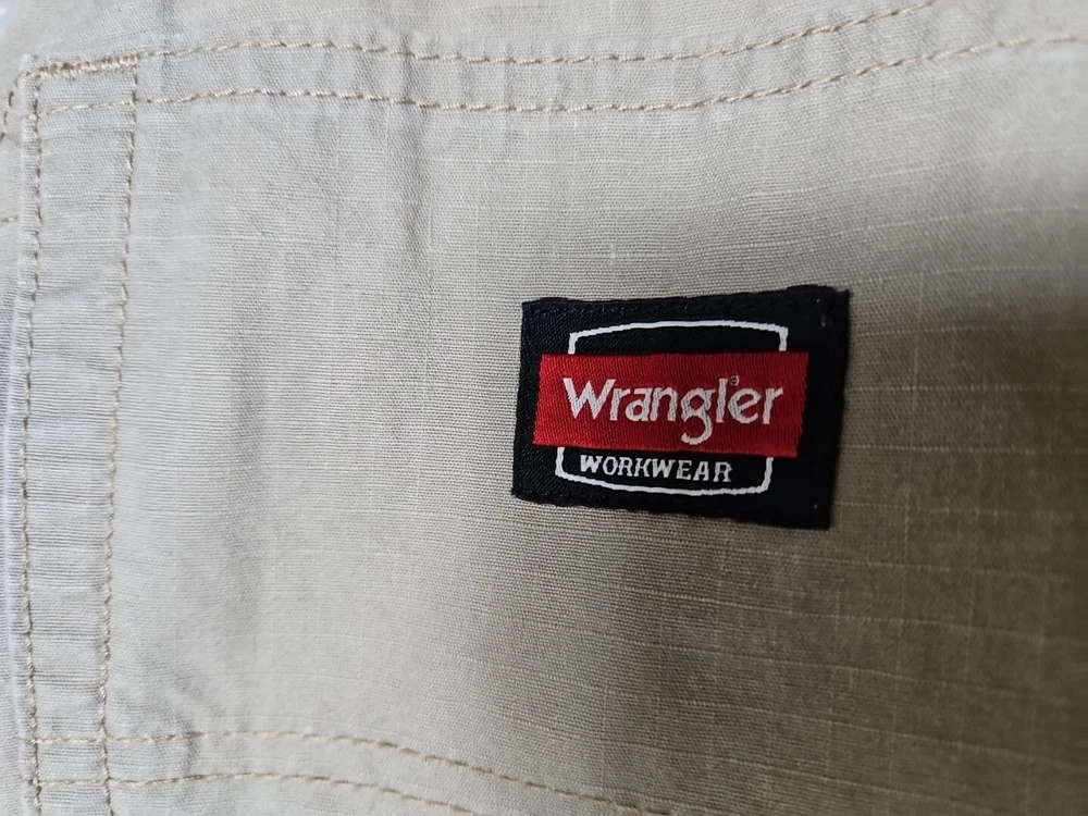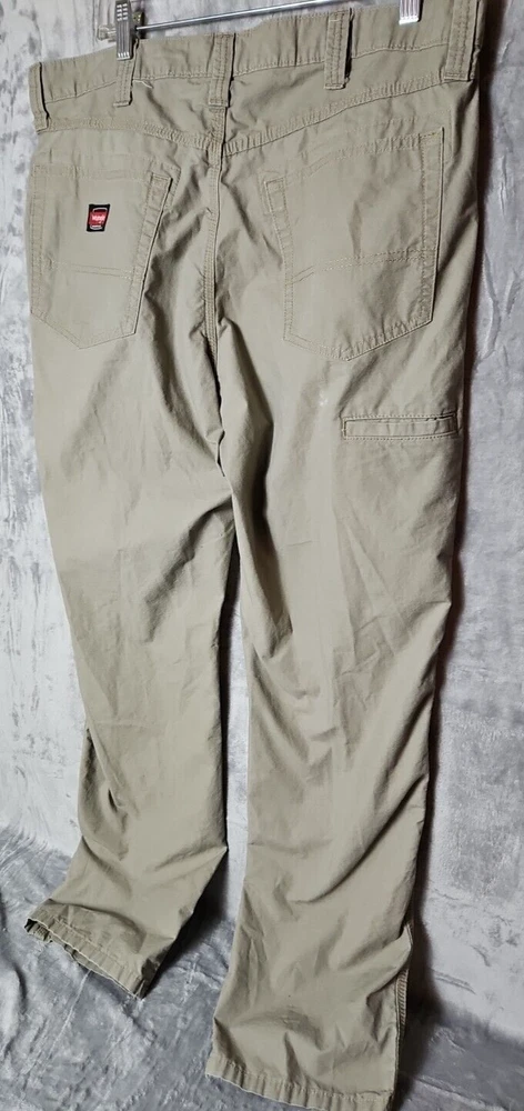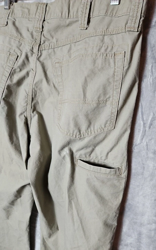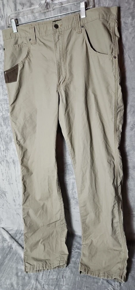 These Wrangler ATG All Terrain Gear pants are designed for outdoor workwear and hiking. They are tan in color with a flat front, made of canvas fabric, and feature a regular fit and straight leg style. The pants have a waist size of 40 inches, inseam of 34 inches, and are size 36 in a regular fit. The style is carpenter, suitable for men looking for durable and comfortable pants for various outdoor activities.