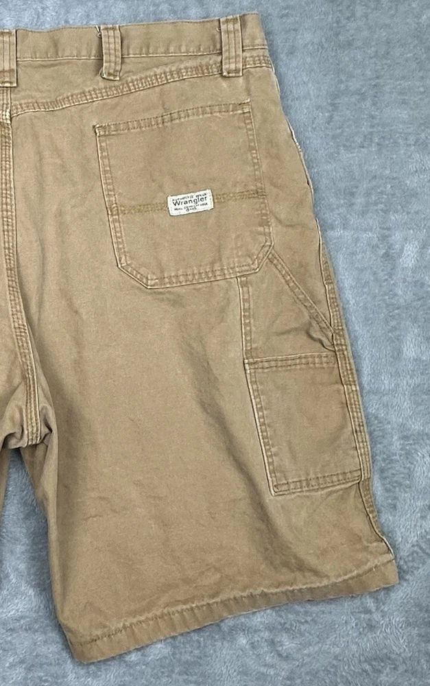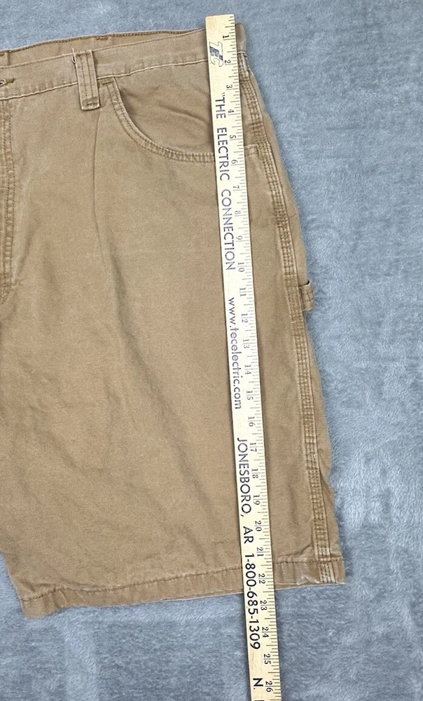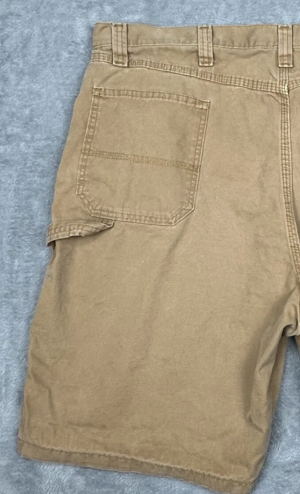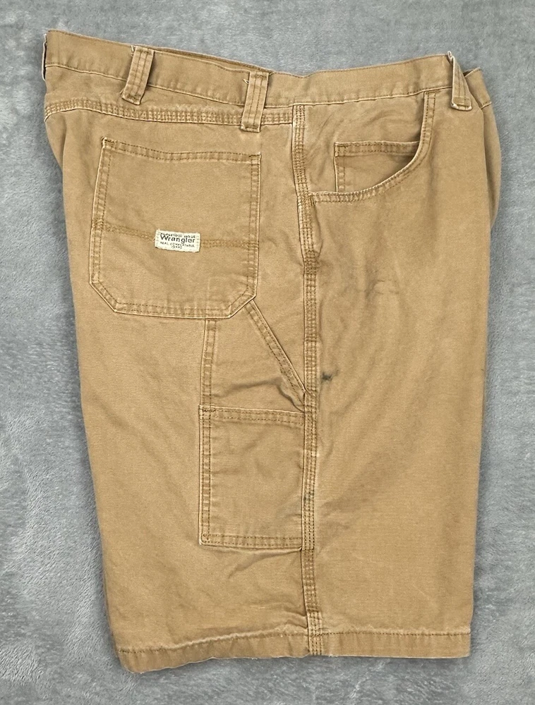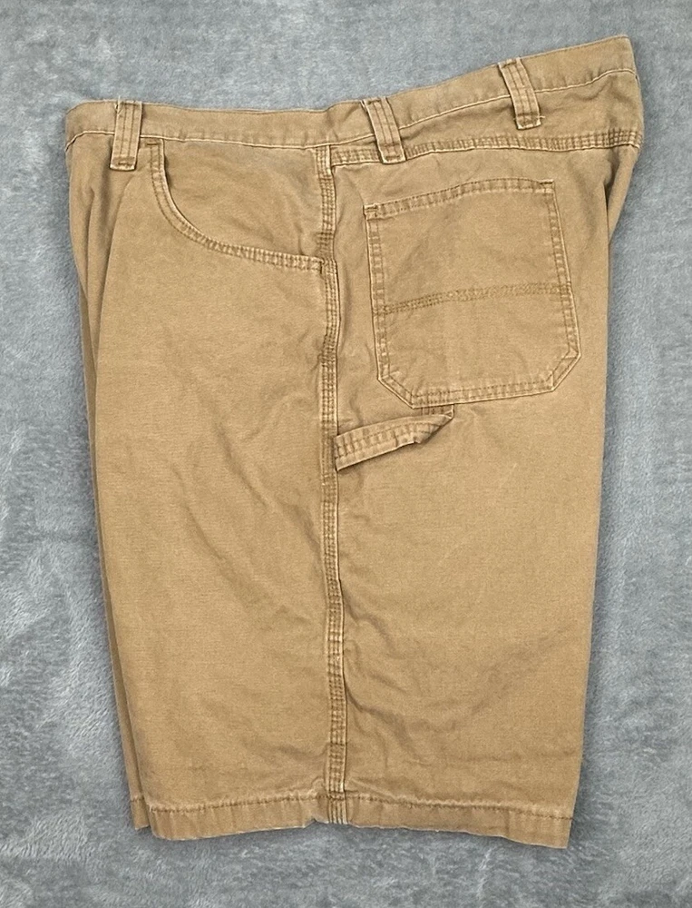 Wrangler Carpenter Shorts Mens 42 Brown Canvas Utility Authentic Issue Work READ Stains, some fading and wear around seams but no holes or tears and in overall good pre-owned condition and laundered. Please see measurements in photos. I ship next business day, but sometimes same business day and Saturday if order is paid for early enough. Please let me know if you have any questions. I am open to offers!! Feel free to look at other items in my store! Thanks!
