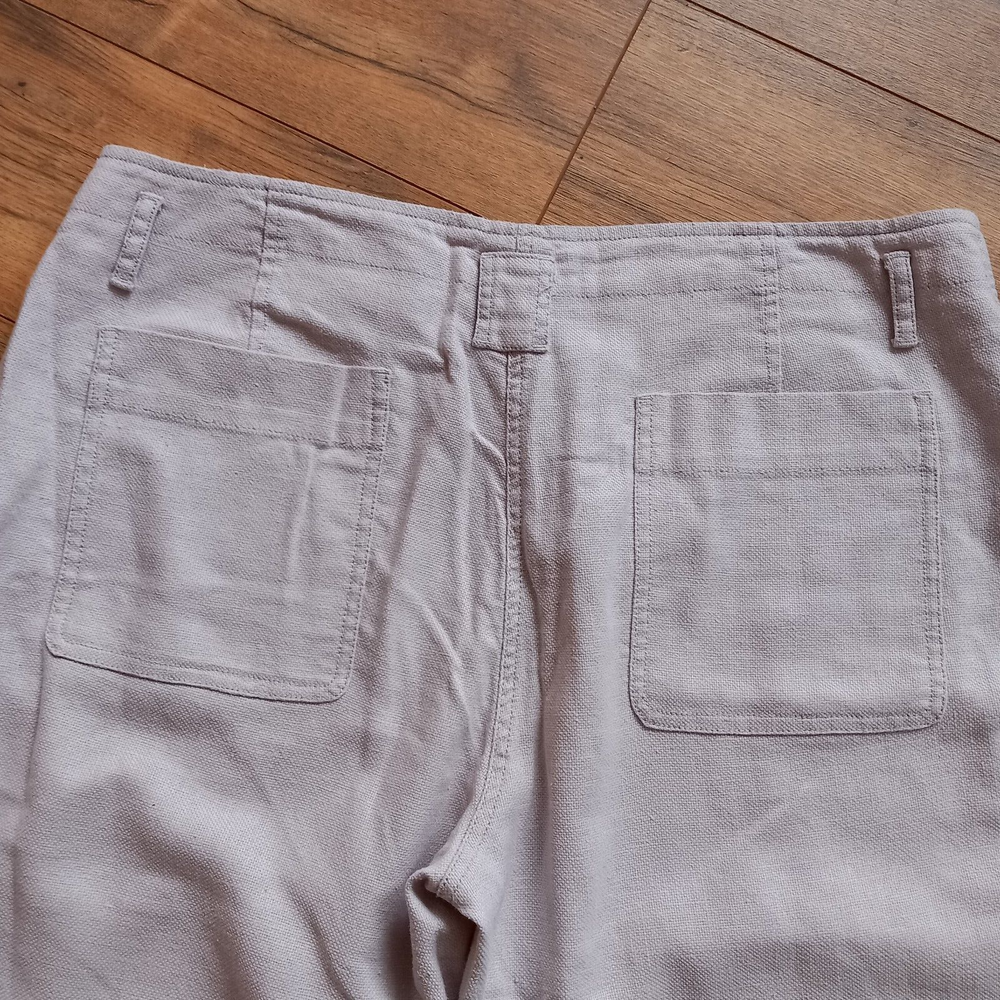 Gently used condition with no faults found. Stone beige colour neutral heavier linen cotton blend tapered trouser from WRAP London. Measures 19" across waistband, 11" rise, 23" across hip area approx, 30" inside leg. 55% linen 45% cotton.
