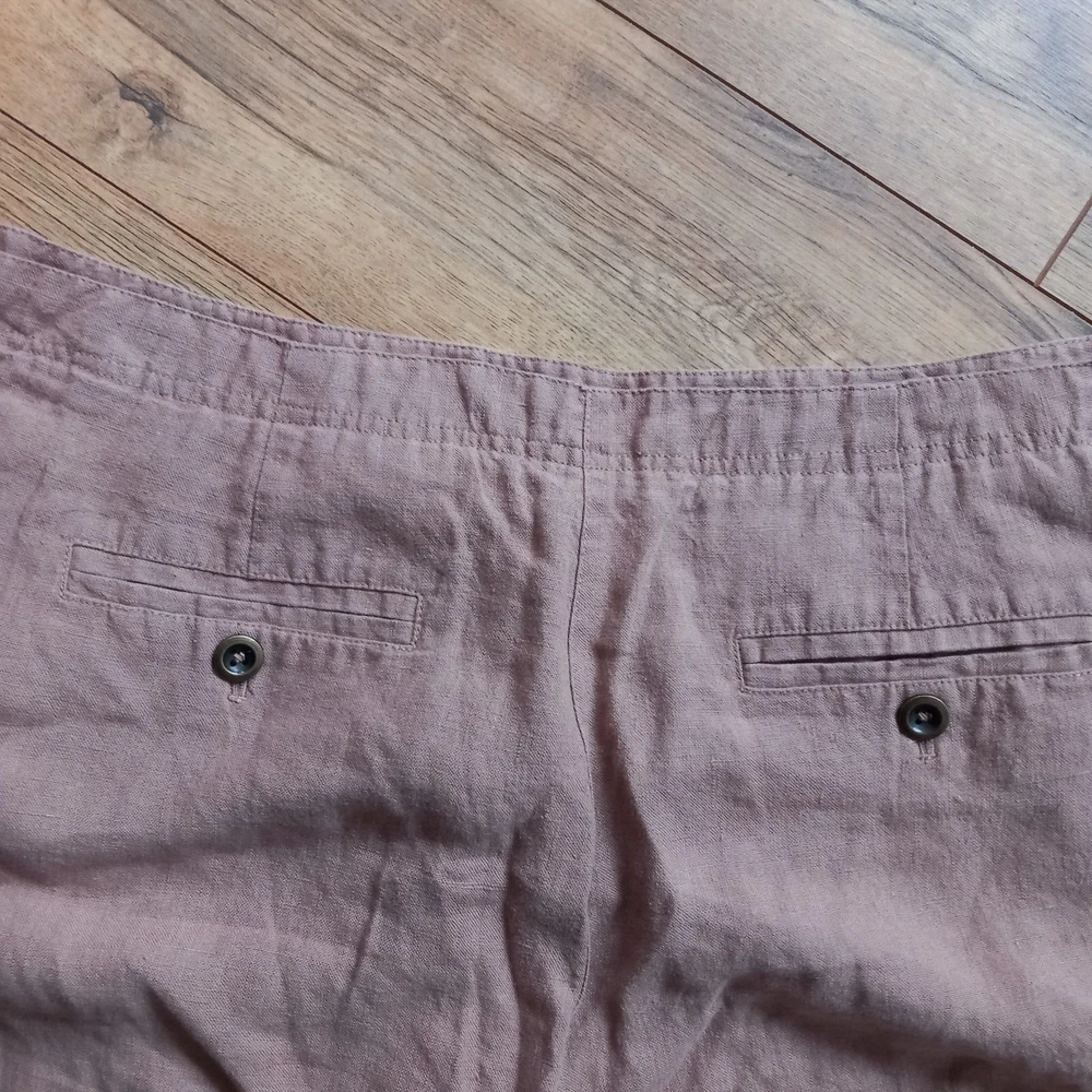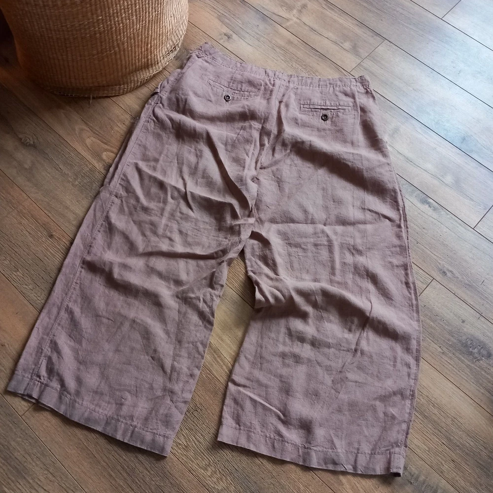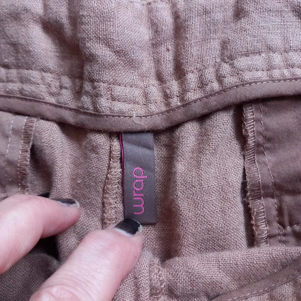 Gently used condition with no faults found. Darker beige colour neutral heavier linen wide leg Lagenlook trouser from WRAP London. Measures 19" across waistband, 13" rise, 24" across hip area approx, 28" inside leg so an ankle length for most. 14" across hems.