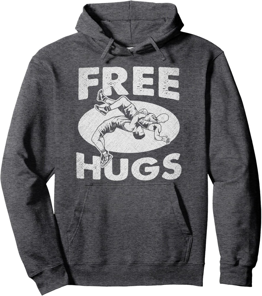 Wrestling - Funny Free Hugs Wrestling Pullover Hoodie Designed and Printed in USA Product Features: • Classic Look and Feel: This ultra cotton tee offer the timeless appeal of traditional cotton. The high-quality print enhances its casual appearance. • Material: Made from 6.1-ounce, 100% cotton. (Note: Dark Heather variant is 50% cotton, 50% polyester.) • Durability: Features double-needle stitching on the neck, sleeves, and hem for added durability. Designed for a roomy, unisex fit. • Print Type: DTG (Direct to Garment) • Manufacturer: Gildan 18000 (Made in USA) Shipping Information: • Handling Time: With POD(Print-On-Demand) product model, we typically require about 3 business-days handling time before shipping. In most cases, our handling time’s , rang e from 1-2 business days. • Delivery Time: • USA: Approximately 2 -6 business days • Canada: Approximately 6-10 business days (We currently don’t offer international Shipping) • Worldwide: Approximately 15-25 business days (We Currently don’t offer international Shipping) • Shipping Carriers: USPS and DHL • Note: Business days exclude weekends and holidays. Return & Exchange Policy: • Quality Guarantee: We stand behind the quality of our products and workmanship . Any defects or errors on our part must result in a refund/ replacement at no charge. • Conditions for Returns: Returns are generally not accepted for user errors such as incorrect selection of sizes, designs, or colors. Returns /Replacements are acceptable for damages such as poor printing results, incorrect size or design caused by us. • Note: Please reach out to us if there are any questions or issue s with your item, we’ll do our best to resolve any issue you might have. Note: • We’re glad to have your support! If you have a moment, y our honest feedback is very valuable to us. Thank you!