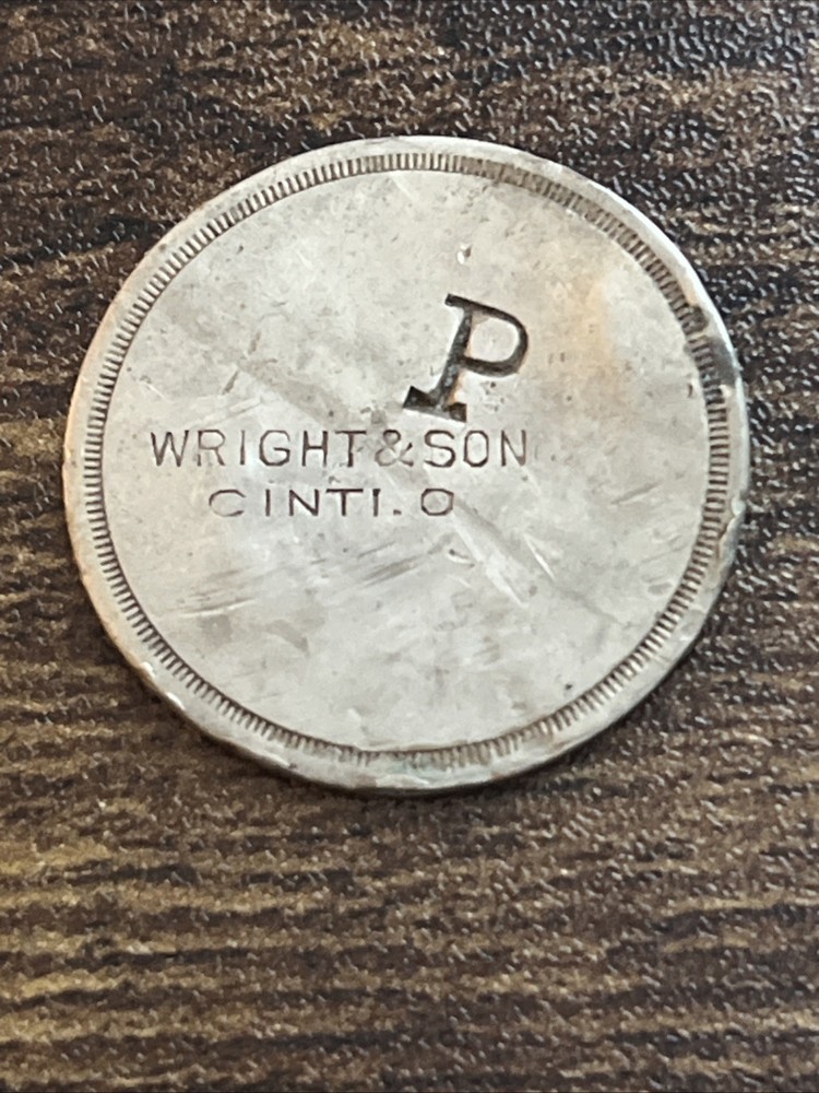 The product is a rare token from Wright & Son in Cincinnati, Ohio, dating back to the late 19th or early 20th century. It is a "Good For 5 Five Cents" drink token, indicating that it could be redeemed for a 5 cent beverage at the establishment. This token is a piece of historical memorabilia that offers a glimpse into the past and the local culture of the time.