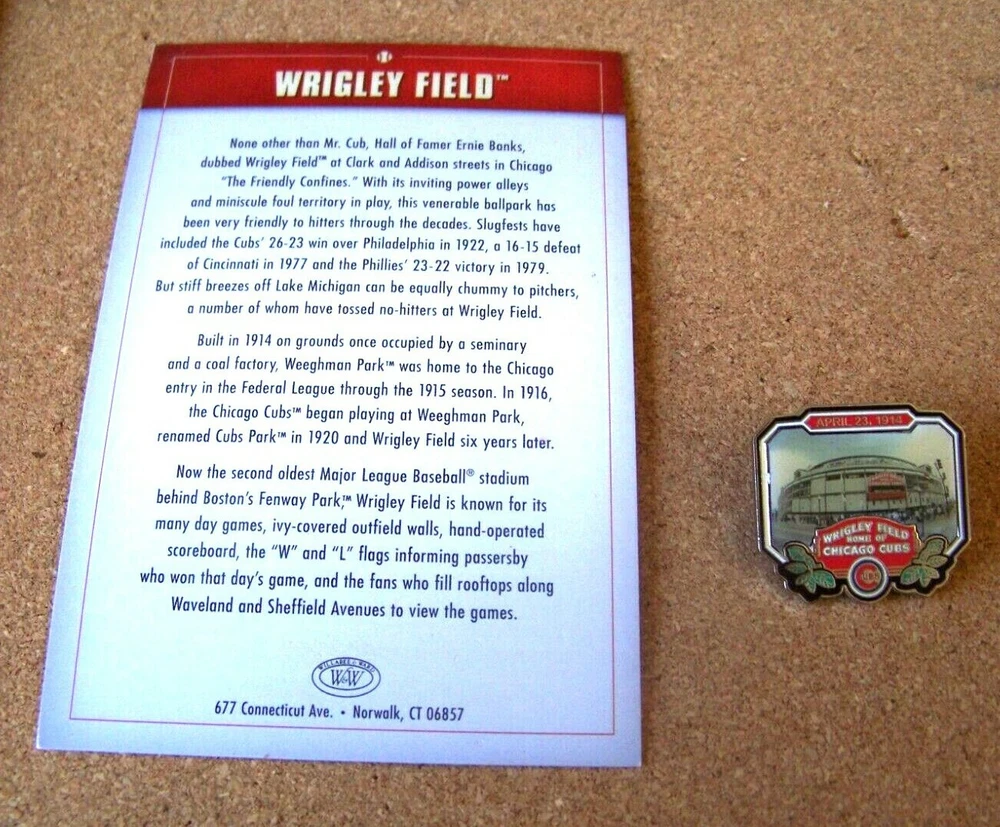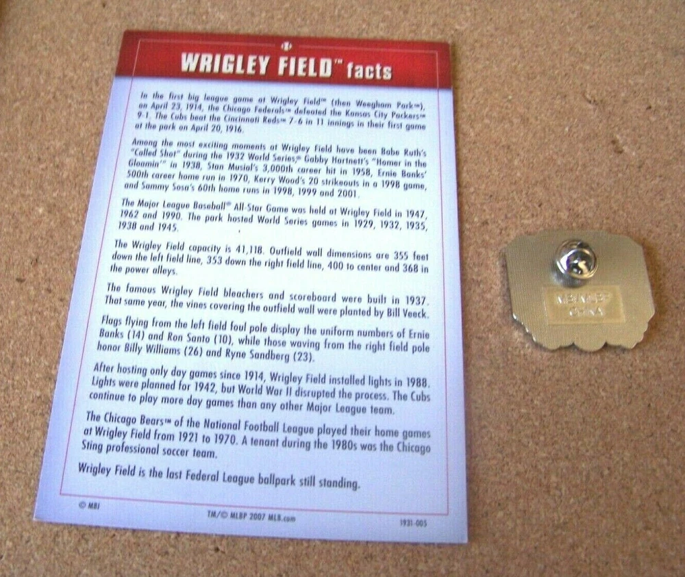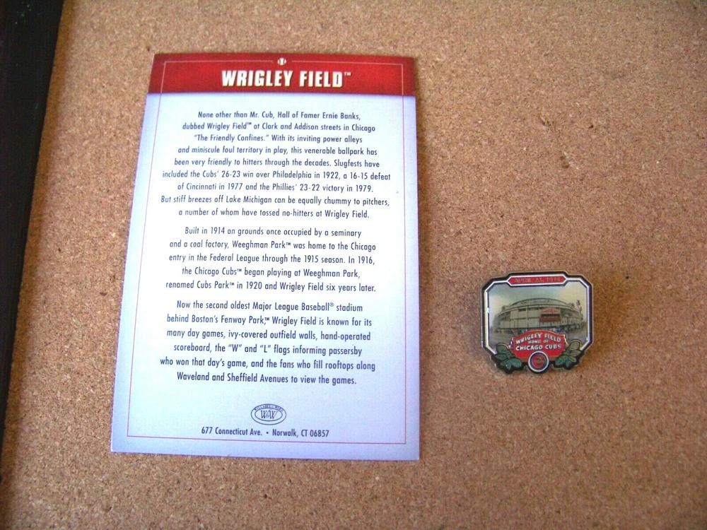 Wrigley Field Chicago Cubs photo lapel pin / card W&W Willabee & Ward Pin comes from a limited edition subscription only series - tough to find singly Item Description: Pin: MLB licensed, silver tone, post and butterfly clip backed Pin Size: measures about 1.5" wide Pin Condition: Excellent condition, minor nicks and marks on the front surface. Light yellowing. Packaging: none Packaging condition: n/a Shipping: Shipping Time : 1 business day of receiving cleared payment, Mondays thru Fridays. U.S.A. Shipping Costs: FREE! Return Policy: Returns accepted, buyer pays return shipping unless there’s an error on seller’s part. Additional Information: Full e-mail support for inquiries or problems. HIGH COUNTRY COLLECTIBLES Since 1989 – A LEADER IN THE DENVER SPORTS MEMORABILIA MARKET. Check out my other auctions and listings, and keep an eye out for the different, unusual, and EXCLUSIVE items available nowhere else but from High Country Collectibles. Don’t forget to click on my "Stores" link, next to my eBay name, to see other items I currently have listed for sale, or you can copy and paste this address into your browser: stores.ebay.com/highcountrycollectibles