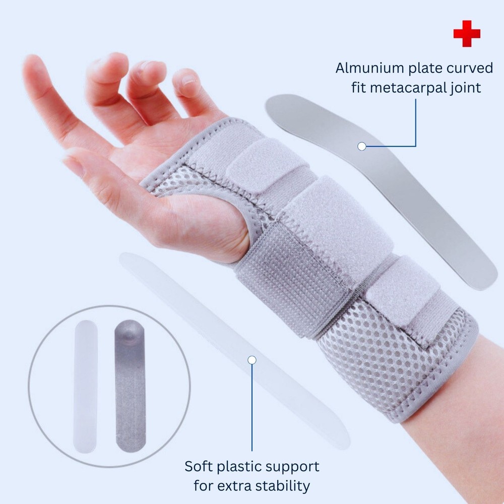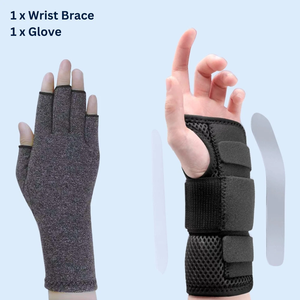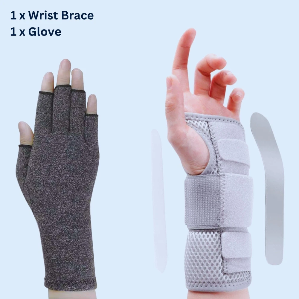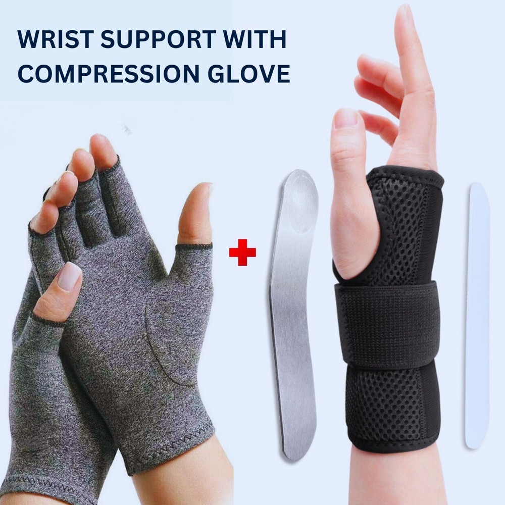 PRODUCTS OVERVIEW WRIST BRACE Multi-Purpose – This wrist support brace is highly effective for managing carpal tunnel syndrome , tendonitis , arthritis , or even a simple wrist sprain or strain . It helps relieve pain , reduce numbness , and ease morning stiffness symptoms for improved comfort throughout the day and night. Metal Splint Support – Designed for superior stability, this brace includes a removable metal wrist splint and two fixed plastic splints. Together, they provide firm wrist support by limiting unintentional bending or twisting during sleep , helping prevent inflammation or nerve compression caused by poor sleeping posture. Adjustable Size – Featuring three adjustable straps with hook and loop closure , this wrist brace for women and men offers a customizable fit for secure compression and stability . The extended design ensures the wrist guard stays in place comfortably—even while sleeping. Night and Day Support – Designed for 24/7 comfort, this carpal tunnel wrist brace night support maintains the wrist in a neutral position while sleeping to prevent nighttime edema and pressure buildup. During the day, it supports joint stability and reduces irritation caused by repetitive movements . ARTHRITIS GLOVES Targeted Hand Pain Relief Find relief from arthritis pain, joint stiffness, and hand swelling with our cotton compression gloves for arthritis . Designed to gently conform to the natural shape of your hands , these gloves provide targeted compression therapy that helps reduce discomfort from rheumatoid arthritis, osteoarthritis, musculoskeletal pain, and everyday joint strain . Ideal for improving mobility and easing pain during daily activities. Enhanced Grip & Full Dexterity Available in 2 different sizes , our fingerless arthritis gloves offer a snug, custom fit while maintaining flexibility. The cotton-enhanced material improves grip strength, while the open-finger design allows for a full range of motion. The optimally placed finger openings provide effective compression without limiting mobility, giving you the perfect balance of support and freedom. Breathable & Temperature-Regulating Fabric Made with a premium blend of 44% cotton, 44% polyester, and 12% spandex , these gloves are lightweight, breathable, and comfortable for all-day wear. The fabric is temperature regulating – it retains gentle heat to soothe aching joints while preventing excess sweat, making it perfect for use at home, at work, or on the go. Smart Stitching for Long-Lasting Comfort Upgraded with durable smart seam stitching , our compression gloves reduce irritation and eliminate pressure points. The carefully designed seams, including around the thumb and fingers, ensure greater comfort and long-lasting wear without friction. Easy to Wear & Maintain The stretchy open-finger design makes these gloves easy to slip on and take off. Plus, they are machine washable , making care simple and hassle-free. With their durable construction and therapeutic benefits, our arthritis compression gloves are the perfect solution for anyone seeking pain relief, hand support, and improved mobility .