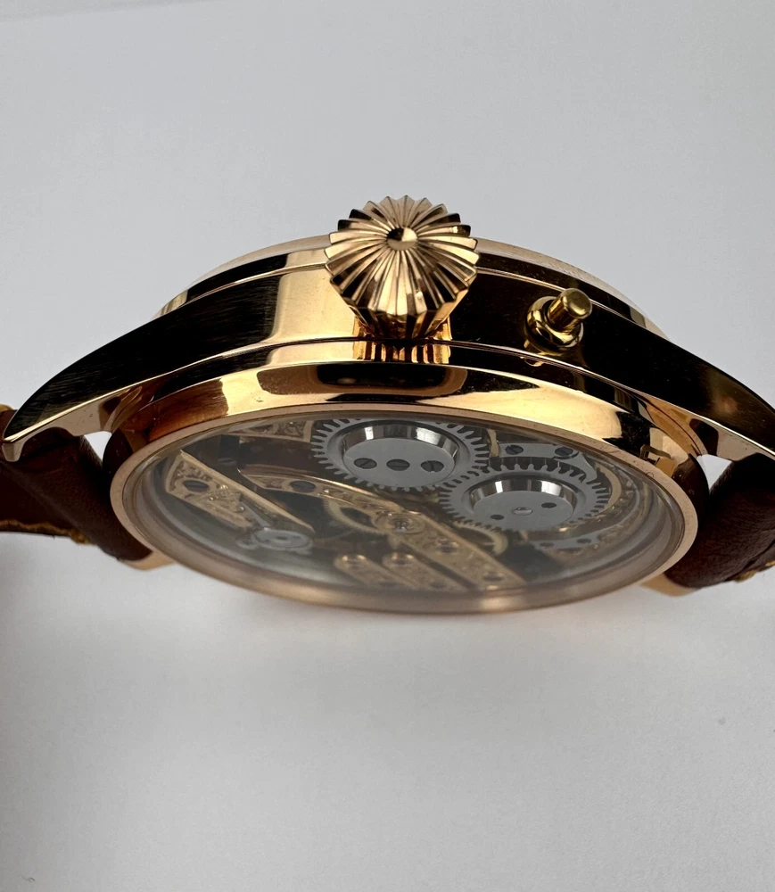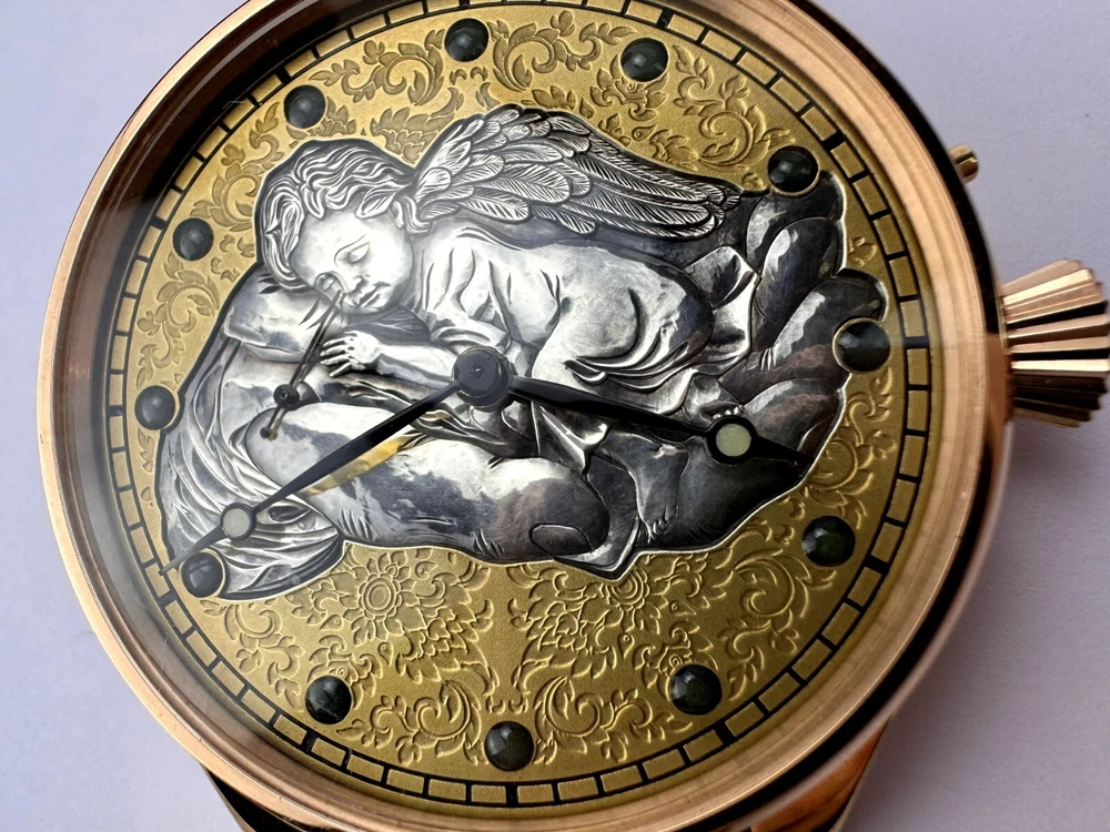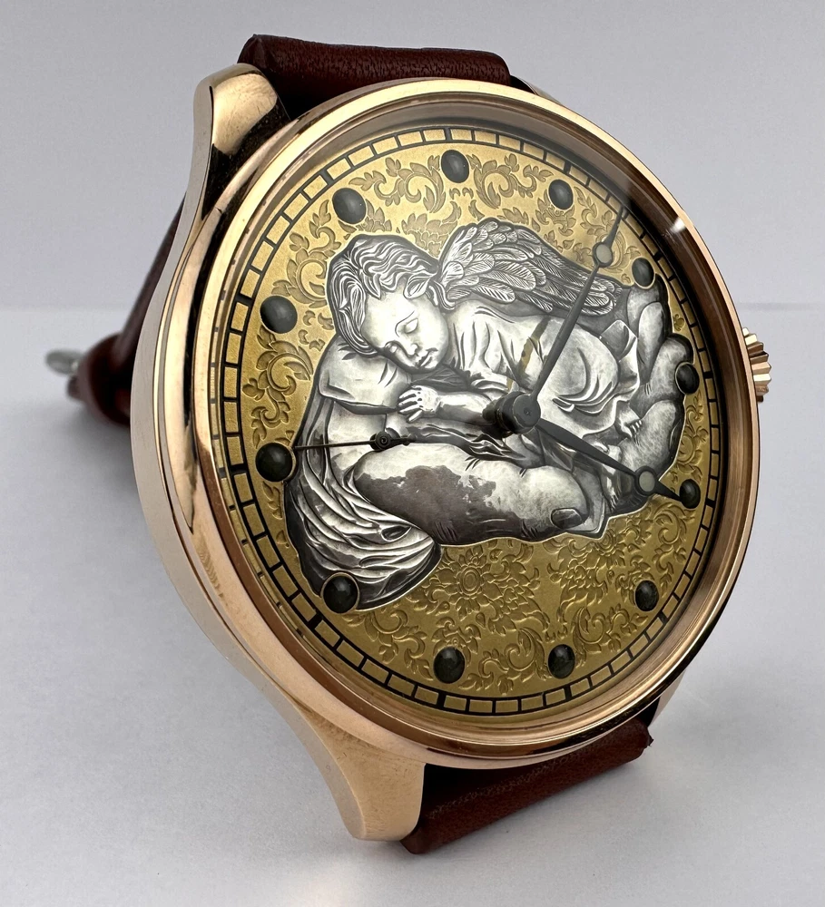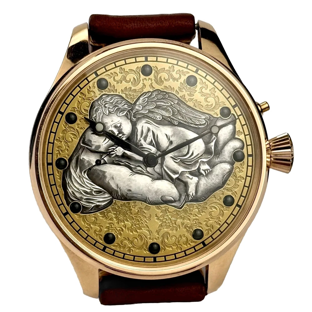 Exclusive "Marriage" watch - a masterpiece of watchmaking art where vintage movement gets new life in a modern case. Each piece is hand-assembled with attention to detail. These aren't just watches, but history reborn through skillful fusion of different eras. WE CAN CREATE UNIQUE CUSTOM WATCHES FROM SCRATCH ACCORDING TO YOUR DESIGN IN A SINGLE PIECE. Message us! Want to participate in creating your unique skeleton watch design? Share your ideas and after careful work, we'll present you with your unique design. The Little Angel watch is a symbol of protection and hope. This timepiece carries deep meaning—it serves as a reminder that we are all children in the hands of our Heavenly Father. The stainless steel case is coated with rose gold-colored titanium nitride, symbolizing warmth and divine grace. The hand-engraved dial is adorned with gold plating, silver, and blackening, creating a refined, three-dimensional design. It is also embellished with enamel and luminescent material, making the dot indexes glow in the dark. Hands made using a punched stamp and are also coated with luminescent material. This accessory is more than just a watch—it is a reminder of divine protection, faith, and the light that guides us even in the darkest times. CASE : Stainless steel with gold PVD coating (titanium nitride); STRAP : Included, brown band, 22mm, genuine leather; SIZE : Diameter: 47.6mm; Thickness: 15.6mm; CRYSTAL : Mineral glass front and back; SHIPPING : Within 2 business days after payment; PAYMENT : According to eBay rules; RETURN POLICY: If you are not completely satisfied with your purchase, return the item within 30 days of receiving your watch for an exchange or refund. Buyers with zero rating require prior approval. At the heart of all our watches are vintage movements manufactured since the 1890s, averaging around 100 years old. All movements installed in watches have been restored by our experienced craftsmen. Complete servicing and careful restoration give them new life. Antimagnetic steel case protects this masterpiece. The designer dial is adorned with cold jeweled enamel, each hand perfectly fitted by a master. SPECIFCATIONS: Mineral crystals (sapphire installation possible); Handcrafted genuine leather strap; Custom dial design available; All dials are on feet. ADDITIONAL SERVICES: 1) Replacement of mineral crystal with sapphire one: Starting from $60 for front crystal (from 38mm); Starting from $40 for back crystal (from 37mm). Crystal diameter varies for each watch, please inquire via private message for exact cost. 2) Custom engraving available on case back. Clarify the price in the message. 3) You'll receive the watch in an exclusive branded wooden box - perfect for a WOW effect gift (without extra charges)! About us: Extensive experience in creating skeleton watches since 2011. Each design is crafted by masters of their craft, investing experience, knowledge, and soul. IMPORTANT CARE RECOMMENDATIONS: Not water-resistant, keep away from moisture; Avoid bumping or dropping the watch; Wind carefully without excessive force; Set time clockwise only; Keep away from magnets; Service every 2-3 years; Acceptable daily rate variation ±3 minutes.
