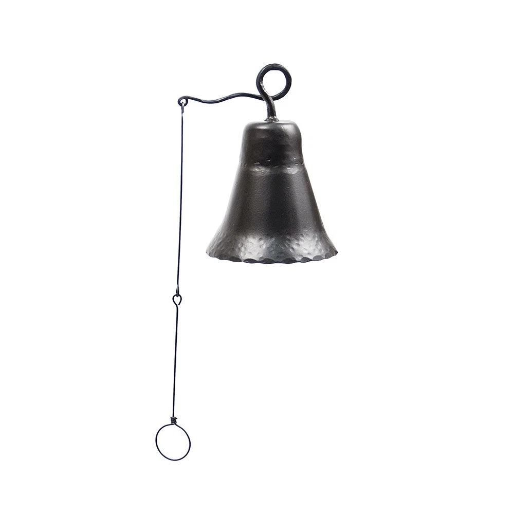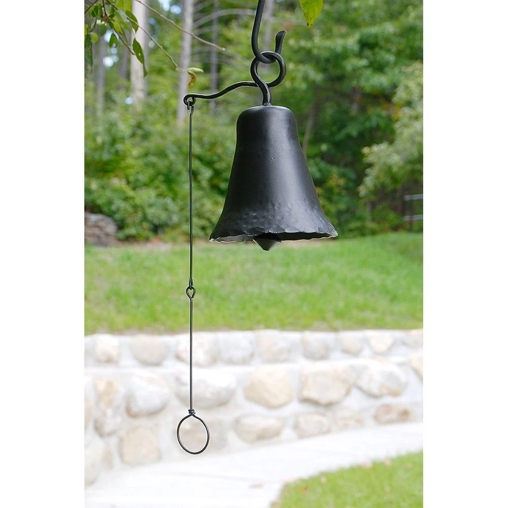 These hand-forged Wrought Iron Bells have a delicately looping stem for hanging that also holds the pull chain. As the bell tips, the knocker rings a bright clear sound. Hang from our O Hook bracket to use as an old-fashioned doorbell, the dog in, or the let the know dinner is ready. Available in three sizes, smallest has the highest tone, largest is the lowest and rings loudest. Bright, Clear Sound: This charming, hand-forged knocker bell that hangs freely and catches the breeze like a wind chime. Used as a doorbell, it promises a pleasing, clear sound that is loud enough to hear from inside your home. A delicately looping stem for hanging also holds the pull chain. As the bell tips, the knocker rings. COATED FINISH: These metal bells have a graphite -coated finish with the look of natural iron. coatings result in a high-quality finish that is more durable and resistant to scratching than regular liquid paints. HAND-FORGED FROM WROUGHT IRON: This decorative and durable door bell is handmade using fine wrought iron. Our in-house design team brings together varied expertise in the fields of mechanical engineering, architecture, fine art, sculpture, and metallurgy. This expertise results in high-quality, beautiful bells. Because each product is hand-forged, exact dimensions may vary slightly. COATED FINISH: These metal bells have a graphite -coated finish with the look of natural iron. coatings result in a high-quality finish that is more durable and resistant to scratching than regular liquid paints. THREE SIZES: Small Bell- 4-inch diameter, has the highest pitch sound, Medium Bell- 6-inch diameter has a mid-tone, and Large Bell- 8-in diameter has a deep tone.