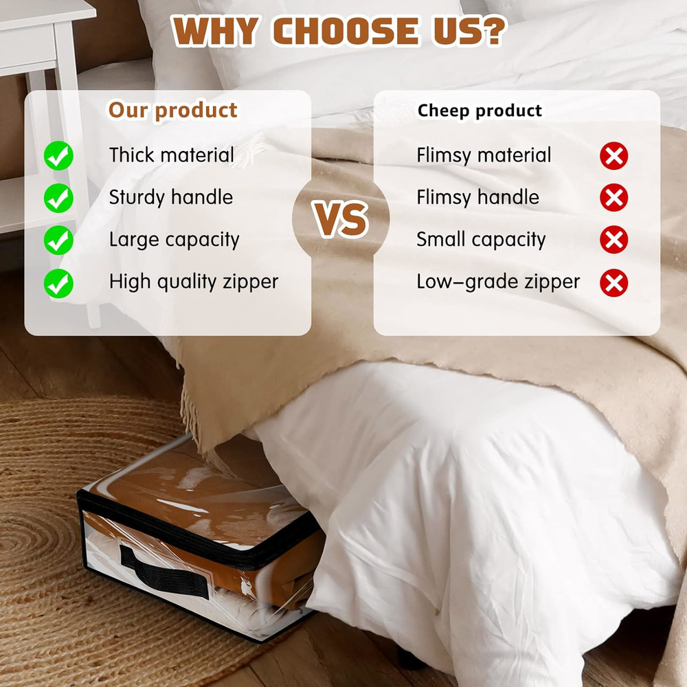 Wsryx 4 Pack Clear Under The Bed Storage Boxes with Lids, Foldable Large Sofa ???Fully Clear Design???The underbed storage bag is made from heavy-duty PVC material. White polyester webbing with a fully transparent box body with an easy to slide nylon zipper and a transparent visible design that makes the storage bags easy to identify all your stored items without opening the package. ???Large Space???- 4 pack clear under bed storage container. Size: 90 x 45 x 13 / 35.4 x 17.7 x 5.1 inches with large capacity, fits perfectly under bed for storing your off season clothes, comforters, duvets, shoes, toys etc. ???Reinforced Handle & Zipper???Long storage box with 2 handles so you can easily pull the bag out. With two-way zipper, it is more convenient to open and close when lying flat. ???Improve Space Utilization??? This underbed storage bag height designed for most underbed space, the underbed storage bags works well for storing items like blankets, linens, pillows, plush toys, comforts, bedding, seasonal clothes, shoes, holiday decorations, wrapping papers and etc. ???The Best Customer Service???If any problem with the storage bag, please fell free to contact with us and we will make a refund or change a new one without any problems.