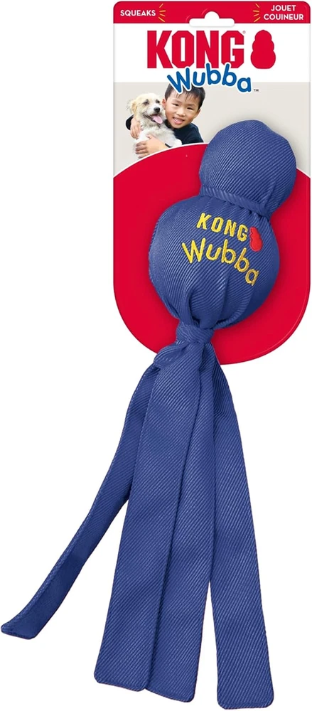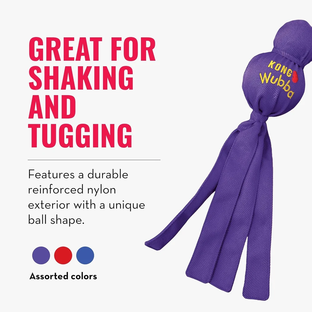 Tug Toy for Dogs: The KONG Wubba is a fun, interactive tug-and-toss toy perfect for casual games of tug of war and fetch Reinforced Fabric Toy for Playtime: This tug of war dog toy is designed with a durable reinforced nylon exterior and unique ball shapes Interactive Toy for Dogs: Ideal for interactive or solo play, this dog toy features long floppy tails for shaking and tugging instincts Outdoor & Indoor Dog Toy: KONG Wubba dog toy is designed with a squeaker for added engagement and reinforced fabric for long-lasting fun KONG: Innovating since 1976 to enrich the lives of pets with the highest quality pet toys and treats; all toys are designed and tested in Golden, CO, and are covered by KONG's Satisfaction Guarantee KONG Wubba is a fun, interactive toss and tug toy. Durable reinforced nylon fabric covers two rubber balls - a tennis ball on top and a squeaker ball beneath. Available in assorted colors.