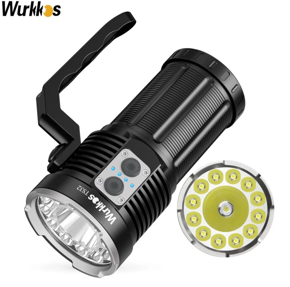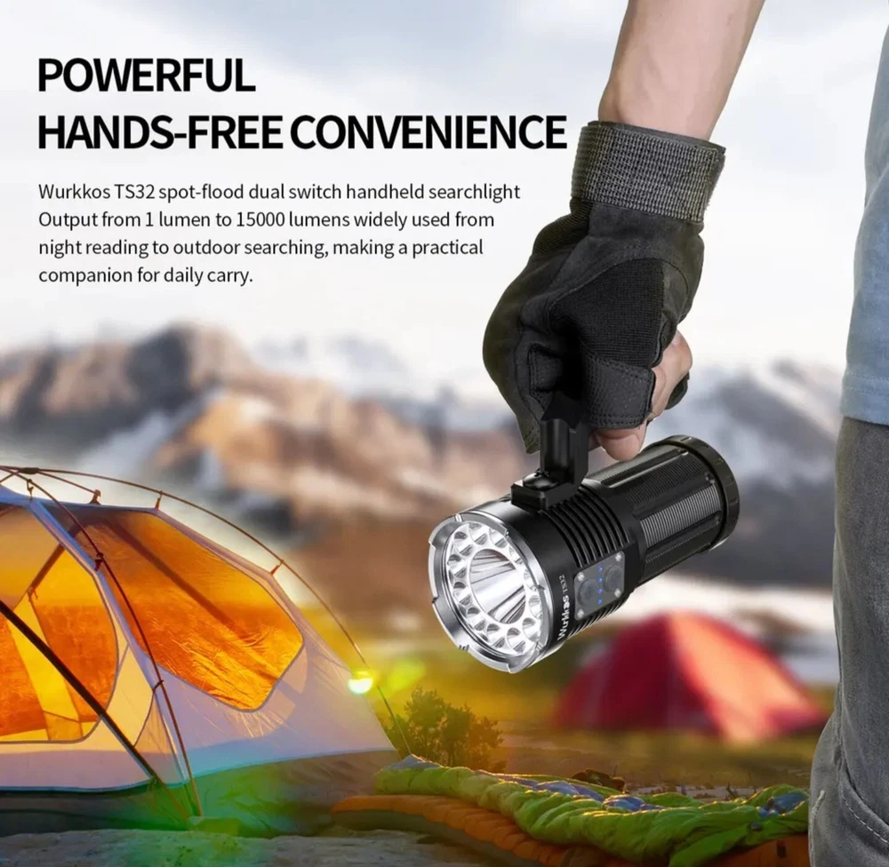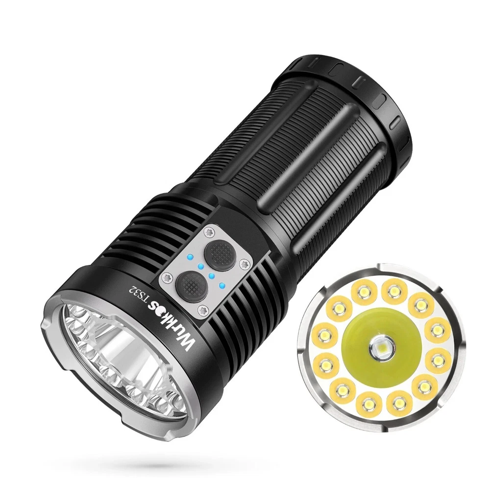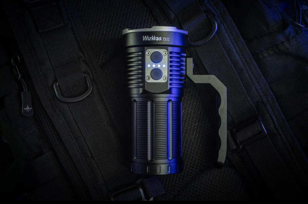 New Wurkkos TS32 Flashlight comes in original packaging. Comes with x1 Flashlight, x2 Spare O rings, x1 handle, x1 charging cable, x1 manual. (BATTERIES NOT INCLUDED) Message me about including batteries if needed for a small additional fee More specifications in the last photo Next day shipping from Minnesota. TS32 delivers a maximum output of, 13000 lumens with a maximum range of 590 meters . TS32 Come with 12 pieces around Floodlight High CRI LEDs and 1 pieces Middle spotlight LED , has double side switches to controls each beam,It also provides an improved, user friendly interface and simple one-hand operation. It is powered by triple 21700 Li-ion rechargeable battery and it is rechargeable via USB-C as well as Reverse charging for optimum convenience. The flashlight features two mode groups: Group 1 with stepped modes and Group 2 with a stepless ramping mode. Specifications Emitter: (High CRI) 12* LH351D 5000k +1* Luminus SFT40 Reflector: Smooth reflector Driver: FET circuit(floodlight)+Buck constant current circuit(Spotlight) Beam angle:spotlight 7°, floodlight 78° Operating voltage: 2.7V – 4.2V Battery options: 3* 21700 Li-Ion battery Dimension: 132.4mm (length) x 62.4mm (head diameter) Weight: 435 ±1 grams (without battery) Flashlight body: Aerospace grade 6061 grade aluminum alloy, CNC manufactured to hard-anodized to military grade specification type III, anti-abrasive finish to get solid built body, anti-crash geometry and better heat exchange. Toughened mineral glass lens Water resistance i.a.w. IP68 Mode Memory: memorizes the last brightness level used in the general modes (except Strobe) Reverse polarity protection to protect against improper battery installation. Advanced Temperature Regulation (ATR) technology: ATR will reduce the brightness level automatically when the driver temperature reaches 55℃ to prevent overheat