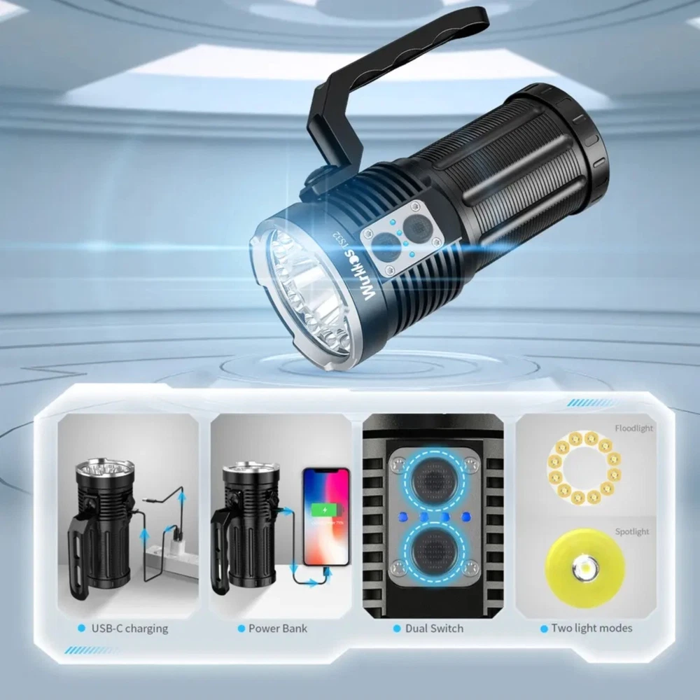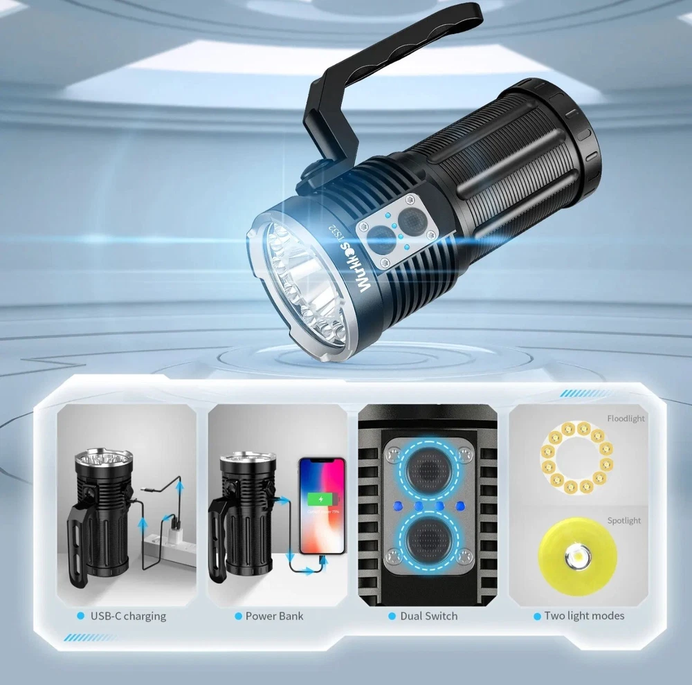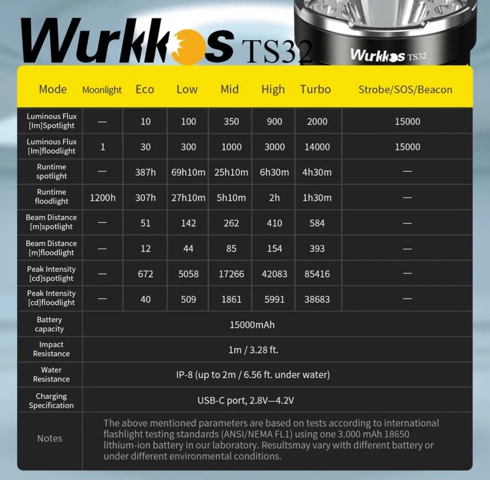 New Wurkkos TS32 Flashlight comes in original packaging. Comes with x1 Flashlight, x2 Spare O rings, x1 handle, x1 charging cable, x1 manual. (BATTERIES NOT INCLUDED) Message me about including batteries if needed for a small additional fee More specifications in the last photo Next day shipping from Minnesota. TS32 delivers a maximum output of, 13000 lumens with a maximum range of 590 meters . TS32 Come with 12 pieces around Floodlight High CRI LEDs and 1 pieces Middle spotlight LED , has double side switches to controls each beam,It also provides an improved, user friendly interface and simple one-hand operation. It is powered by triple 21700 Li-ion rechargeable battery and it is rechargeable via USB-C as well as Reverse charging for optimum convenience. The flashlight features two mode groups: Group 1 with stepped modes and Group 2 with a stepless ramping mode. Specifications Emitter: (High CRI) 12* LH351D 5000k +1* Luminus SFT40 Reflector: Smooth reflector Driver: FET circuit(floodlight)+Buck constant current circuit(Spotlight) Beam angle:spotlight 7°, floodlight 78° Operating voltage: 2.7V – 4.2V Battery options: 3* 21700 Li-Ion battery Dimension: 132.4mm (length) x 62.4mm (head diameter) Weight: 435 ±1 grams (without battery) Flashlight body: Aerospace grade 6061 grade aluminum alloy, CNC manufactured to hard-anodized to military grade specification type III, anti-abrasive finish to get solid built body, anti-crash geometry and better heat exchange. Toughened mineral glass lens Water resistance i.a.w. IP68 Mode Memory: memorizes the last brightness level used in the general modes (except Strobe) Reverse polarity protection to protect against improper battery installation. Advanced Temperature Regulation (ATR) technology: ATR will reduce the brightness level automatically when the driver temperature reaches 55℃ to prevent overheat