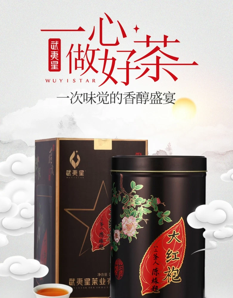 Type: Oolong Tea Manufacturer: Wuyi Star Net Weight: 125g Packaging: Tin Origin: Wuyi,Fujian,China Description: Big Red Robe oolong tea is one of famous Wuyi Cliff Tea from Wuyi Mountain of Fu Jian. Wuyi Cliff Oolong has long, curly leaves resembling iron shards. The leaves are hand-rolled into the traditional twisted Yan Cha form and pan-fired at their aromatic peak to arrest oxidation. Afterwards they are charcoal-fired in small batches to produce the deep green color and rich flavor that have made this tea one of China's most famous tea. The aroma of the dry leaf is deliciously sweet while the dark amber infusion is soft, smooth and malt. Rou Gui is famous for its lingering and rich flowery aroma, being so good that you will be captivated before you even drink the tea. The infusion produces cups of strong, amber-colored beverage. Brewing Guide: Place one spoon into an infuser, filter or teapot. Switch the kettle off, before it boils, when you hear the water rumbling. Add the hot, but not boiling, water and infuse for 3 minutes. Serve immediately or remove leaves to prevent spoiling.