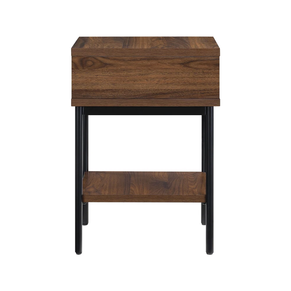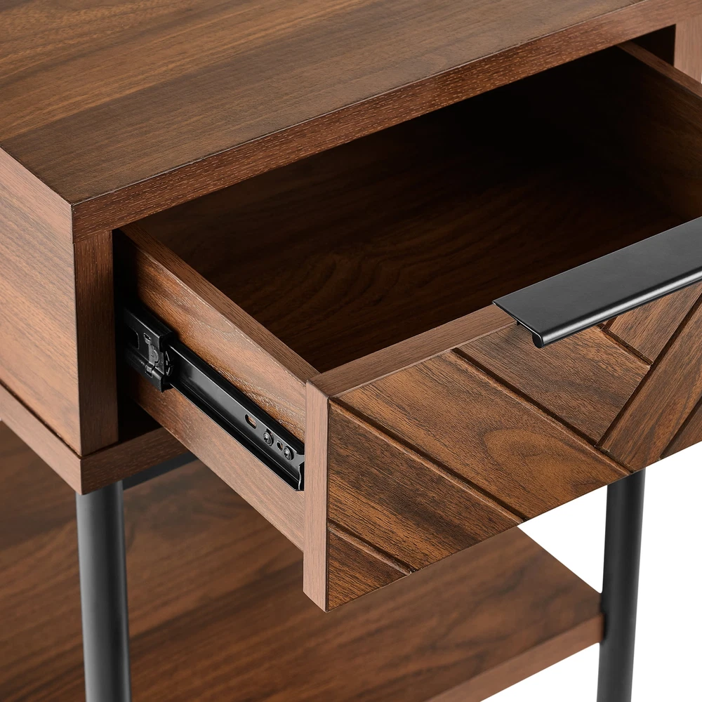 Elevate your living space with the Wyatt Geo End Table , where modern elegance meets craftsmanship. This charming side table is a versatile companion for your daily life. Imagine having your essentials within arm's reach, neatly stored away in the upper drawer. From remotes to keys, or even a cherished novel, this table keeps everything organized while adding a dash of style. The drawer boasts a contemporary herringbone pattern, enriching the table's texture and depth, making it a standout piece. The open shelf offers the perfect spot for your decorative pieces, greenery, or your favorite magazines, blending functionality with aesthetic appeal. Resting on sleek black metal legs, this side table presents a modern silhouette that complements its rich brown finish beautifully. The minimalist design adds a contemporary touch, and the quality engineering ensures stability and durability for years to come. Designed to harmonize with any room, the Wyatt Geo End Table pairs splendidly with the Wyatt TV Console, Coffee Table, or other items from the Better Homes and Gardens Wyatt Collection (sold separately). Whether it's set beside a cozy sofa or a comfy armchair, this side table is a chic and practical addition to your home. Its blend of form and function effortlessly enhances any decor, bringing a timeless charm and a touch of sophistication to your living space. Upper storage drawer for stowing remotes or other small accessories Large open lower shelf Spacious tabletop for conveniently placing remotes, books, or beverages Stylish herringbone pattern drawer fronts Soft-closing, ball-bearing drawer glides Sleek, modern finger pull drawer handles Black metal legs Walnut brown finish Pair with other items from the Wyatt Collection (Sold Separately) Assembly required Dimensions: 17 in x 18 in x 25.25 in (43.2 cm x 45.7 cm x 64.1 cm) Packaging Dimensions: 22.5 in x 20.375 in x 13.5 in Model# BH1425004710002