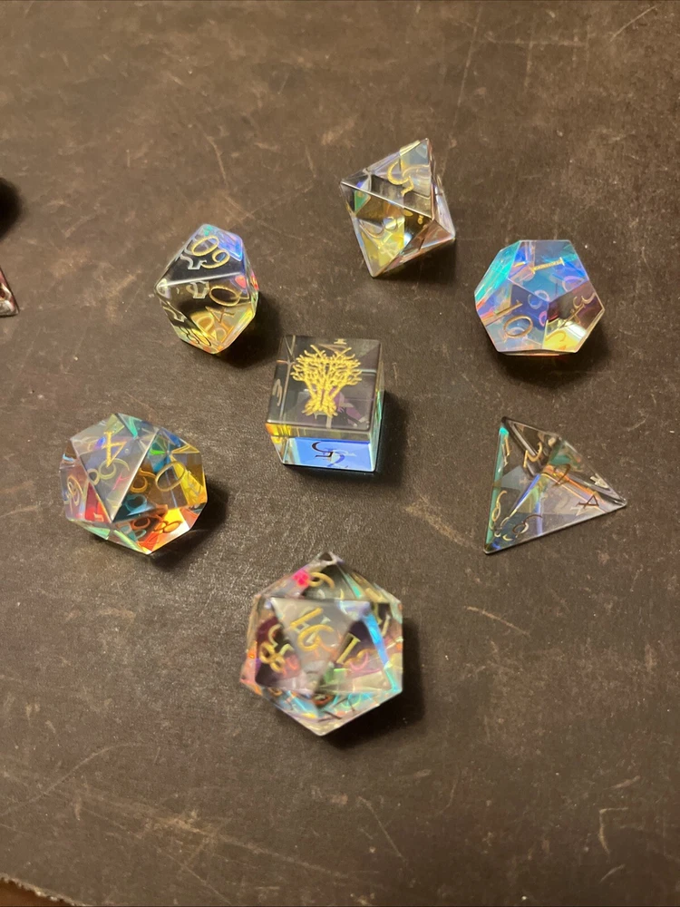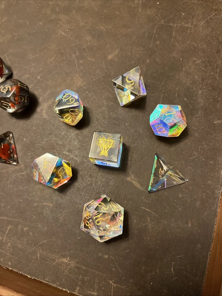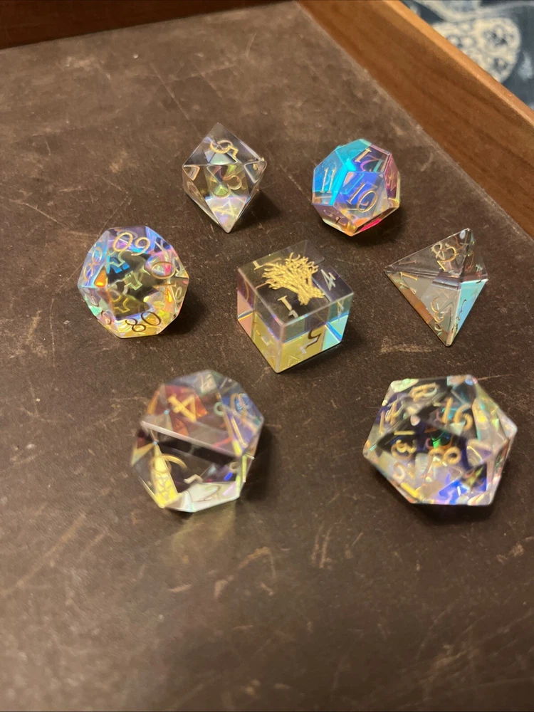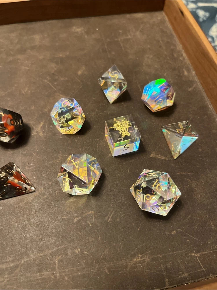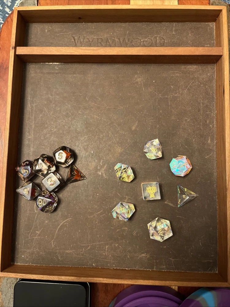 Beautiful set of dice. The prismatic ones with the wyrmwood logo are glass and absolutely gorgeous comes with a cool soft shell muticolor case. The other are a rainbow style with sparkling and heart/floral art floating within. Also comes with a case. Those ones aren't glass, so make for a good all purpose set to play with, especially when you don't have a table top die container to play on or a suitable surface. The wyrmwood glass need to be handled with care or they will surely crack or break! In amazing condition! They were barely used by the prior owner. Also comes with the wyrmwood tables top dice tray. Has some marks but overall in solid shape and is a must have for the glass prismatic dice!