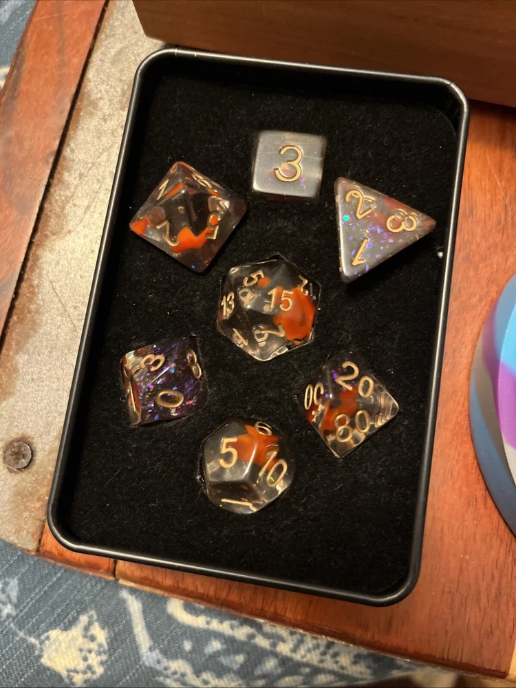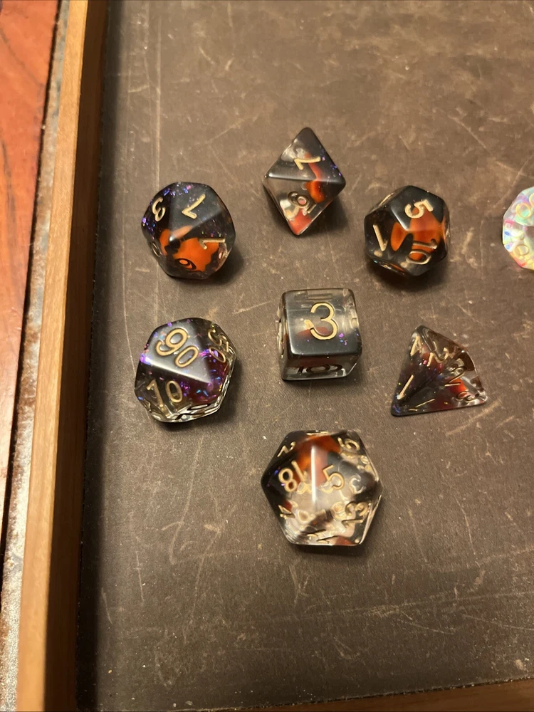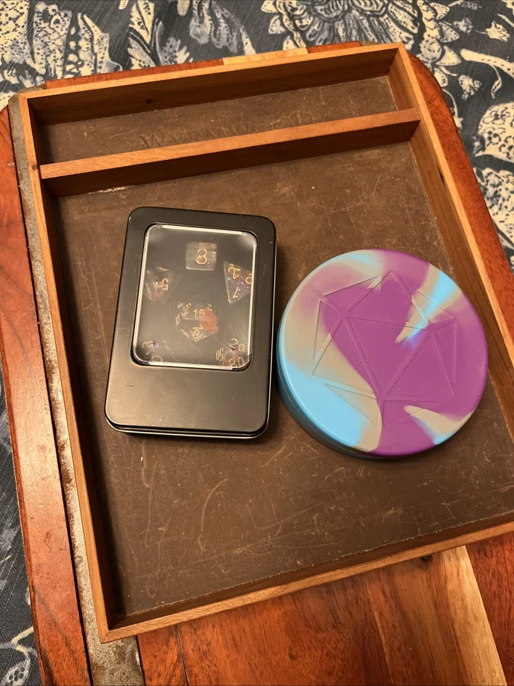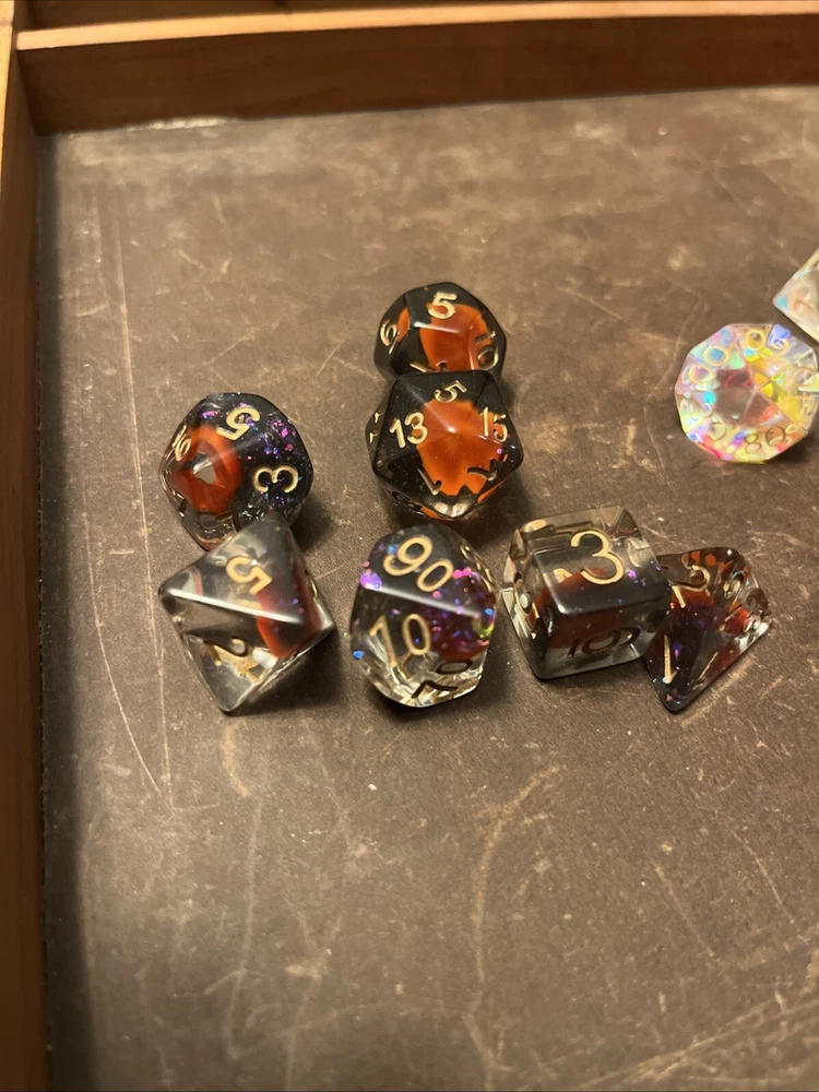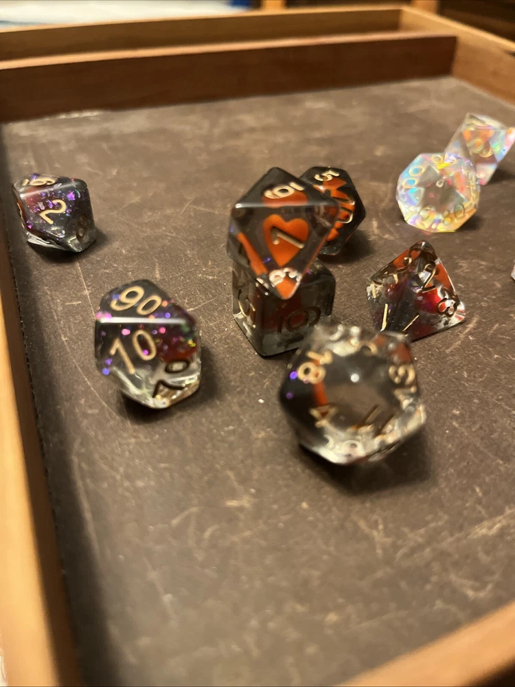Beautiful set of dice. The prismatic ones with the wyrmwood logo are glass and absolutely gorgeous comes with a cool soft shell muticolor case. The other are a rainbow style with sparkling and heart/floral art floating within. Also comes with a case. Those ones aren't glass, so make for a good all purpose set to play with, especially when you don't have a table top die container to play on or a suitable surface. The wyrmwood glass need to be handled with care or they will surely crack or break! In amazing condition! They were barely used by the prior owner. Also comes with the wyrmwood tables top dice tray. Has some marks but overall in solid shape and is a must have for the glass prismatic dice!
