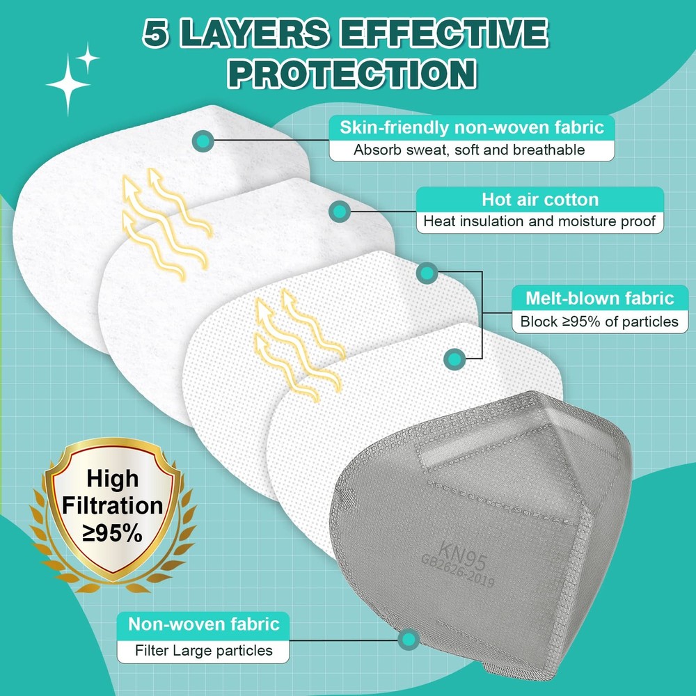 5-ply KN95 Face Mask is Suitable for Adults’ Daily Protection 【Individually Wrapped Masks & 5 Colors】Each KN95 face mask for men and women is individually sealed, easy to carry and share. Disposable face masks for adults come with 20 pcs and 5 different pure paramount colors. The colors we choose are suitable for daily use. Simple but not monotonous, you can choose a different color each time according to your preferences and mood. 【Compliance & Security】Executive Standard: GB2626-2019. The filter efficiency of this KN95 mask is greater than 95% with 5 layer protection which is tested by NPPTL. Make sure to discard the face mask when it becomes visibily ditry or breathing resistance increases remarkably. 【Comfortable Humanized Design】With a 3D structure design, flexible metal nose clip fixed inside the masks, our disposable KN95 face masks which size at 8''*7.5'' can fit your face tightly and provide sufficient breathing space. The high elastic and soft ear loops can reduce skin irritation, eliminate pressure to the ears. 【Daily use】All well-selected materials and components bring you and your family high-quality products you can trust, ultra-soft and comfortable. You can wear these breathable face masks KN95 every day in daily travel, indoor, outdoor, and public places like schools, offices, supermarkets, factories. 【Disclaimer】This KN95 face mask is NOT an N95 mask. For more information about KN95 masks please see the following before you purchase: amazon.com/AboutKN95s.