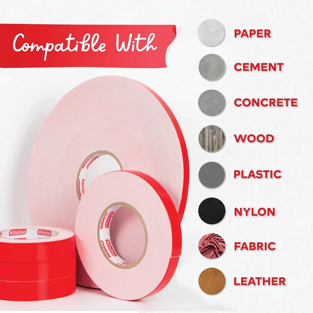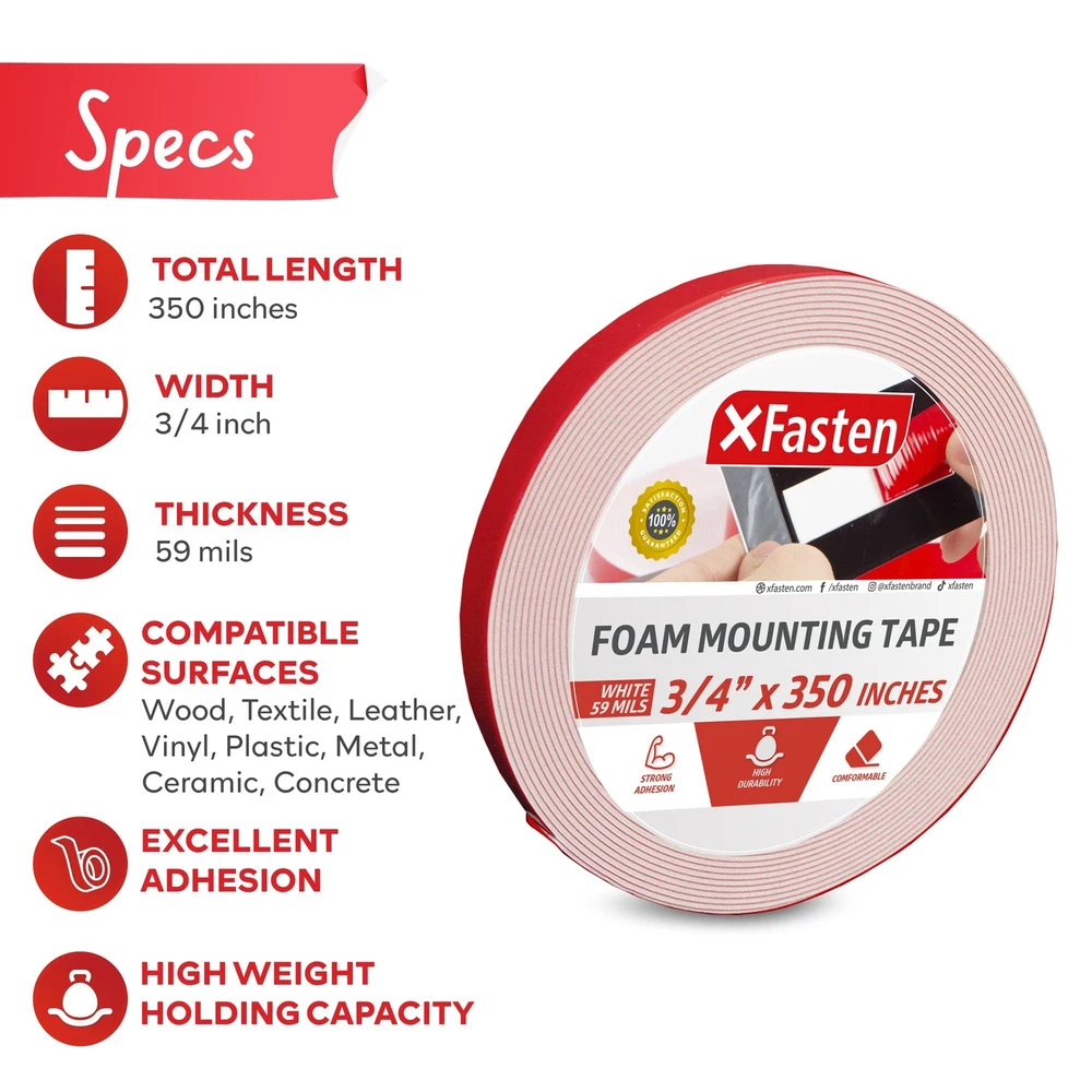 XFasten Double Sided Tape Foam Mounting Tape, 3/4-Inch x 350-Inch Product Overview ABOUT THE XFASTEN DOUBLE-SIDED FOAM MOUNTING TAPE The XFasten Double Sided Foam Mounting Tape is an efficient exterior and interior mounting tape that can mount objects up to 3 pounds together per square inch of tape in a long term basis. It works on both even and uneven surfaces. Where it shines is on exterior use where it performs better compared to other leading brands on textured, rough, and uneven surfaces. Read more COMPATIBLE WITH TEXTURED DRYWALL CONCRETE WOOD CARTON Read more WHERE CAN YOU USE THE XFASTEN DOUBLE-SIDED ACRYLIC MOUNTING TAPE? Perfect for layering on greeting cards, DIYs and other arts and crafts projects. It adds an extra dimension to greeting cards, taking your art into a whole new level.Mounting photos and poster on the wall. Mounting bathroom accessories and home decors. Mounting light objects such as nameplates and exterior signage on bricks, concrete and other rough surfaces. Can be used as a noise cancellation device in between doors to prevent loud banging noise when the door is closed. OTHER USEFUL FEATURES Residue-Free Strong Adhesion High Durability High Weight Holding Capacity Read more KEY FEATURES PERFECT SOLUTION TO MOUNT OBJECTS ON WALLS The XFasten Double-Sided Foam Mounting Tape is a versatile replacement for bolts and screws on even and uneven surfaces for interior or exterior use. WORKS ON VARIOUS SURFACES With its unparalleled versatility, the XFasten Double-Sided Foam Mounting Tape fares well on uneven, irregular or highly textured surfaces such as cement, brick and concrete.. IDEAL FOR CRAFTERS If you love arts and crafts, the XFasten Double-Sided Foam Mounting Tape is for you. It works well for layering rubber stamp projects, cards, invitations and other arts and crafts projects. EASY TO INSTALL The XFasten Double-Sided Foam Mounting Tape is an instant and mess-free tape due to its easy-to-peel backing and high sheer resistant adhesive. Read more XFasten Double-Sided Acrylic Mounting Tape, 1" x 450" XFasten Double-Sided Foam Mounting Tape, 1" x 150" XFasten Double-Sided Foam Mounting Tape, 1/2" x 36 Yards XFasten Double-Sided Mounting Dots 1" (Pack of 80) XFasten Double-Sided Mounting Squares 1 " (Pack of 80) XFasten Double-Sided Tape, 1.5" x 15 Yards Color Clear White White White White White Material Type Acrylic Adhesive Compressible and Conformable Urethane Foam Compressible and Conformable Urethane Foam Compressible Foam Material Compressible Foam Material Poly-carbonate Film Tape Item Weight 10.4 ounces 1.6 ounces 4 ounces 0.8 ounces 0.64 ounces 0.8 ounces Features Versatile replacement for bolts and screws on even and uneven surfaces for interior or exterior use. Ideal for mounting accessories, photos, paintings, frames and decors in the kitchen or bathroom. Works well for layering rubber stamp projects, cards, invitations and other arts and crafts projects. Fares well on uneven, irregular or highly textured surfaces such as cement, brick and concrete. Instant and mess-free bond due to its easy-to-peel backing and high sheer resistant adhesive. Details Manufacturer: XFasten Brand: XFasten Item Weight: 1.76 ounces Product Dimensions: 350 x 0.75 x 0.75 inches Item model number: OP-6163 Is Discontinued By Manufacturer: No Material Type: Foam,Rubber Number of Items: 1 Manufacturer Part Number: FMT350 Quality Products Have peace of mind knowing that your order will arrive original factory sealed packaging. That means that you'll have the full force of the manufacturer's warranty to protect your purchase. Fast and Free Shipping You're already purchasing the item. Why pay additional for shipping, especially slow shipping? We get your order shipped out and delivered to your doorstep as quickly as possible. Commitment We are committed to making sure that you leave this transaction satisfied. That means having access to real people that get your questions and concerns answered quickly. Give us a shot and we will make sure that you will look to us again!