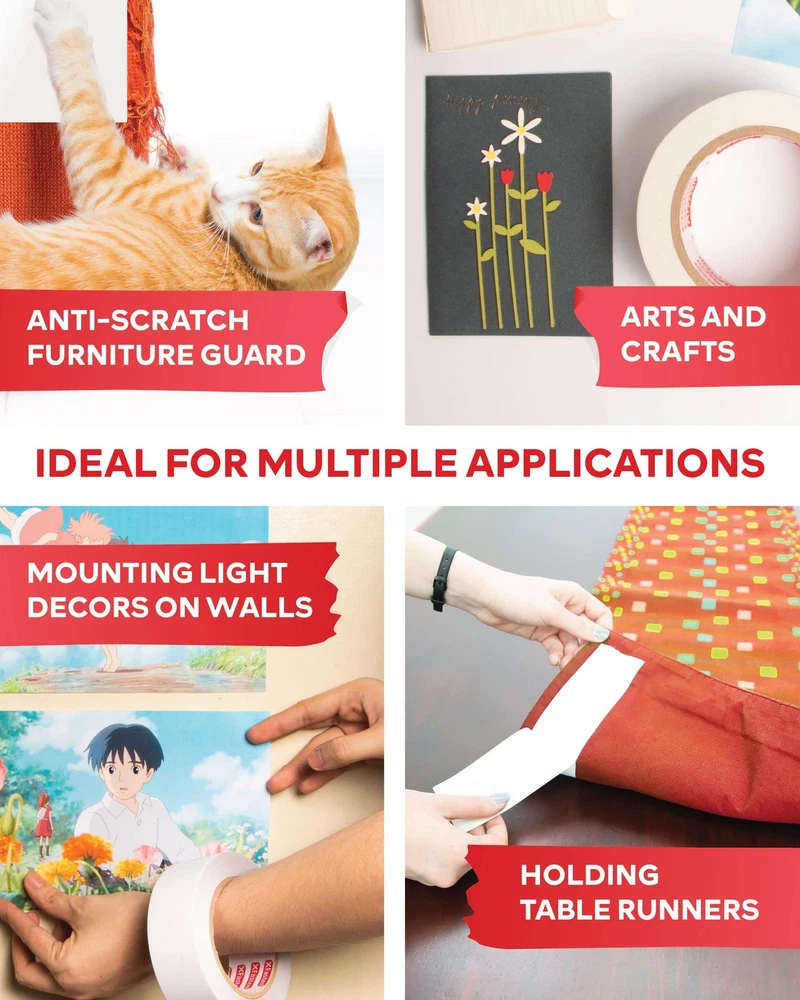The Easy to Tear Double Sided Duct Tape is the most convenient tear-by-hand tape of , cutting your preparation time by half- allowing you to focus more on enhancing your projects. It adheres to almost all surfaces, making this double-sided tape a must-have product for many households in America. It can adhere to almost all surfaces, may it be smooth, rough or uneven- something which most double sided duct tapes can’t do today. This double sided duct tape is guaranteed to adhere to the following surfaces but is certainly not limited to the ones listed : -Delicate wooden finishes and surfaces -Rug, Wall-to-wall carpets and runners -Stone and marble tiles -Cement, concrete and brick -Metal, plastic and other decorative surfaces -Nylon, cloth and other fabric materials -Carpet, Leather and other furniture finishes Paper, Cardboard and other arts and crafts materials Why Choose The Double Sided Tape? The Easy Tear 2 Sided Tape sports a durable nylon-cotton cloth inside layer sandwiched with a strong adhesive on both sides. Has the perfect balance of strength and gentleness to even the most delicate surfaces. Guaranteed to leave no residue behind Overall, the Double Sided Tape is a cost-effective premium adhesive solution for your home and office projects. Where Can You Use The Double Sided Tape? -Woodworking and guitar making -Stabilizing Carpets and Rugs on top of your floor or carpet/area rug -Arts and Craft Project -Pet Anti-Scratch Shield and Training Tape For Furnitres and Leather seats -Preventing carpets from sliding -Mounting Light Objects on walls -Cloth and Dress Tape alternative -Heel Protection for sandals and shoes without using socks Easy to tear Double-Sided Tape that is designed for applications that need strong bonding. Tears cleanly only by hands, no scissors or cutter needed! Mess-free adhesive EMPOWERS the AVERAGE AMERICAN to come up with NEAT and PROFESSIONAL APPLICATIONS. Will not leave a sticky residue when removed and will not damage wall paint. Tear-by-hand textile backing cuts and saves preparation time by half, enabling you to focus more on further polishing your projects’ quality conveniently! Extreme Tackiness of the double sided sticky adhesive provides secure bonding but is still easy to uninstall making it ideal for DECORATING EVENTS ON TEMPORARY SPACES such as auditoriums, churches, conference rooms, classrooms, and apartments. Double Sides Heavy Duty Tape that can protect leather seats and furniture from pet scratches, and rug to carpet gripper applications. Ideal tape for Woodworking, DIY, craft projects and gift wrapping.