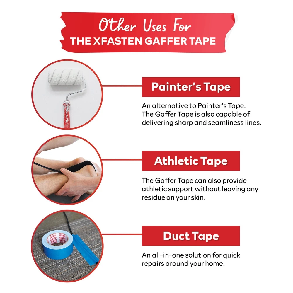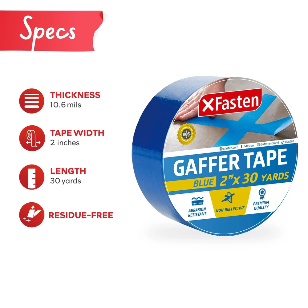 XFasten Gaffers Tape 2 Inch X 30 Yards, Blue, Multipurpose Pro Gaff Tape for ... Product Overview Size: 2 Inches x 30 Yards Color: Blue Read more Read more XFasten Gaffer Tape XFasten Gaffer Tape XFasten Gaffer Tape XFasten Gaffer Tape XFasten Gaffer Tape XFasten Gaffer Tape Size 2" x 30 Yards 2" x 60 Yards 3" x 30 Yards 2" x 30 Yards 3" x 30 Yards 2" x 30 Yards Color Black Black Black White White Yellow Material 95% Cotton, 5% Rayon 95% Cotton, 5% Rayon 95% Cotton, 5% Rayon 95% Cotton, 5% Rayon 95% Cotton, 5% Rayon 95% Cotton, 5% Rayon Uses TV, Theater, Studio, Automotive, Photography, Music, and other professional needs TV, Theater, Studio, Automotive, Photography, Music, and other professional needs TV, Theater, Studio, Automotive, Photography, Music, and other professional needs TV, Theater, Studio, Automotive, Photography, Music, and other professional needs TV, Theater, Studio, Automotive, Photography, Music, and other professional needs TV, Theater, Studio, Automotive, Photography, Music, and other professional needs XFasten Gaffer Tape XFasten Gaffer Tape Pro XFasten Flourescent Gaffer Tape ATack Gaffer Tape Pro Size 2" x 30 Yards 2" x 30 Yards 1" X 18 Foot 2" x 30 Yards Color Red Black Neon Green, Orange, Pink, Yellow, and Blue Black Material 95% Cotton, 5% Rayon Stealth Reinforced Textile Backing and Acid-Free Silicone Adhesive Cotton Fabric Stealth Reinforced Textile Backing and Acid-Free Silicone Adhesive Uses TV, Theater, Studio, Automotive, Photography, Music, and other professional needs TV, Theater, Studio, Automotive, Photography, Music, and other professional needs Ideal for decorating walls and floors for parties TV, Theater, Studio, Automotive, Photography, Music, and other professional needs Features BLUE GAFFERS TAPE WITH STRONG ADHESIVE. Marking your equipment is crucial, especially if you work with different production staff and multiple locations. Distinguish your equipment from the rest using this blue gaffer tape 2 inch. PREVENT ACCIDENTS DUE TO TANGLED CORDS. Safety is XFastens priority by bringing quality-tested products like this pro gaffer tape. Avoid accidents because of your unruly wirings on your working locations. NON-REFLECTIVE MATTE FINISH. This pro gaff tape is engineered for industry professionals to mark critical areas where high visibility is required. It also has a non-reflective feature, so it wont ruin the camera shots. MULTIPURPOSE GAFF TAPE. The XFasten gaff tape 2 inch can be used for more applications than you think! Use it as a stage marker, equipment tag, bundling of cables, or even fixing your yellow carpet in place, and a lot more. LEAVES NO RESIDUE. Pro gaff tapes are known to have strong adhesive but are gentle to the surface. You wont have to worry about sticky goo because this no residue tape got you covered! WATER-RESISTANT PRO GAFF TAPE. This gaffers tape 2 inch is not easily penetrated by water, so its safe to use in locations that might be affected by moisture or rain showers. IDEAL PARTNER FOR WHITE GAFFERS TAPE. White gaffers tape 2 inch is a staple tool for photographers and production people. Add this yellow matte tape for your other requirements like marking equipment low light locations. SURFACE-SAFE, EASY TO REMOVE. This gaffer tape is compatible with most surfaces like plastic, vinyl, wood, metal, cement, leather, and glass. Its also easy to remove and move places if necessary. RIPS INTO STRIPS. There is no need to prepare other tools like scissors when using this blue pro gaffers tape because you can easily rip it by hand and strip it to the length and width you desire. STICKS TO IRREGULAR SURFACES. The XFasten gaffer tape 2 inch is ideal for indoor and outdoor locations because it can conform to even irregular surfaces. Use this if you need to stick to circular or jagged surfaces. Details Is Discontinued By Manufacturer : No Product Dimensions : 4.53 x 1.97 x 1.97 inches; 11.36 Ounces Item model number : GT230 Date First Available : December 18, 2016 Manufacturer : XFasten Best Sellers Rank: #7,630 in Industrial & Scientific (See Top 100 in Industrial & Scientific) #17 in Gaffer Tape #17 in Gaffer Tape Customer Reviews: 4.4 out of 5 stars 2,484 ratings Quality Products Have peace of mind knowing that your order will arrive original factory sealed packaging. That means that you'll have the full force of the manufacturer's warranty to protect your purchase. Fast and Free Shipping You're already purchasing the item. Why pay additional for shipping, especially slow shipping? We get your order shipped out and delivered to your doorstep as quickly as possible. Commitment We are committed to making sure that you leave this transaction satisfied. That means having access to real people that get your questions and concerns answered quickly. Give us a shot and we will make sure that you will look to us again!