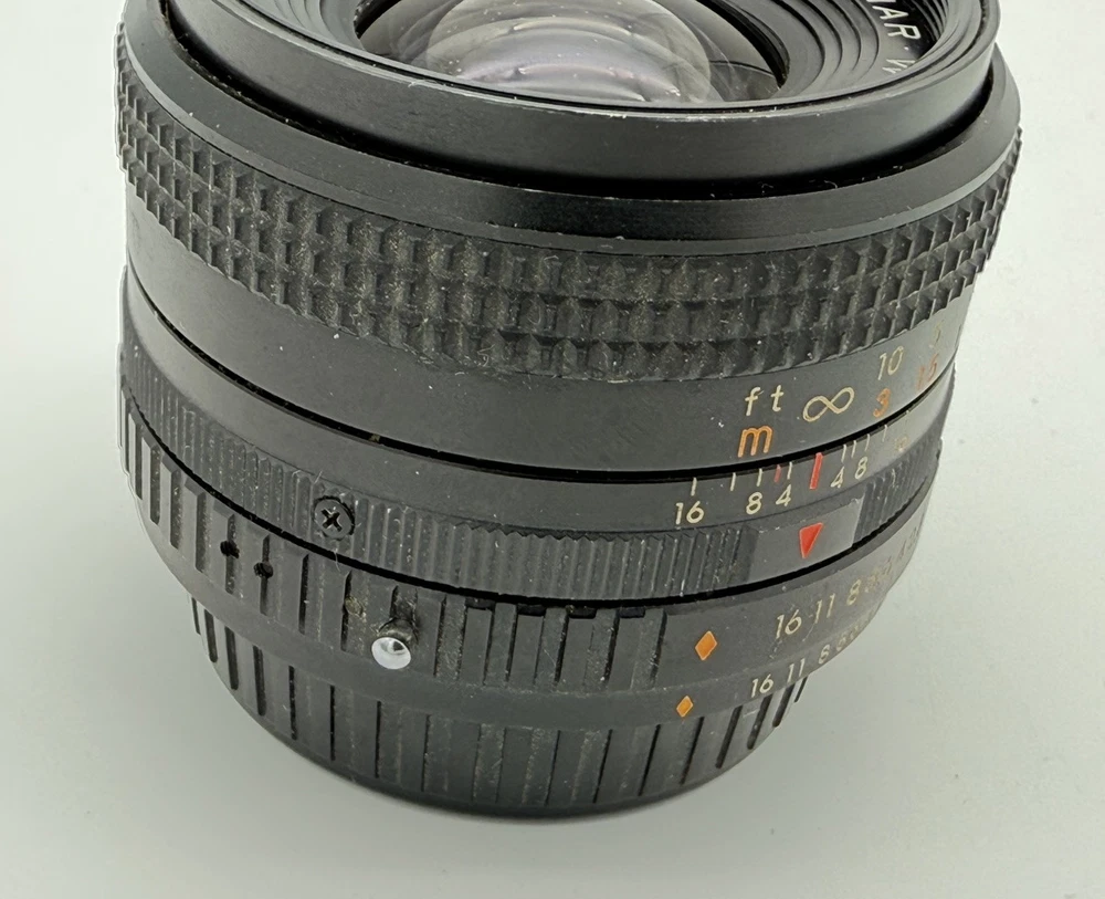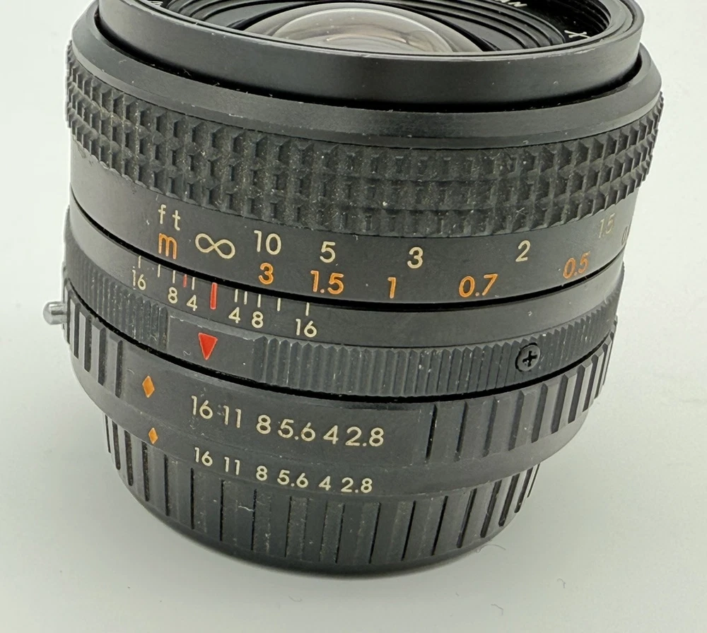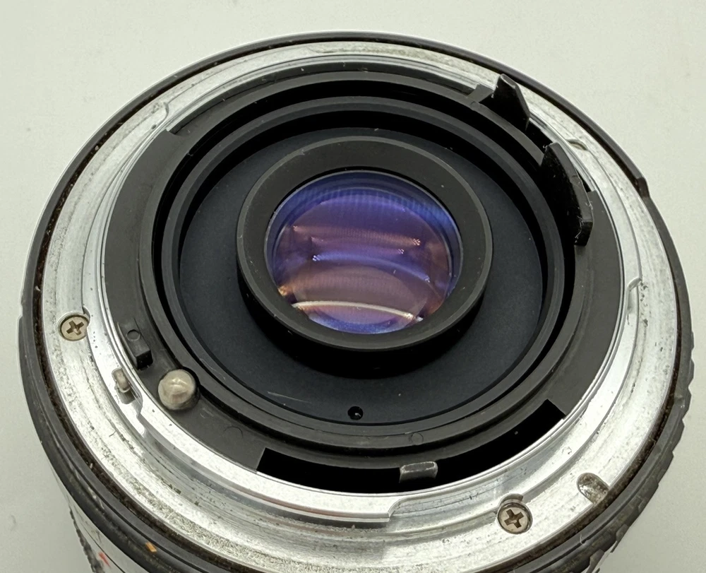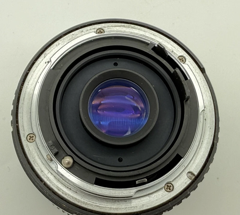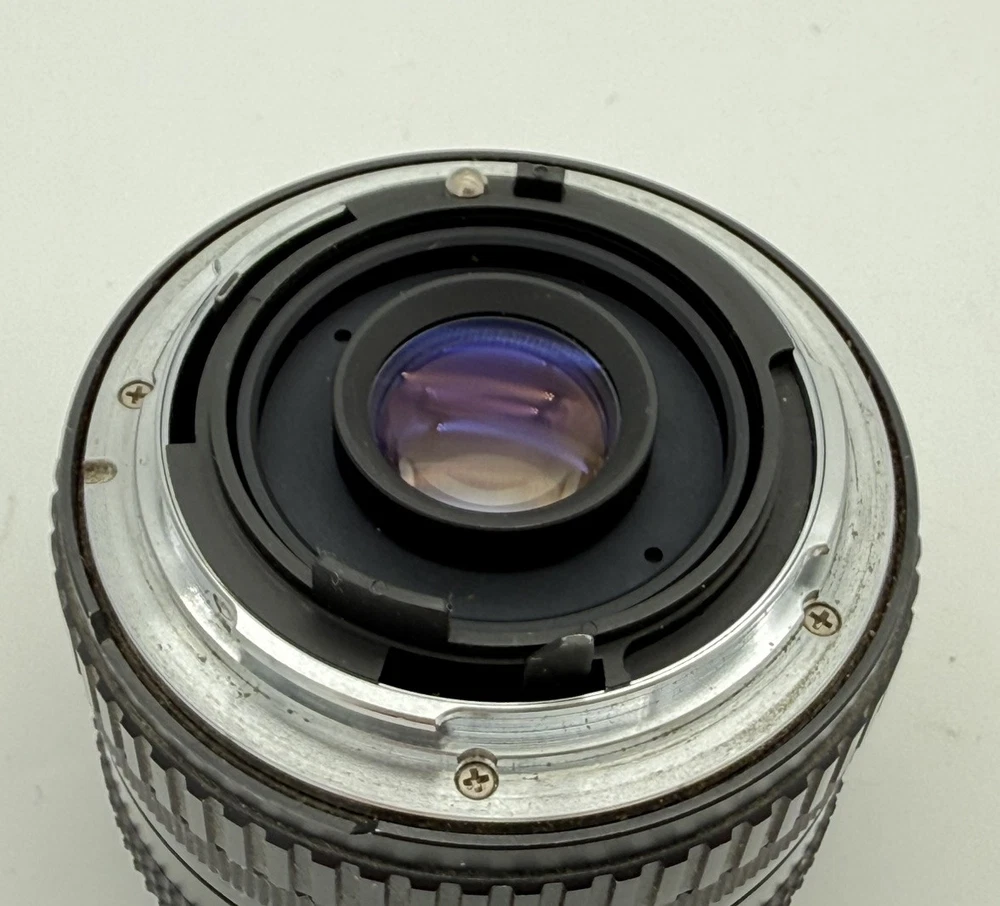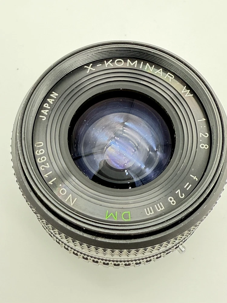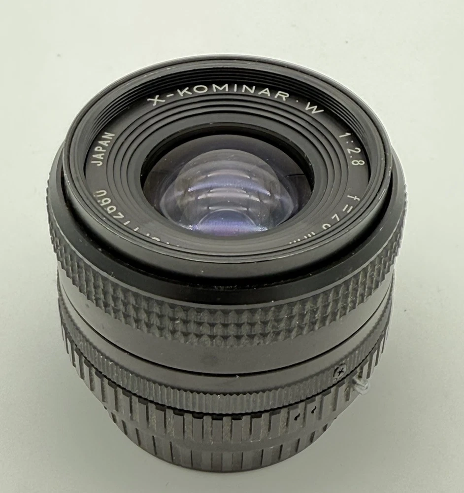 This is a vintage Nittoh Kogaku X-Kominar wide angle lens with a focal length of 28mm and a maximum aperture of f/2.8. It is compatible with Fujica Fujifilm cameras using a Fujifilm X mount. Manufactured in Japan in the 1980s, this manual focus lens is made of aluminum and has a model number of No. 112660. It includes a 49mm compatible filter size and lens front. No filter included. Rear cap only Lens appears clear with some typical small dust particles. Aperture opens but seems to close slowly.