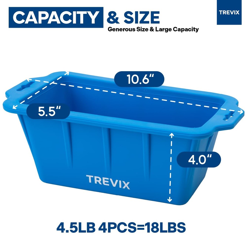 The Extra Large Ice Cube Tray offers durability and convenience, producing large, slow-melting ice cubes for longer-lasting cold. Made from high-quality, food-grade silicone, it maintains shape through repeated freezing. The flexible material enables easy ice removal. Versatile and perfect for ice baths, drinks, and more Specifications: - Material: BPA-free, food-grade silicone - Size: 10.63 x 4.06 x 5.51 inches(per mold) - Quantity: 4-piece set - Capacity: Up to 18 lbs of ice (total) Durable XL Ice Block Mold - The 's 4-piece tray features food-safe silicone, ensuring no harmful or odor releases. Its durability maintains shape even when full, offering a reliable and safe ice-making solution.