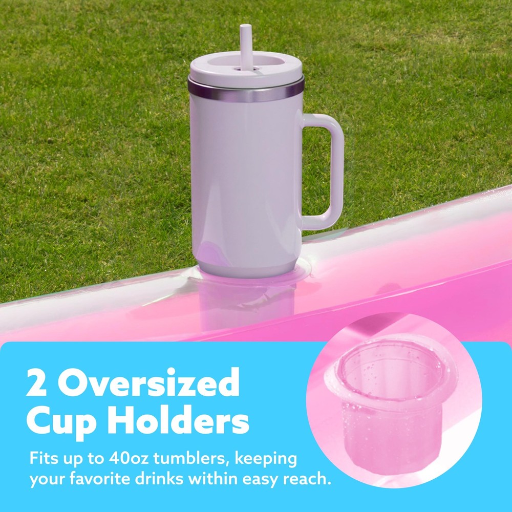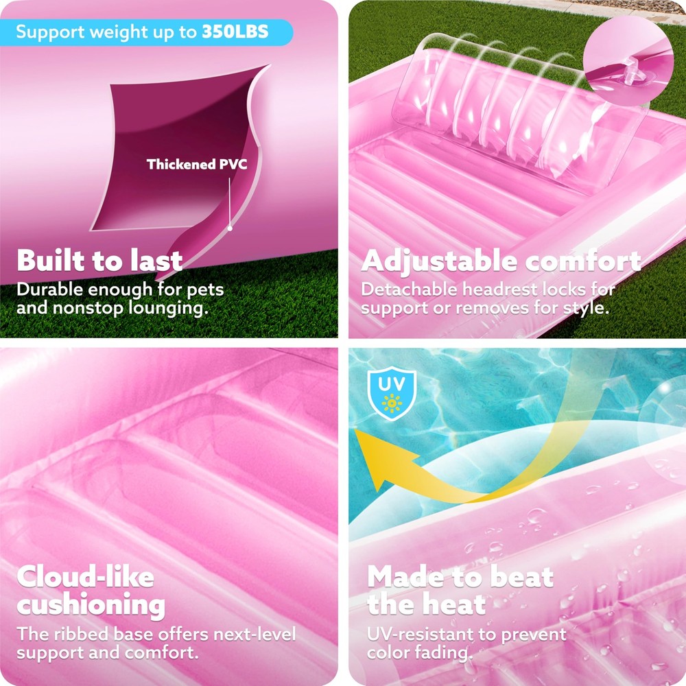 XL Inflatable Tanning Pool Lounge Float, 85" x 57" Extra Large Sun Tan Tub Adult Pool Floats Raft for Pool Sunbathing Suntan Blow up Pool Lounger Tanning Bed Floatie for Adults, XL-Pink INCLUDES. Packaged includes 85” x 57” extra large inflatable suntan pool float featured with Inflatable base for extra comfort, drink holders, removable headrest, wrap around rope EXTRA LARGE. 85” long and 57” wide extra large size could hold up to 2 people, enjoy your summer tanning along or share sunbath with your friend or family member. PREMIUM QUALITY. This Tanning Lounge is made of thick, heavy-duty and UV resistant PVC with thickness to 0.3mm. BUILT FOR COMFORT. Our Tanning Pool is built with a removable pillow and ribbed air cushion base. The pillow provides your neck and back additional support, and the ribbed air cushion base provides you extra comfort lounging sun tanning experience. ADDED STABILITY. Our pool bed float has great integrated pad eyes with wrap-around grab line for maneuverability. Tie to other floats or the deck and enjoy! KEEP COOL AND RELAX. Fill this pool lounge raft with water to turn it into a suntan tub, lay and tan in the water to prevent getting overheated. Clear top design to keep you and your lounge cool, enjoy the sunbath and relax. 2 CUP HOLDERS. Featured with cup holders, bring your beverage when you enjoy the sunbath tanning.