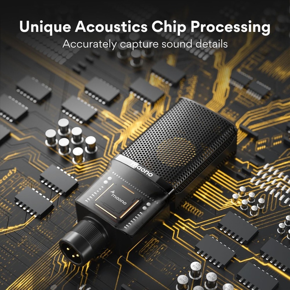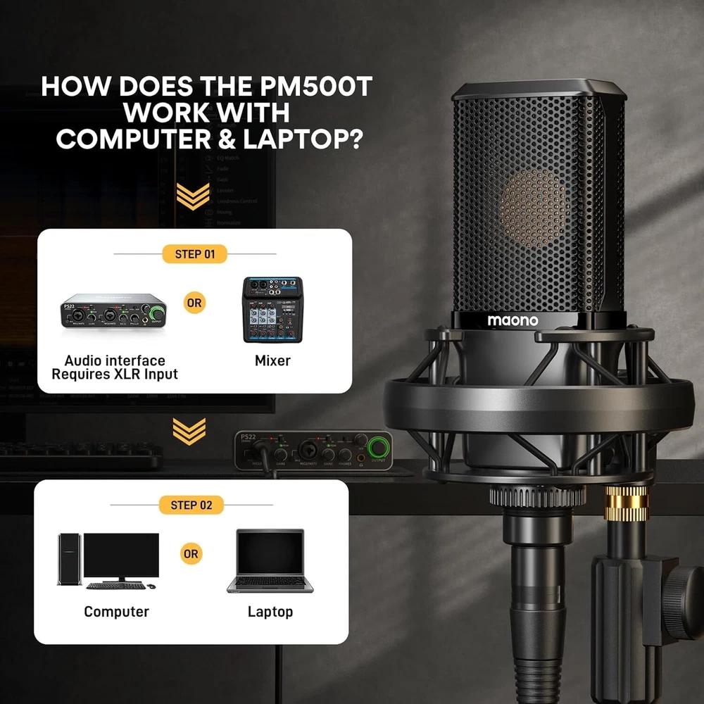 XLR Condenser Micro with 34mm Large Diaphragm, Professional Cardioid Studio Mic for Podcasting, Recording, Streaming, Vocals, Voice Over, Music, ASMR Studio Grade Sound: The XLR condenser micro features a custom-designed 34 mm large diaphragm gold condenser capsule and offers a dynamic range of 20Hz - 20kHz, low noise, ensures every recording is incredibly clean, high sensitivity and extremely high SPL handling that you will no trouble recording loud sound sources, from guitar cabinets to drums. The XLR mic optimised for Professional music creation, instrument singing, vocal, podcast recording with detailed, full and warm sound Cardioid Pattern: Cardioid pickup shows excellent off-axis sound suppression capability of reducing the sound pickup from the side and rear, thus eliminating background noise. Accurate capture of sound details, silky top end, detailed midrange, and warm bass make it ideal for recording a wide range of instruments as well as vocals, from drums and percussion to acoustic instruments and guitar cabs External Power Source Required: The Vocal condenser micro with premium XLR cable for plugging into an audio mixer, 48V phantom power or interface, so you can get recording right away. the studio micro with good shielding and balanced output for a more clear, rich and stable sound, makes the podcast audio immersive. If you want to connect the XLR condenser micro to the Windows laptop/iOS/PAD/mobile , please make sure you have your Phantom Power ready High Specification: The circuit design utilizes premium components from top-tier manufacturers and a tailor-made permalloy audio signal transformer to provide low self-noise and exceptional sound capturing, clearly restored recording sound. Ideal for vocalists, music instrument performers, podcasters, live streamers, broadcasts, ASMR, and studios Premium Metal Structure: The body of this XLR condenser micro is made with zinc alloy and treated with multi-layer coatings. Highly corrosion resistant, Simple and atmospheric design and protects the stability of the micro's mechanical structure, ensure the purer audio signal and delivery better sound quality. Upgrade Accessories: The included metal pop filter, shock mount and desktop stand can protect the micro all-around, it isolates the mic from physical vibration. Users can easily start their pro-level content creation with the accessories provided Package List: The kit comes with XLR condenser micro*1, metal desktop stand*1, shock mount*1, metal pop filter*1, XLR to XLR cable*1, User manual*1 The video showcases the product in video guides you through product video compares multiple video shows the product being unpacked.