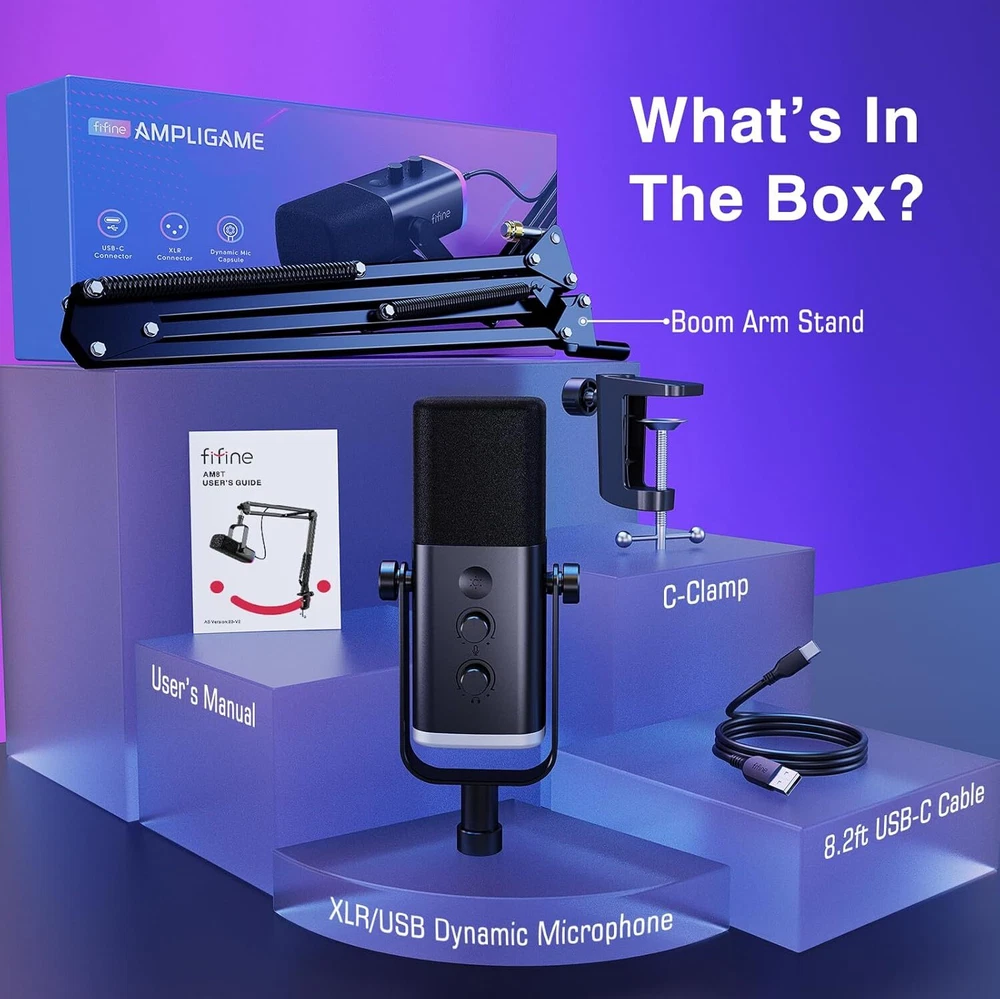 USB/XLR Connectivity-Versatile PC gaming microphone kit with USB compatibility for PC in streaming or recording and XLR compatibility for mixer or sound card connection in vocal, podcast, or musical instruments creation. Vibrant RGB Light-The streaming microphone RGB illuminates your gaming setup with customizable RGB lighting for a visually stunning game experience. Enhanced Features-The PC gaming microphone USB kit includes a boom arm for easy positioning, mute button and gain knob for precise control, headphones jack for real-time monitoring, and headphone volume control while streaming or recording. Decent for Gamers and Streamers-The XLR microphone designed specifically to meet the needs of gaming enthusiasts and streamers. Ideal for various applications, including gaming, streaming, podcasting, voiceovers, and more, which also works with popular streaming software like OBS and Streamlabs. Recording Microphone Kit-The dynamic microphone is more convenient for working from home or going out for podcasts, and the complete accessories allow for faster recording work due to its simple straightforward assembly. Tips: 1) The desk clamp is suitable for desktop with a thickness of less than 2 inch. 2) AM8T package comes with dynamic microphone, Boom Arm Stand, C-Clamp, 8.2ft USB to USB-C Cable, User's Manual. 3) XLR cable NOT included. Product Description Step up your audio recording via XLR interface. Balanced XLR interface elevates stable vocal quality. Grant the attention from your audience. Deliver sound near enough as close to real life. 1 Studio XLR Compatibility 2 Vocal Intelligibility 3 Pro-Level Streaming 4 Natural Warmth of Sound Give cleanly direct use right out of the box. Chat with team friends as shoulder by shoulder. Crisp and clean pulls in the distance from the audience. 1 Easy USB Compatibility 2 Elevating Game Chatting 3 Impressive Streaming 4 Function Key Three modes with over 10 colors for stunning style. Switching between daily gaming and studio recording. Isolate the audio from ambient noise. Easy to stretch and adjust for suitable angles. Pull closer to mouth being away from mechanical noises. Fits most of stand securely for use flexibility. 1 Dual Duty Solving 2 Block Unwanted Noise 3 Adjustable Arm Stand 4 Sturdy Boom Arm Mic 5 3/8’’ and 5/8’’ Thread What devices can the AM8 mic use with via USB connection? This gaming microphone works well with PC,laptop,Mac via USB connection, but it is NOT compatible with Xbox. What features does the AM8 mic have? This computer gaming microphone comes with RGB button, mute button, mic gain knob, headphones jack and headphones volume knob which it is convenient to control the mic in podcasting, recording, gaming and streaming. Can RGB lights be controlled? Yes. The RGB button on the AM8 gaming microphone can switch on and off and change colors without affecting the operation of the microphone. You can long press the RGB button for 3 seconds to switch on and off and tap to change the color. What is the maximum thickness that the clamp can handle? The PC gaming microphone boom arm can mount tightly to the desk up to 2.1” thick. Overly rounded or overhanging desktop edges do not make good mounting surfaces.Make sure the C-clamp are resting on the flat surfaces. How can I get loud and clear sound quality while recording? Please keep speaking to the top of this end-addressing computer gaming microphone within 2-6 inches to capture loud and clear sound quality. We suggest you turn the gain knob to a proper level before you use it. XLR Microphone Series Add to Cart Add to Cart Add to Cart Add to Cart Add to Cart Add to Cart Add to Cart Customer Reviews 4.5 out of 5 stars 1,503 4.5 out of 5 stars 3,838 4.5 out of 5 stars 1,503 4.5 out of 5 stars 1,503 4.4 out of 5 stars 67 4.4 out of 5 stars 61 4.4 out of 5 stars 153 Price $47.59 $ 47 . 59 $46.74 $ 46 . 74 $48.99 $ 48 . 99 $48.99 $ 48 . 99 $95.99 $ 95 . 99 $36.99 $ 36 . 99 $36.99 $ 36 . 99 Connector XLR or USB XLR or USB XLR or USB XLR or USB XLR or USB XLR XLR Acoustic Principle Dynamic Dynamic Dynamic Dynamic Dynamic Dynamic Condenser RGB Control On/Off/Color Choice On/Off/Color Choice On/Off/Color Choice On/Off/Color Choice / / / Mute Button ✔ ✔ ✔ ✔ ✔ ✘ ✘ Gain Knob ✔ ✔ ✔ ✔ ✔ ✘ ✘ Headphones Jack ✔ ✔ ✔ ✔ ✔ ✘ ✘ Vol. Monitor Control ✔ ✔ ✔ ✔ ✔ ✘ ✘ Stand Boom Arm Stand Based Stand Boom Arm Stand Boom Arm Stand Boom Arm Stand Tripod Stand Tripod Stand Suitable for Vocal/Gaming/Streaming/Podcast Gaming/Streaming/Podcast/Vocal Vocal/Gaming/Streaming/Podcast Vocal/Gaming/Streaming/Podcast Recording/Podcast/Streaming Podcast/Streaming/Recording Vocal/Voice Over/Podcast