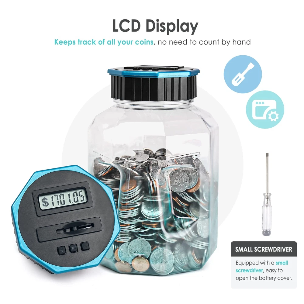 Designed For All US Coins: X-Large capacity up to 2.4L, digital counting money jar can storage 2000+ coins. Piggy bank for adults/kids, accepts all US coins and is powered by 2 AAA batteries(Not Included). Great coin bank money counting jar for adults kids with saving goals. Keeps Track of Savings: Digital piggy bank can automatically distinguish and calculate coins of all sizes with unique identification technology. Displayed amount adjustable with +&- buttons when you unscrew the lid and put the coins directly in the counting coin jar. Know The Amount At Any Time: Coin counter bank money counting jar with legible LCD screen allows you to see the amount of coins quickly and exactly. The digital coin counter with thickened PET material, much more sturdy than glass/ceramic piggy bank. Great Gift For All Ages: The Kids piggy bank is a nice gift for kids with savings goals. Would be a nice gift for a young person learning about the value of and how to save money. Coin savings bank, also a great addition for adults to manage change and away from the coin mess. FUN WAY TO SAVE CHANGE: Smart and active piggy bank. Very cool and nice, come and get this value coin money bank. You may amazed at how simple yet smart this product is. Get this saving jar, you can also get a small screwdriver which is needed. piggy bank with fun.