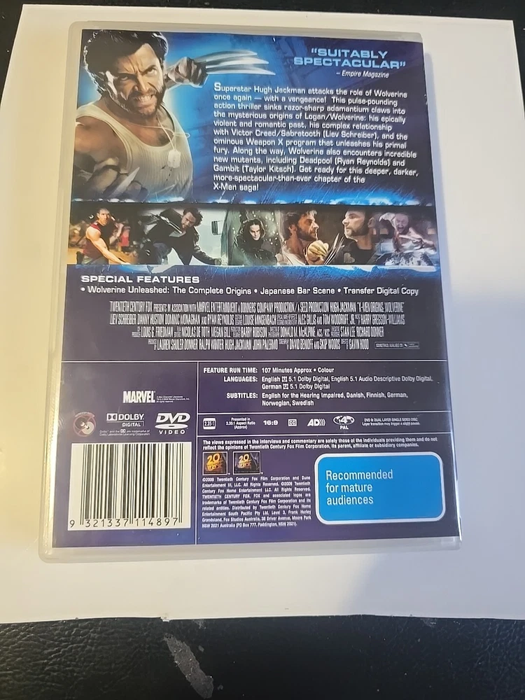 X-Men Origins: Wolverine DVD starring Hugh Jackman, Liev Schreiber, and Ryan Reynolds is a thrilling action-packed film set in the X-Men universe. Directed by Gavin Hood, this sci-fi fantasy movie is a must-watch for fans of the franchise. Released in 2009 by 20th Century Fox, this DVD is Region Code 4 (AU, NZ, Latin America) and features an M rating for mature audiences. Perfect for a movie night at home, this DVD is a great addition to any collection for those who enjoy action and adventure.