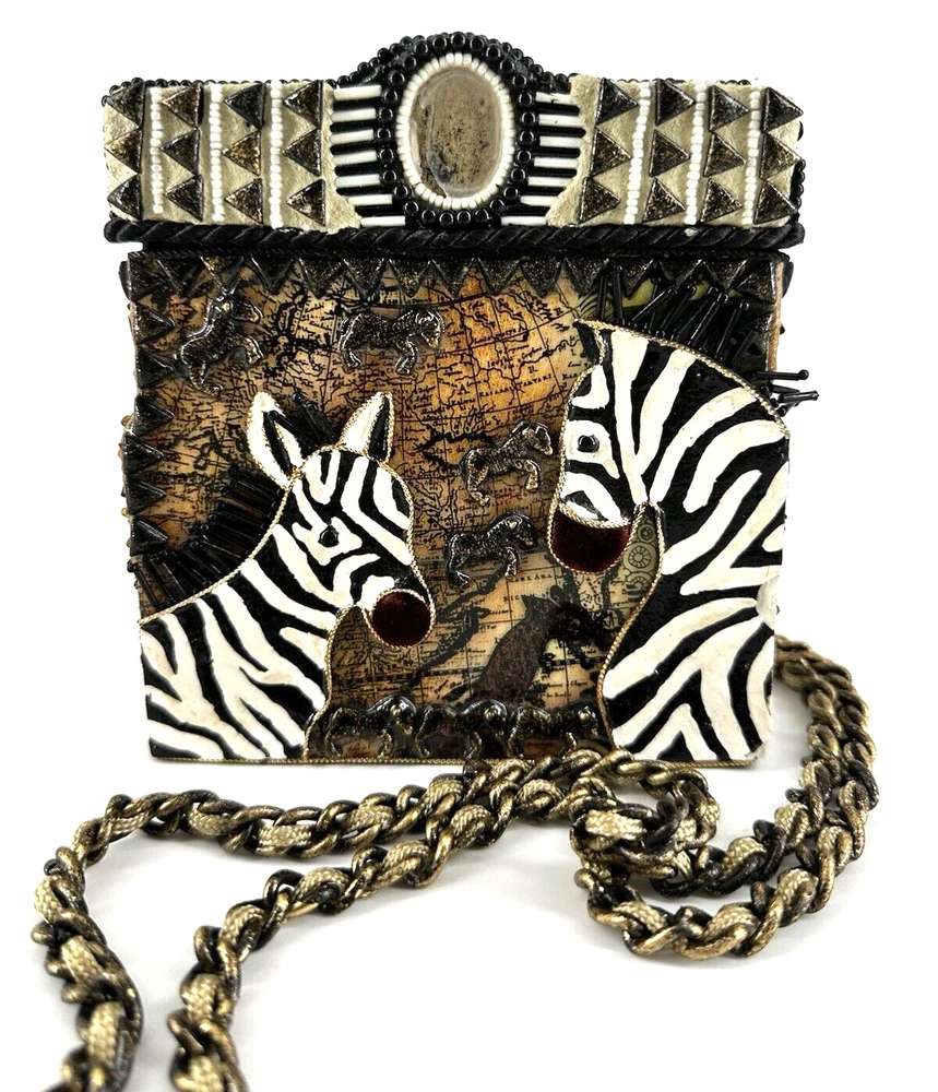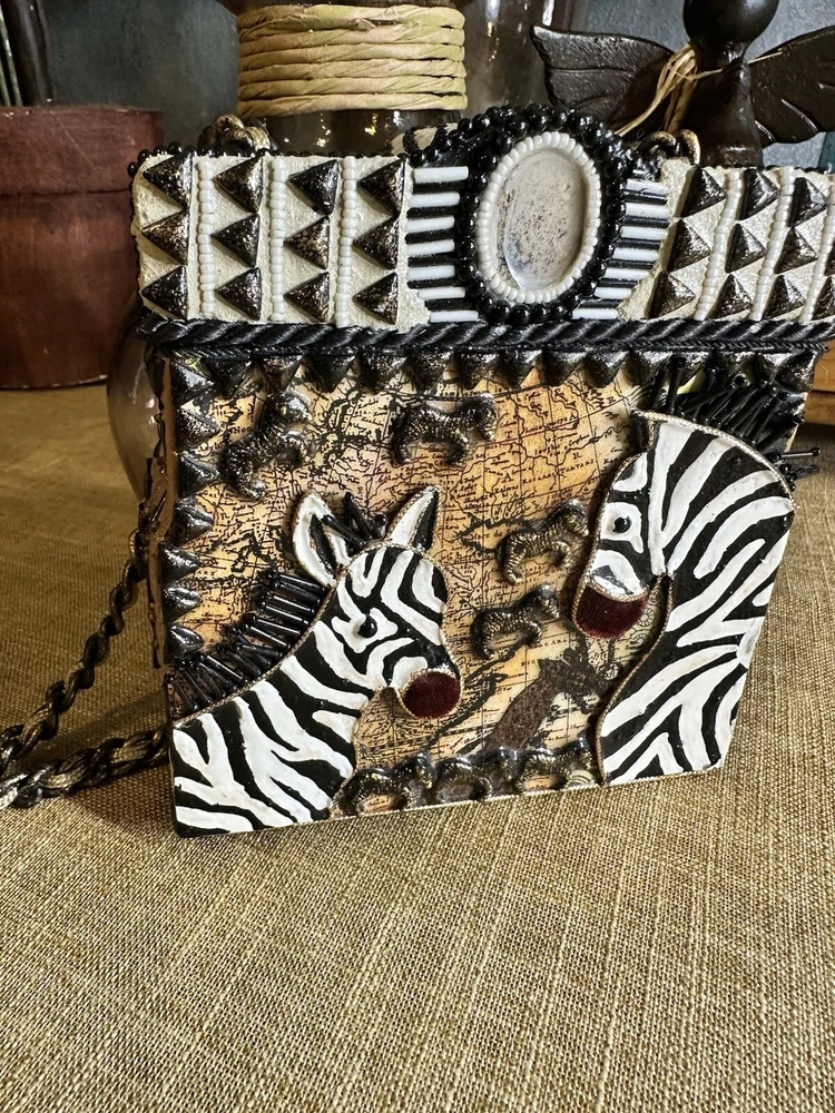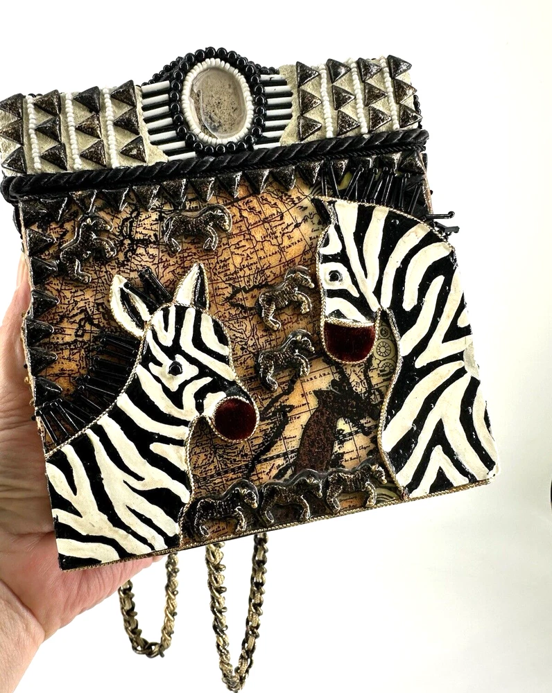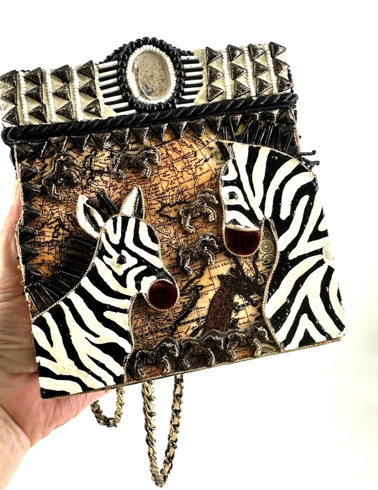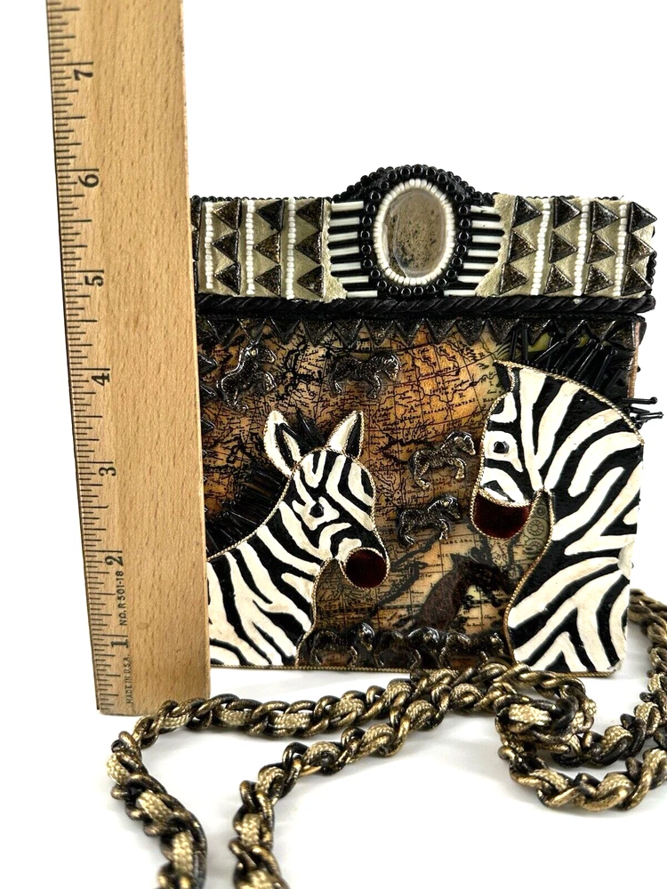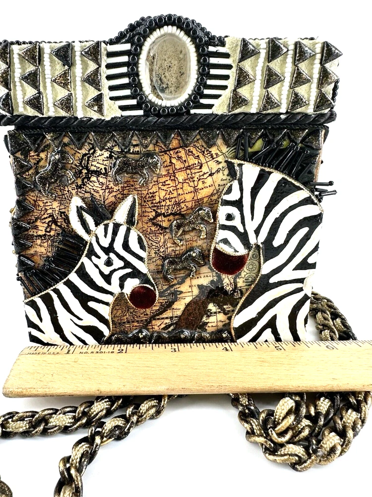 XRARE piece! SEE VIDEO to appreciate the design and beauty of this rare piece. This is a rare and limited edition Mary Frances crossbody purse with a zebra pattern in black and white. Small zebras are in the pattern with a map that is within the tan/brown portion -- very unique and intricate. Jewels throughout. The top lifts open to reveal a small interior lined with black wood. The bag measures 6 inches in height, 3 inches in width, and 6 inches in depth, with a 24 inch metal crossbody strap in black. It is suitable for travel, parties, casual and formal occasions, workwear, and business. The bag features a chain strap, cross-body strap, and is handmade in France. Absolutely a one-of-a-kind! Made in France. This is a vintage piece and is in fantastic vintage condition. Center circle looks as if there may/may not of had an embellishment. Embellishments of beads are gorgeous and very detailed. You have great taste if you have stumbled onto this Xrare piece of Mary Frances. You will receive the Mary Frances purse within the pictures. The other items you may see in the photos are items that will be listed in my Ebay Shop either this week or next week. YouBeYou LLC So, you are getting a sneak peak of what is coming up! :) If you have any questions even after you have purchased the item --- I am here for you to answer any questions that you may have! I strive to work diligently with every buyer to ensure they are a satisfied buyer, so please contact me anytime. This is a pre-owned item and I take great care to accurately describe the item but please see the pictures for full details. While we do our best to list every item in detail, these are vintage and pre-owned items, and some flaws are to be expected. Please see all photos/ video as they are a large part of the description of our items. Items come from a smoke-free environment. Each item is described in accurate detail with multiple measurements and various photos at different angles front and back, side to side, top and bottom. I have additional similar items that I have yet to list that you may be interested in. Feel free to follow my store ( YouBeYou LLC ) to see those when posted. Please see all photos/ video as they are a large part of the description of our items. I strive to make every purchase a pleasant experience. Please feel confidence in you purchase that I'll make every effort to correct any issues that may arise. If used, there are always some signs of wear -- well, because it is used, vintage, or antique. Most items are used -- Each item is inspected for quality. It is very important to us that you have a happy Ebay experience! Thank you for supporting a small business like ours! (Note: pictures may include measurements, and some have a video.)