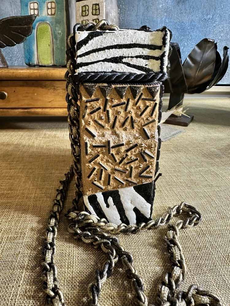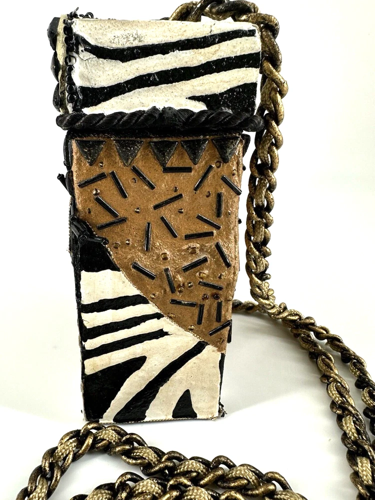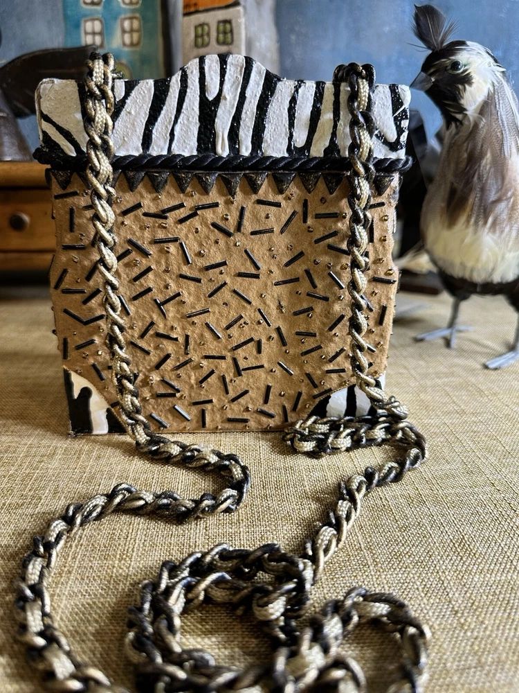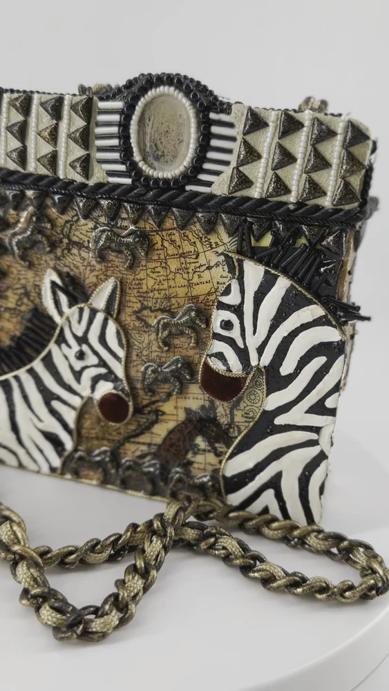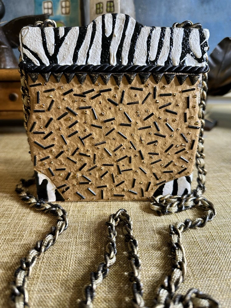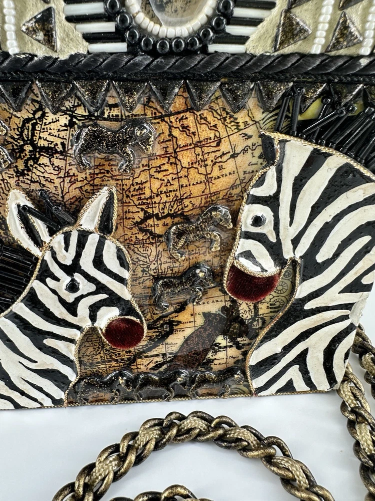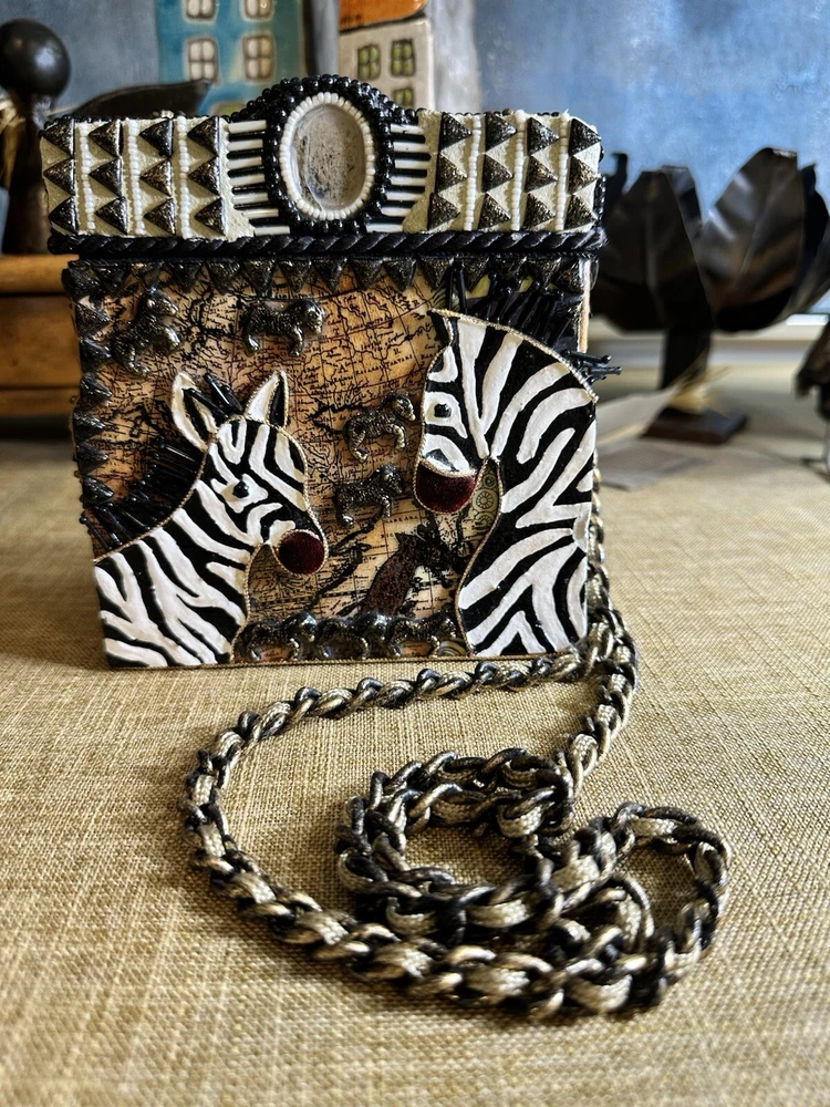 XRARE piece! SEE VIDEO to appreciate the design and beauty of this rare piece. This is a rare and limited edition Mary Frances crossbody purse with a zebra pattern in black and white. Small zebras are in the pattern with a map that is within the tan/brown portion -- very unique and intricate. Jewels throughout. The top lifts open to reveal a small interior lined with black wood. The bag measures 6 inches in height, 3 inches in width, and 6 inches in depth, with a 24 inch metal crossbody strap in black. It is suitable for travel, parties, casual and formal occasions, workwear, and business. The bag features a chain strap, cross-body strap, and is handmade in France. Absolutely a one-of-a-kind! Made in France. This is a vintage piece and is in fantastic vintage condition. Center circle looks as if there may/may not of had an embellishment. Embellishments of beads are gorgeous and very detailed. You have great taste if you have stumbled onto this Xrare piece of Mary Frances. You will receive the Mary Frances purse within the pictures. The other items you may see in the photos are items that will be listed in my Ebay Shop either this week or next week. YouBeYou LLC So, you are getting a sneak peak of what is coming up! :) If you have any questions even after you have purchased the item --- I am here for you to answer any questions that you may have! I strive to work diligently with every buyer to ensure they are a satisfied buyer, so please contact me anytime. This is a pre-owned item and I take great care to accurately describe the item but please see the pictures for full details. While we do our best to list every item in detail, these are vintage and pre-owned items, and some flaws are to be expected. Please see all photos/ video as they are a large part of the description of our items. Items come from a smoke-free environment. Each item is described in accurate detail with multiple measurements and various photos at different angles front and back, side to side, top and bottom. I have additional similar items that I have yet to list that you may be interested in. Feel free to follow my store ( YouBeYou LLC ) to see those when posted. Please see all photos/ video as they are a large part of the description of our items. I strive to make every purchase a pleasant experience. Please feel confidence in you purchase that I'll make every effort to correct any issues that may arise. If used, there are always some signs of wear -- well, because it is used, vintage, or antique. Most items are used -- Each item is inspected for quality. It is very important to us that you have a happy Ebay experience! Thank you for supporting a small business like ours! (Note: pictures may include measurements, and some have a video.)
