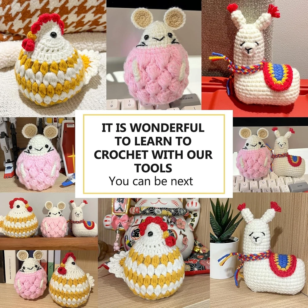 XSEINO Crochet Kit for Beginners - Small, Doll Alpaca Product Details Brand: XSEINO Age Range (Description): Adult Color: Crochet Doll Kit Alpaca Theme: Animal Cartoon Character: Chicken Item dimensions L x W x H: 7.87 x 5.51 x 2.36 inches Material: Cotton Seasons: All Seasons Item Weight: 0.27 Kilograms Size: Small Number of Pieces: 3 Model Name: Crochet Art Craft Kit Type: Crochet Kit Manufacturer: XSEINO Item Weight: 9.6 ounces Product Dimensions: 7.87 x 5.51 x 2.36 inches Item Dimensions LxWxH: 7.87 x 5.51 x 2.36 inches Country of Origin: China Brand: XSEINO Age Range (Description): Adult Color: Crochet Doll Kit Alpaca Theme: Animal Cartoon Character: Chicken 【CROCHET KIT FOR COMPLETE BEGINNERS】: XSEINO crochet kit is perfect for those new to crocheting. The kit can be used to make three cute animals, a alpaca, a hamster, and a chubby chicken. For this, we have equipped the crochet tool kit with yarn, filling cotton, yarn snipper, eyes, crochet hook, counter, yarn needles, stitch markers, key rings, as well as detailed pattern manual and basic crochet manual,and step-by-step video tutorials, with it you can easy to start your first crochet project. 【STEP-BY-STEP VIDEO TUTORIALS】: A series of easy-to-follow video tutorials are tailored for complete beginners, guiding them from start to finish.We have prepared detailed video tutorials and basic crochet methods video tutorials for each small animal,With clear instructions and demonstrations, even those who have never crocheted before can dive into their first project(For beginners, it is recommended to set slow playback when watching videos to facilitate your learning). 【PREMIUM CROCHET YARN】:We have specially prepared crochet yarn that is very suitable for beginners. It is very soft and easy for beginners to use, and will not fork during the weaving process, making it an ideal choice for beginners. Each crochet yarn ensures sufficient length, so you don't have to worry about insufficient yarn. 【GREAT GIFT CROCHET SET】: Our crochet kit makes the perfect present for anyone who loves to crochet or wants to learn a new skill. Suitable for all ages, it's a great gift for birthdays, Mother's Day, Valentine's Day, Thanksgiving, Christmas, or any occasion.If you have any questions, please feel free to contact us and we will be available 24 hours online to resolve your issues.