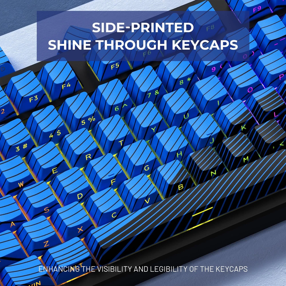 【New Topograph Style】Irresistible color clash! black and blue, as a classic and versatile color, the combination of black and blue can bring visual impact without losing elegance and vitality. Elevate your keyboard with premium 5-sided dye-sub PBT keycaps. 【Dye Sublimation Keycaps】Elevate your keyboard with premium 5-sided dye-sub PBT keycaps, advanced dye-sublimation technology allows the color to penetrate into the keycaps,making the color on the keycaps very clear and won’t fade for long time using. 【Double Shot Shine Through Keycaps】To ensure the integrity and legends visibility of your keyboard's exterior topograph, we use side-printed shine through legends. The double shot technique that is two layers(transparent inner layer and outer layer)are molded into one without printing so the keycaps legends never falls off and light tramsmission. 【PBT Material Keycaps】PBT or Polybutylene Terephthalate, It is matte with a slight frosted texture,that are resistant to wear,high temperature, and solvents. ensure a premium look and better user experience. 【Cherry Profile Keycap Set】The keyboard keycaps designed with the classic cherry profile, it is ergonomic,you won't get tired even if you use it for a long time. 【Ultra-Wide Compatibility】This 136 keys keycap set consists of 104 standard keys and 32 supplementary keys compatible with ASIN/ISO layout 60%/65%/70%/75%/80%100% mechanical keyboards with MX-stem(cross-shaped) swithes. 【What You Get】Including 136 keycaps and a keycap puller, packed in blister and carton. Not include keyboard, the keyboard is just for demo not included.