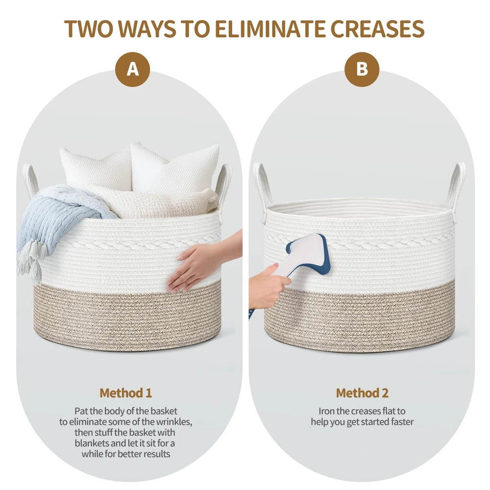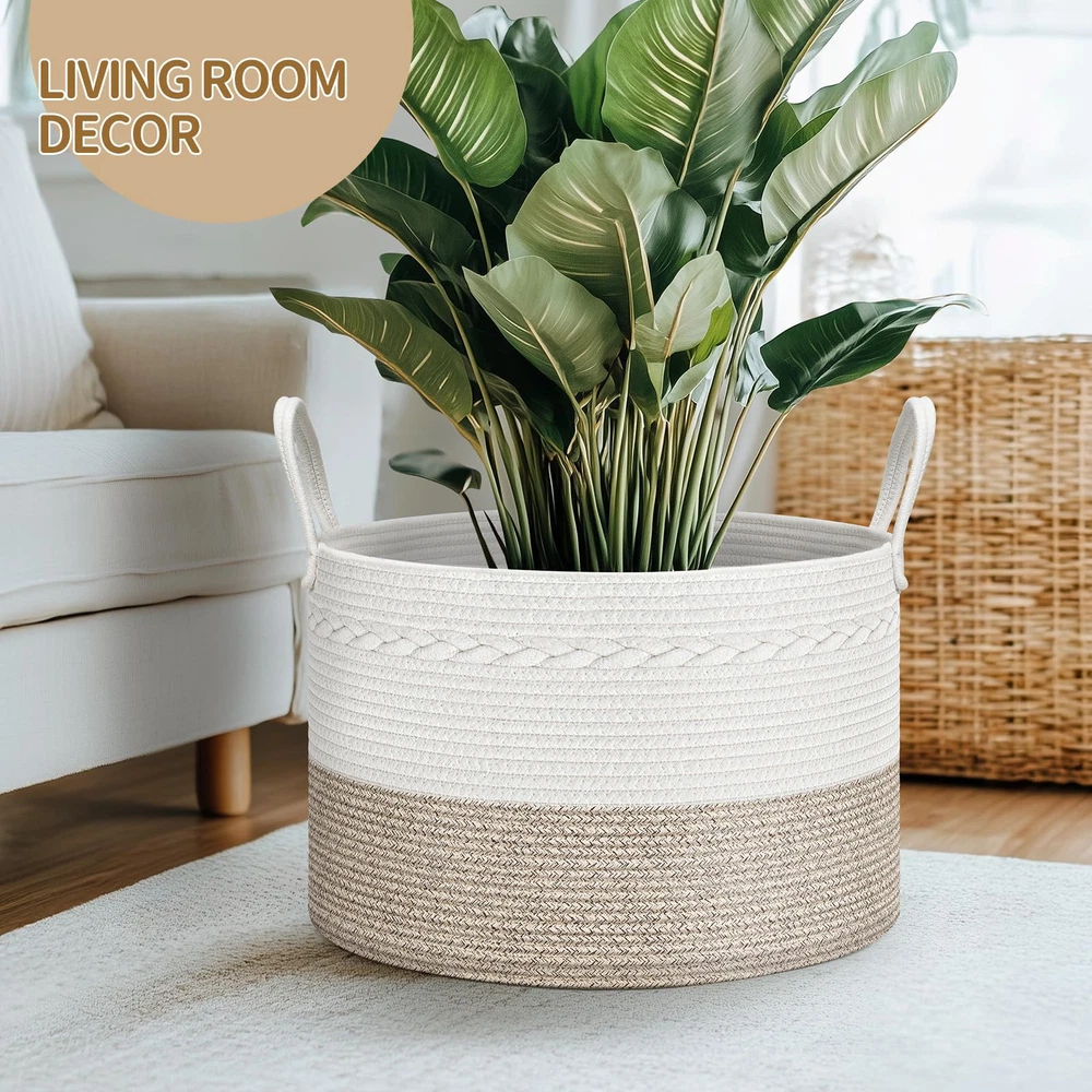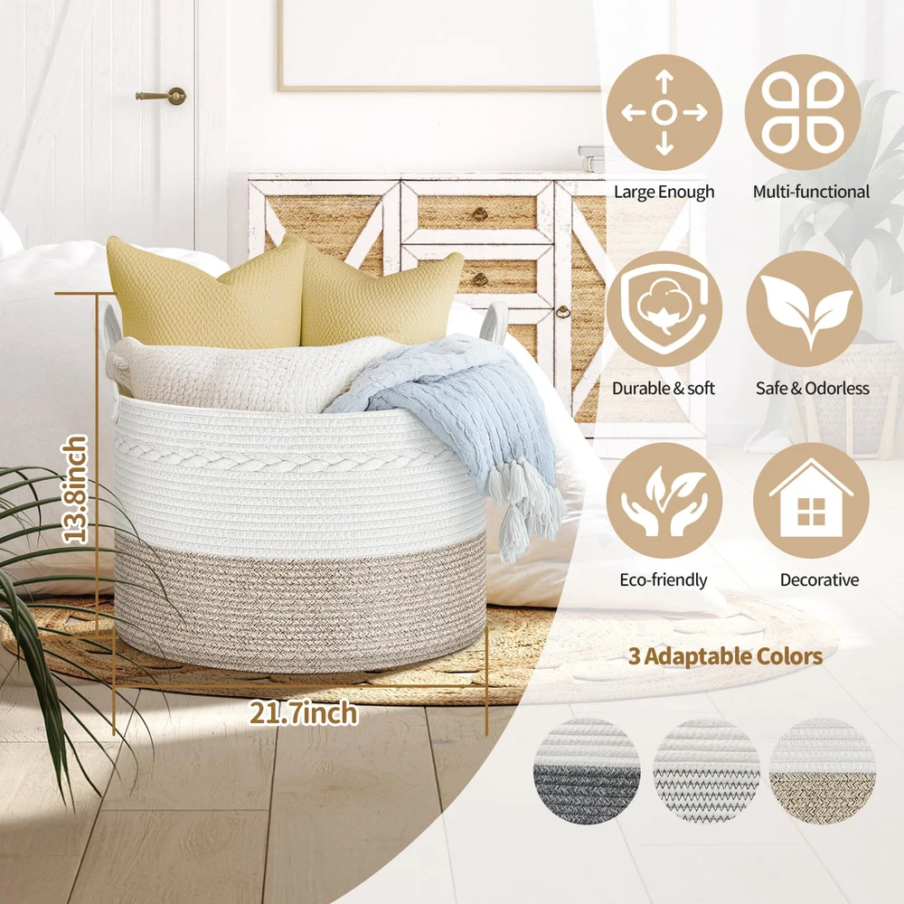 Extra Large Basket: The 21.7" x 21.7" x 13.8" storage bin has a large 83L capacity, and can easily hold bulky items. If you want to keep your home organized, our round basket can help you eliminate clutter and ensure your living space is spacious and tidy High Quality and Safety: The clothes hamper is made of cotton rope, free, no nasty odor, safe for storing intimate clothes. This blanket organizer has no sharp edges, making it safe for and pets. You can use it in your home with confidence Sturdy and Portable: The wicker basket is soft yet sturdy. It is tightly woven with thick threads and reinforced with stitching for long-term use. The handle is comfortable and easy to hold, can support heavy objects, and can also be dragged easily Multi-Purpose Decorative Basket: Towel baskets are the key to a functional and tidy home. They can help you organize blankets, toys, pillows and other sundries, easily eliminating clutter. Modern neutral design that goes well with any type of home decor Portable: The nursery basket is folded for shipping. It will turn back to its elegant shape quickly by filling it with blankets, and ironing is great idea to smooth the creases. Also, you can fold it into a flat shape for easy storage when not in use