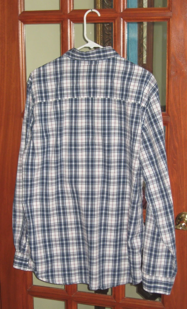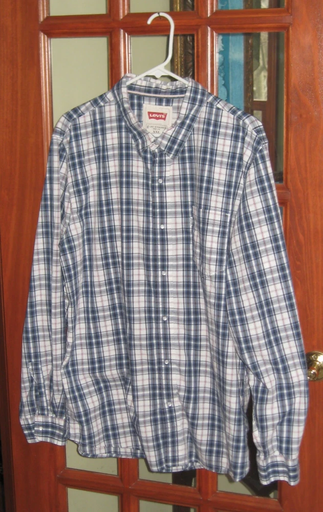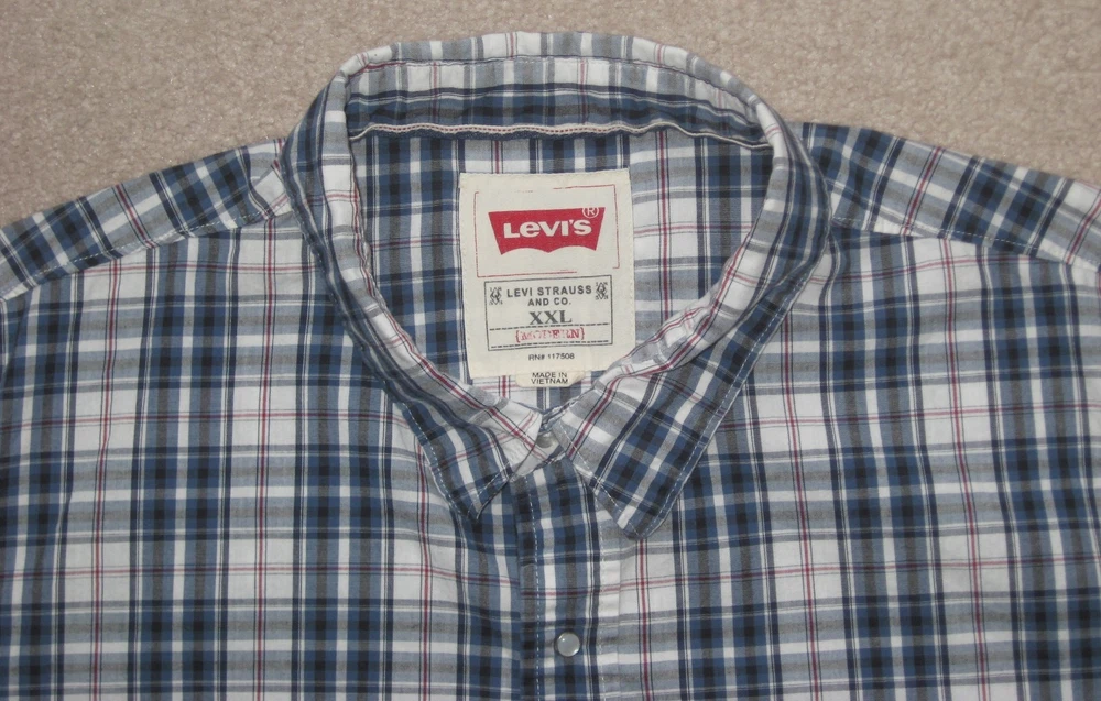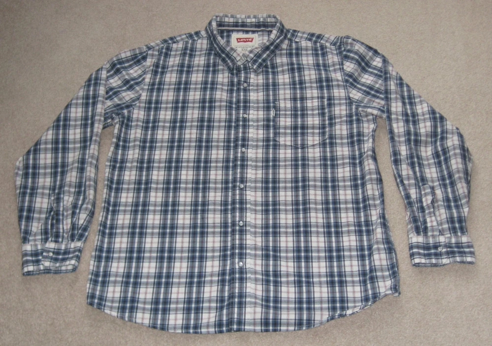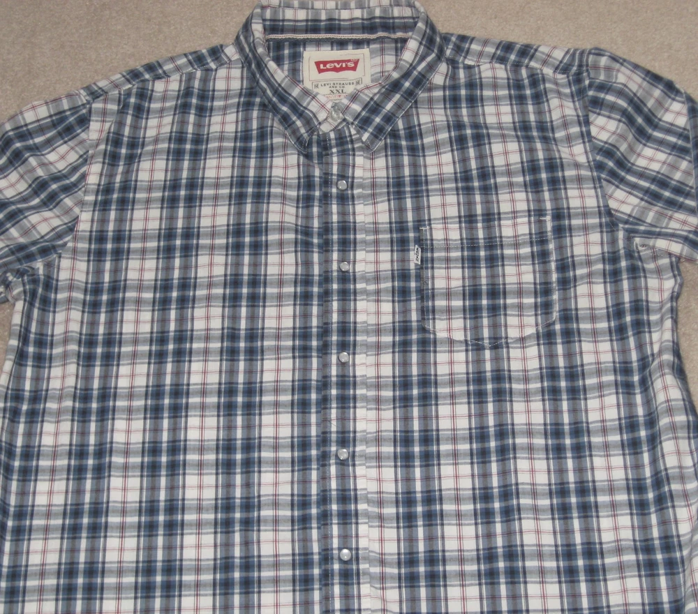 Levi Modern Western Style Shirt Mens XXL Plaid Pattern Long Sleeve Attention Western Shirt Fans and Cowboy Collectors all over the world! This would make the ultimate gift for a Father , Son , Brother , Uncle or even yourself! You are about to buy ONE Levi Modern Western Style Shirt Men's XXL Long Sleeve with Plaid Pattern from a USA Seller. This is a pre-owned used article of clothing that does show signs of use and wear. Also all sizes are approximate and should be measured against an existing article of clothing you already own. Please see the included photos for additional details. Let’s see some detailed information on this Shirt: Type : Men's Snap Up Long Sleeve Western Style Shirt Size : Men's Extra Extra Large XXL Label : Levi Strauss / Levi's Modern Pattern : Western with Plaid Tartan Pattern Material : 100% Cotton Color : White Base with Blue and Red Plaid Pattern Dimensions : Top to Bottom = 33 " , Width at Armpits = 24 ", Sleeve Length = 26.5 " Manufactured in : Vietnam Additional Features : Front Left Snap Up Breast or Chest Pocket , Shirt Tails , Snap Up Front Closure and Single Snap Cuffs , 1 Extra Button Condition : Pre-Owned Used from a Smoke Free and Pet Free Home. No visible holes or stains present. WOW! What a terrific Snap Up Levi's Cowboy Western Shirt right here up for grabs! As stated this is a pre-owned used article of clothing that does show signs of age and wear. All dimensions are approximate as well so you should check with an existing article of your own clothing for sizing reference. Please feel free to ask questions, or for any additional pictures. An informed buyer is always a happy buyer. So now that you know what is being offered here, you should not hesitate to BUY IT NOW ! You may never get another chance to grab up this Levi Modern Western Style Men's XXL Shirt Plaid Pattern Long Sleeve Snap Up ! Smoke / Pet Free Home. Terms: Payment to be received within 2 days of listing's close. Buyer to pay choice of weight based shipping and packaging with delivery confirmation or weight based USPS Priority / Flat Rate shipping and packaging with delivery confirmation. International buyers shipping to be calculated based on Country location. Check our other listings for more outstanding Clothing , Shirts and a whole lot more merchandise to combine on shipping! We also have a unique eBay store that features many more one of a kind items! Introducing a Levi's men's shirt with a modern western style. This shirt features a plaid pattern in multi-color, long sleeves, collared neckline, and button closure. The garment care is machine washable and made of 100% cotton material. The shirt is available in XXL size with a regular fit. This shirt is perfect for men who like rockabilly and modern themes. It is a great addition to your casual button-down shirts collection. The shirt is not personalized or modified, and it is not a vintage or handmade item. The shirt is made in Vietnam and belongs to the categories of men's clothing, shirts, and casual button-down shirts.