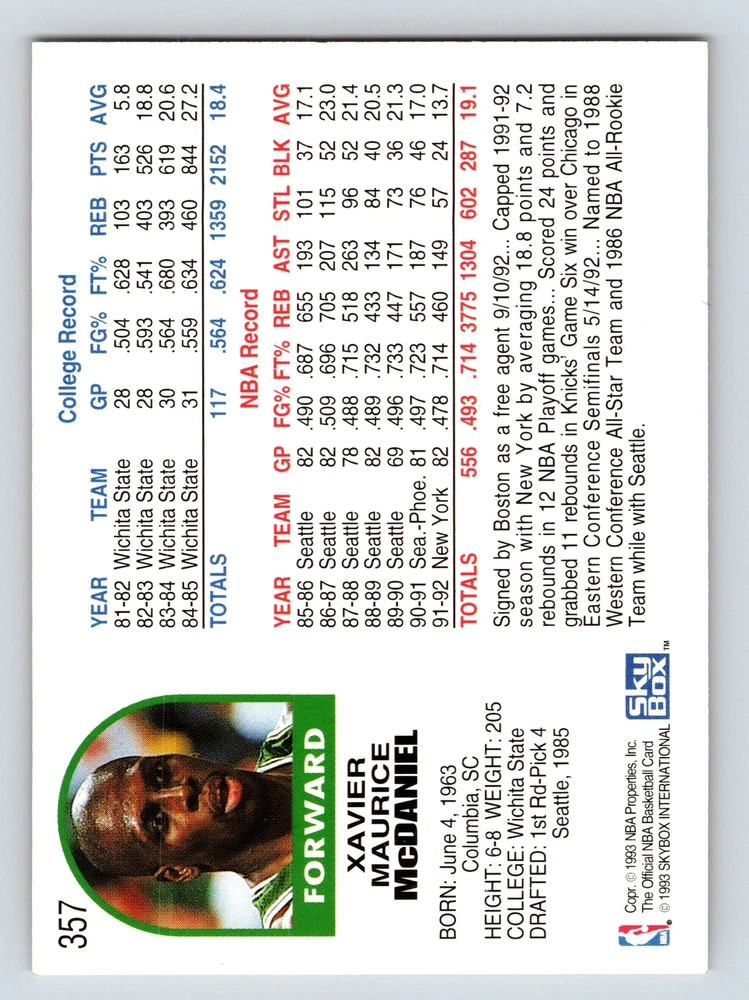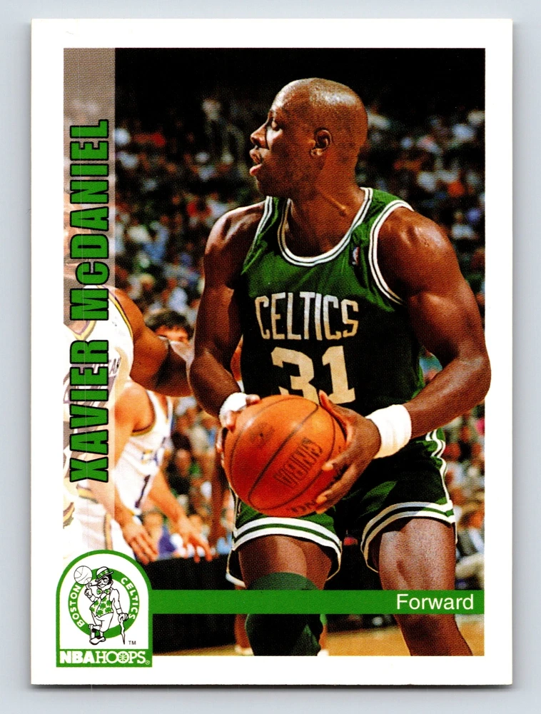 Item Description Title: Xavier McDaniel Forward Boston Celtics NBA Hoops 1992 Card 357 Memorabilia Description: This sports trading card features Xavier McDaniel, renowned for his role as a forward with the Boston Celtics. Part of the 1992 NBA Hoops series, the card is cherished among collectors for its sleek design and detailed player stats. McDaniel, in his Celtics uniform, is captured in action on the court, showcasing his agility and strength. Known for his impressive scoring and rebounding abilities, McDaniel's presence on the team was pivotal during his tenure. The back of the card outlines his career highlights and stats, reflecting his significant contributions to the Celtics and prior achievements with the Seattle SuperSonics and the New York Knicks. Standing at 6'7 and weighing 205 lbs, McDaniel's athletic prowess is apparent. Born on June 4, 1963, in Columbia, SC, he played college basketball at Wichita State, leaving a lasting legacy in the NBA. MRSP: $2.99 Sport: Basketball Player/Athlete: Xavier McDaniel Season: 1992 Manufacturer: NBA Hoops Parallel/Variety: Unknown Set: NBA Hoops 1992 Team: Boston Celtics League: National Basketball Association (NBA) Card Number: 357 Counter: 329 Folder: BASKETBALL1224002