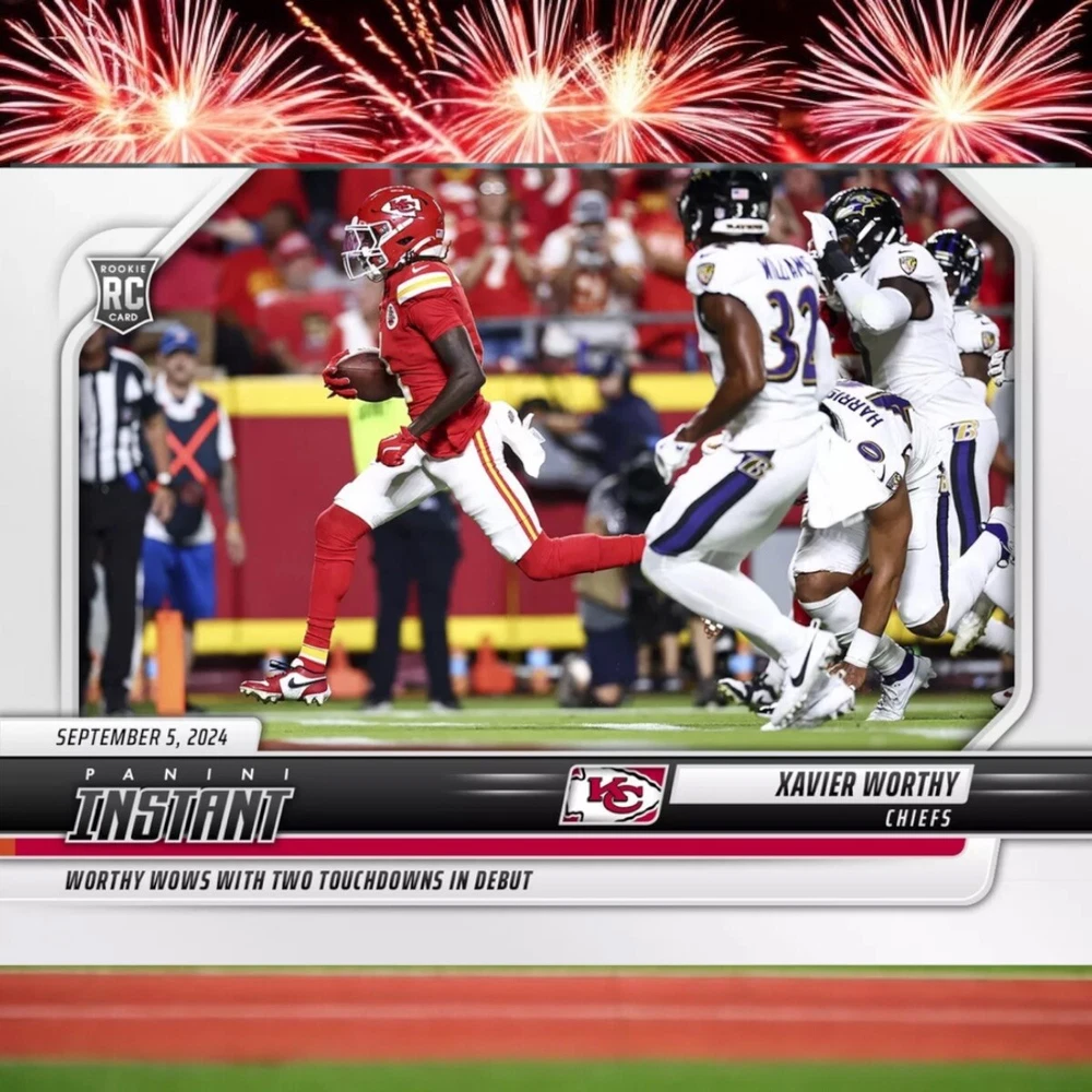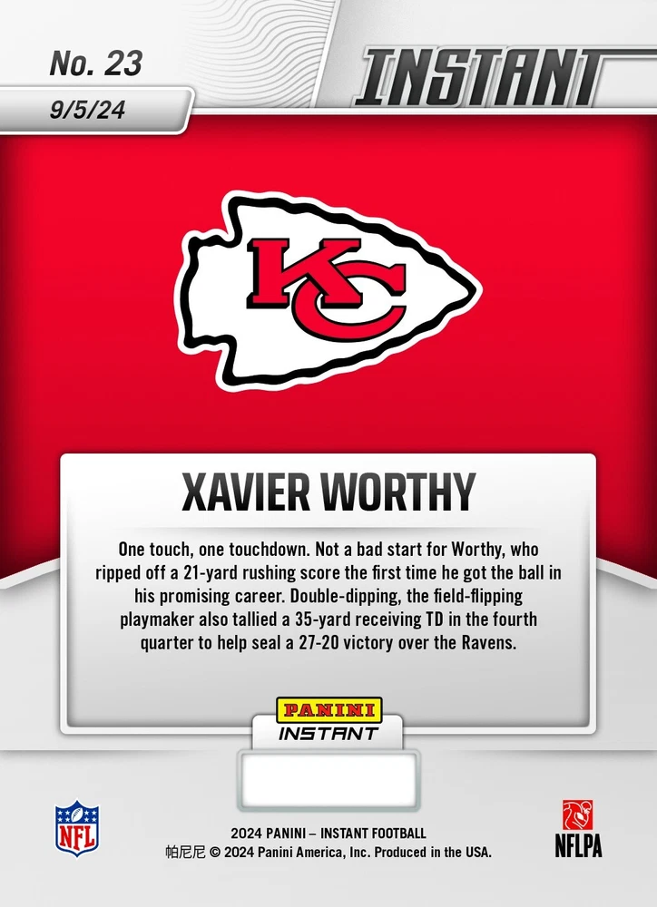 This is a rare opportunity to purchase a 2024 Panini Instant Xavier Worthy #23 RC Rookie Card, featuring the Kansas City Chiefs player. This valuable sports trading card is a must-have for any NFL fan and collector. With its stunning design and top-quality manufacturing by Panini, this card is a true gem. It is a great addition to any collection, especially for those who appreciate rookie cards and support for their favorite team. Don't miss this chance to own a piece of football history.