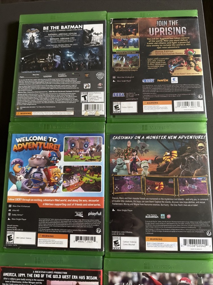 This product is a collection of video games for the Microsoft Xbox One console, including titles such as Batman, Sonic, Super Lucky Tale, Hotel Transylvania 3, Madden 20, and Red Dead and just dance.The games are region coded for NTSC-U/C (US/Canada) consoles, offering a variety of gameplay experiences ranging from action-packed adventures with Batman and Sonic to engaging open-world experiences in Red Dead. With a mix of popular franchises and beloved characters, this collection provides entertainment for a wide range of gaming preferences.